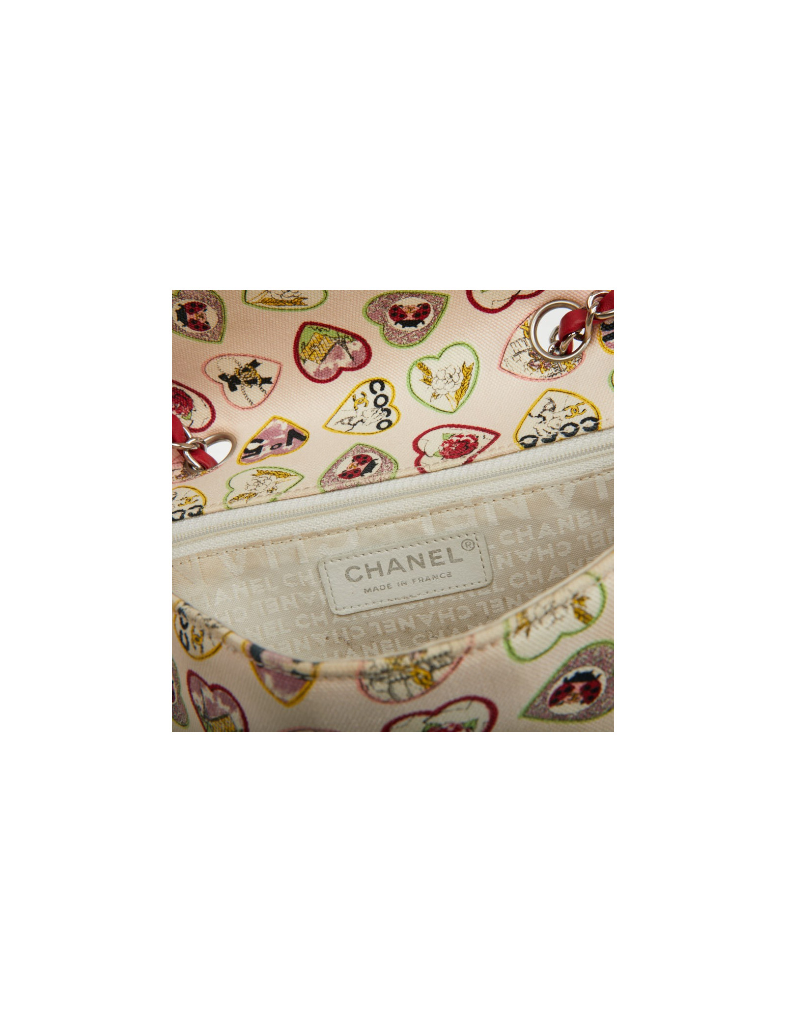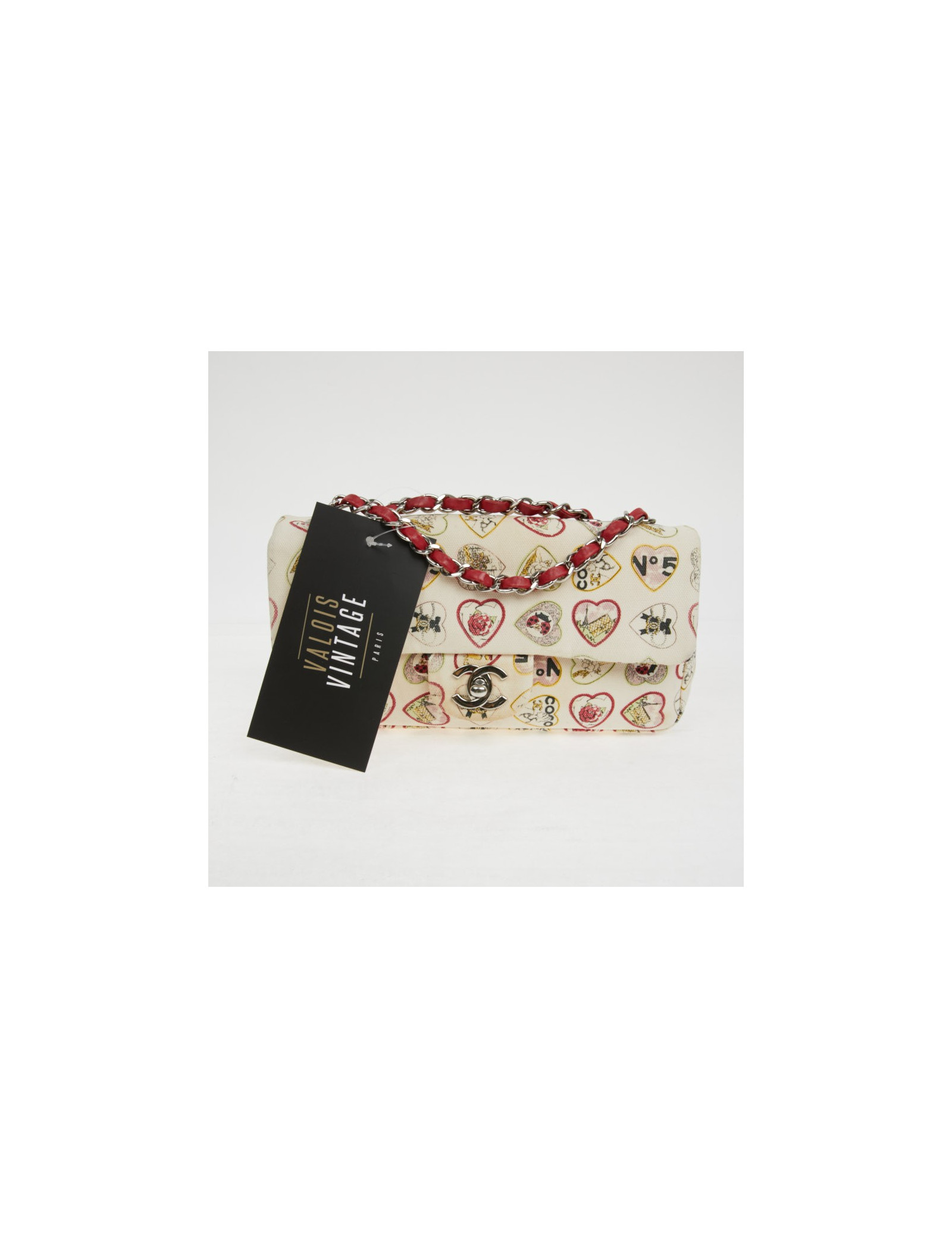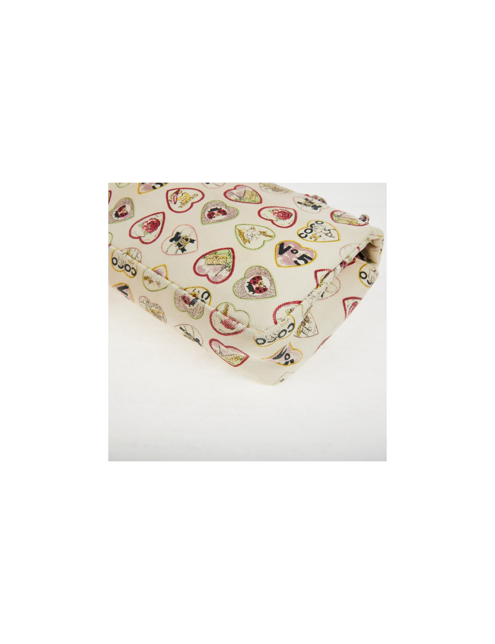 Collector. Ce sac à main est ideal à porter le printemps ou l’été. Il a une taille moyenne. Il est double d’un tissu monogramme beige avec une poche zippee. Il est recouvert de cœurs avec les symboles : camélias, Coco, N 5, coccinelle, timeless, noeud, sautoir, CC, chaussures. La chaîne en métal argent palladié entrelacée de cuir rouge.