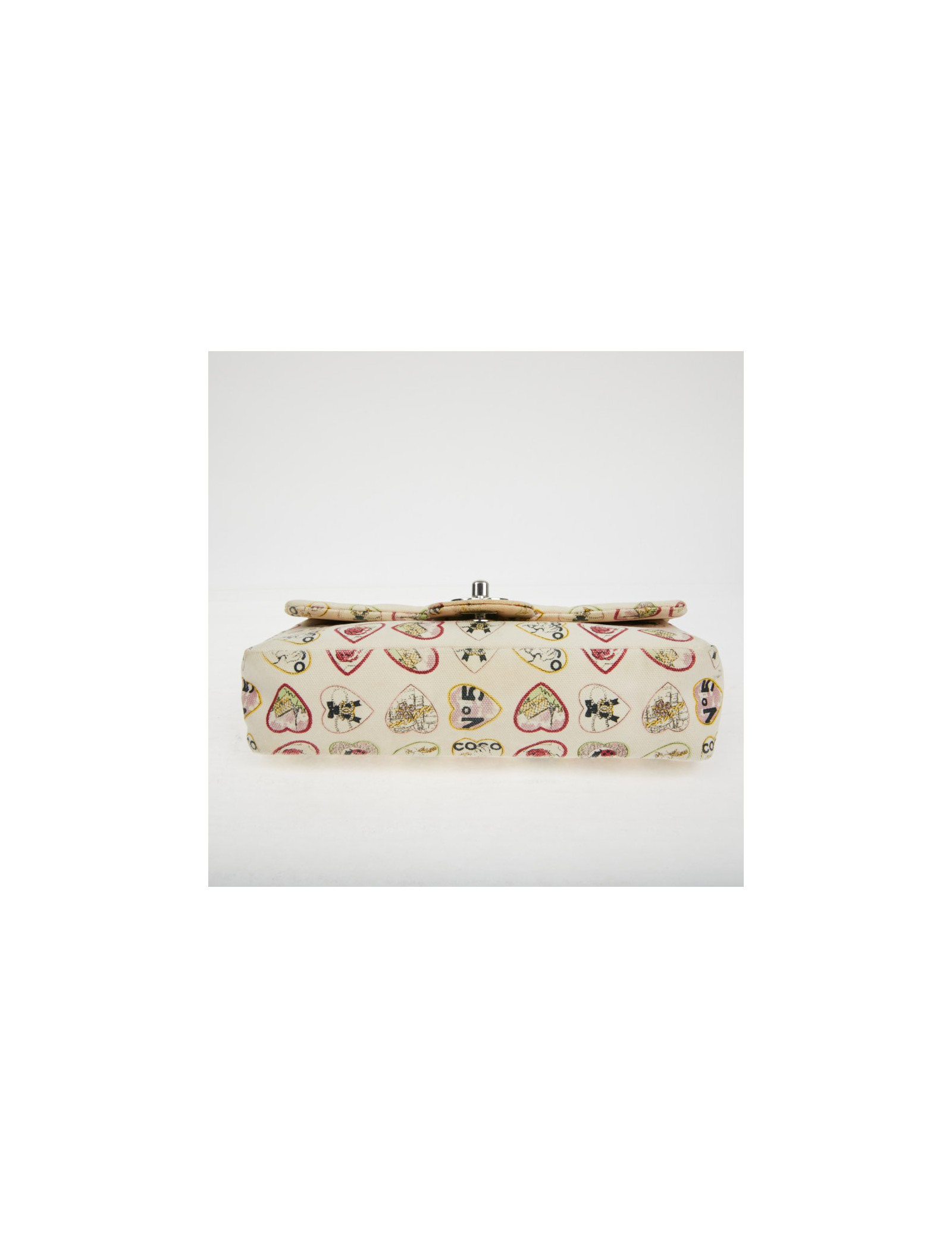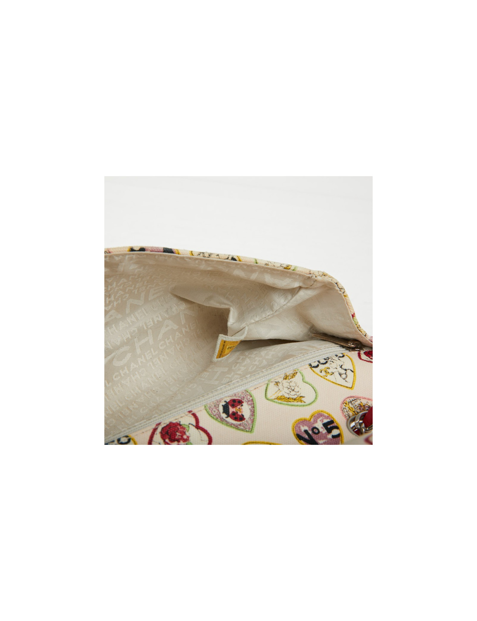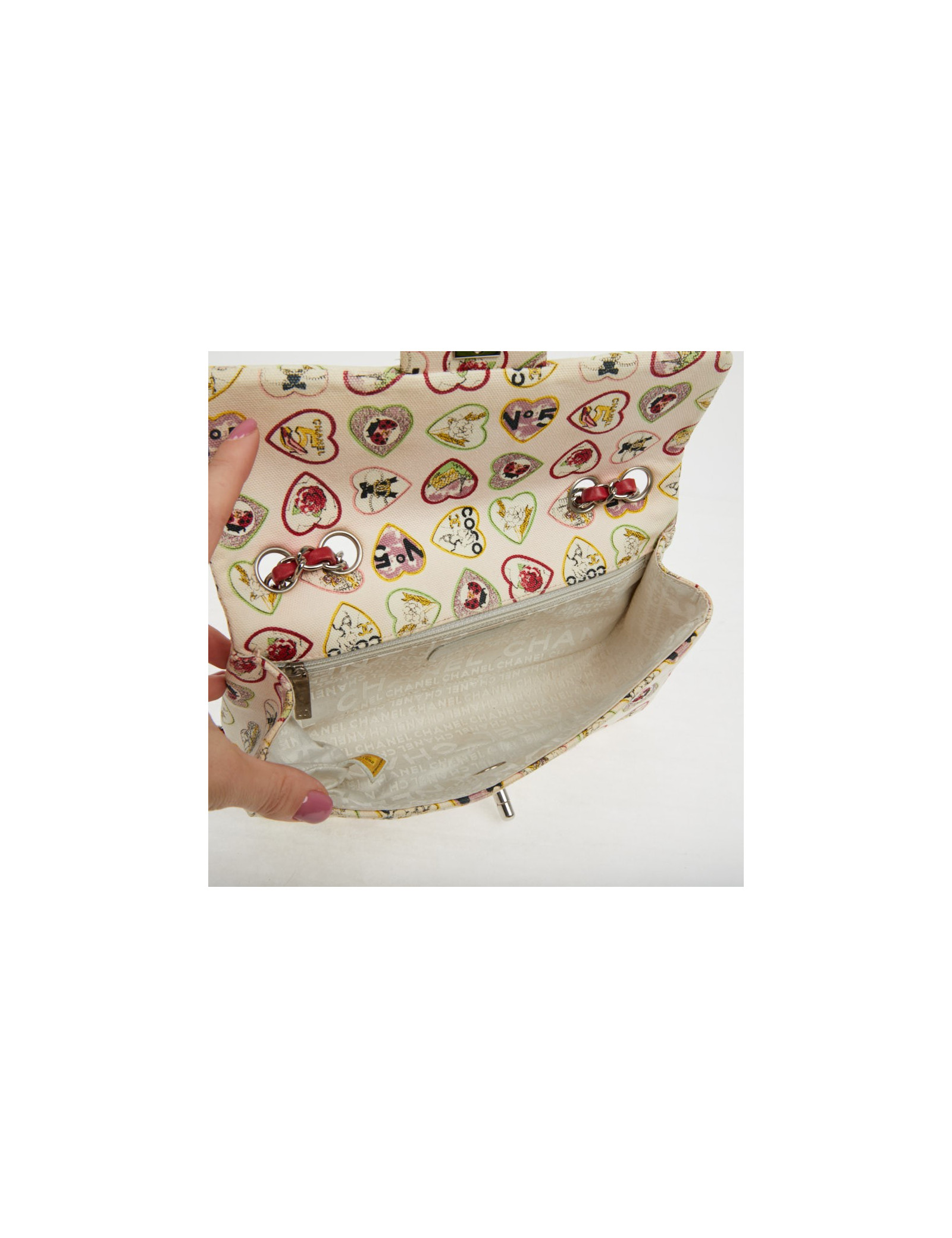 Collector. Ce sac à main est ideal à porter le printemps ou l’été. Il a une taille moyenne. Il est double d’un tissu monogramme beige avec une poche zippee. Il est recouvert de cœurs avec les symboles : camélias, Coco, N 5, coccinelle, timeless, noeud, sautoir, CC, chaussures. La chaîne en métal argent palladié entrelacée de cuir rouge.