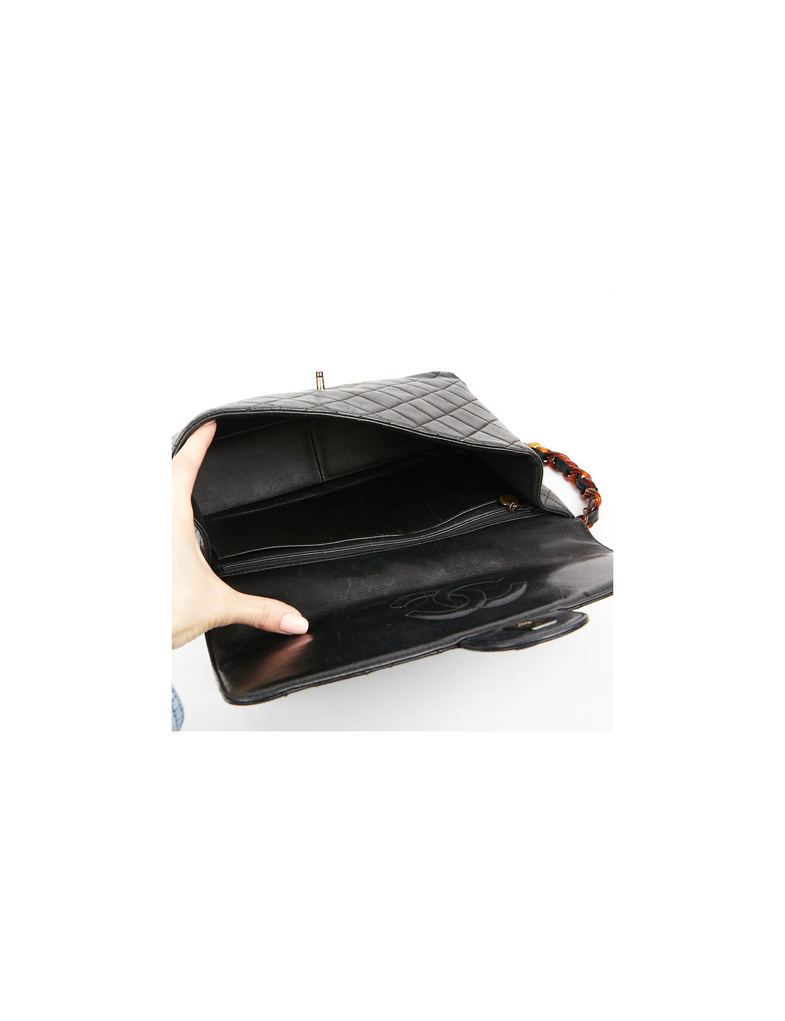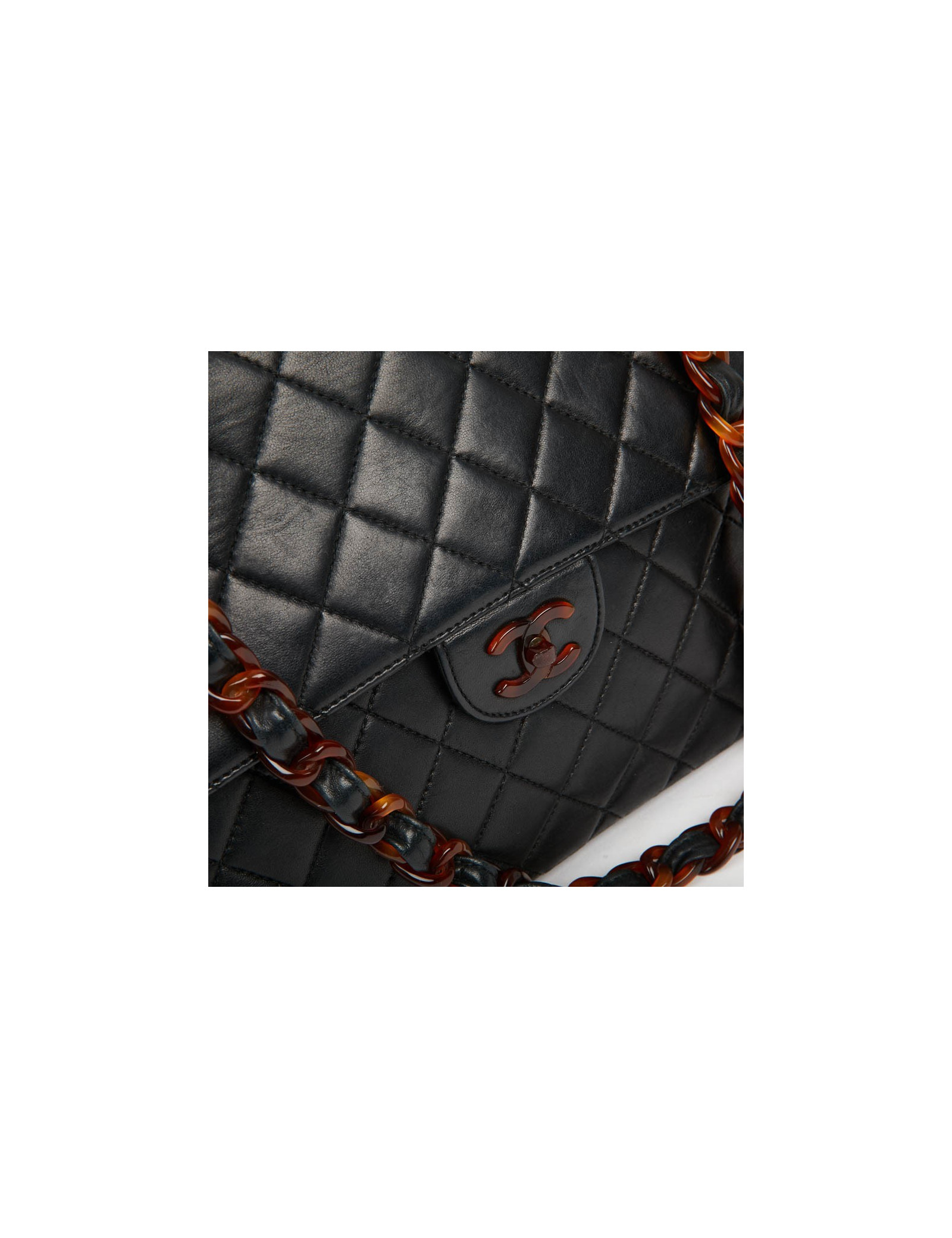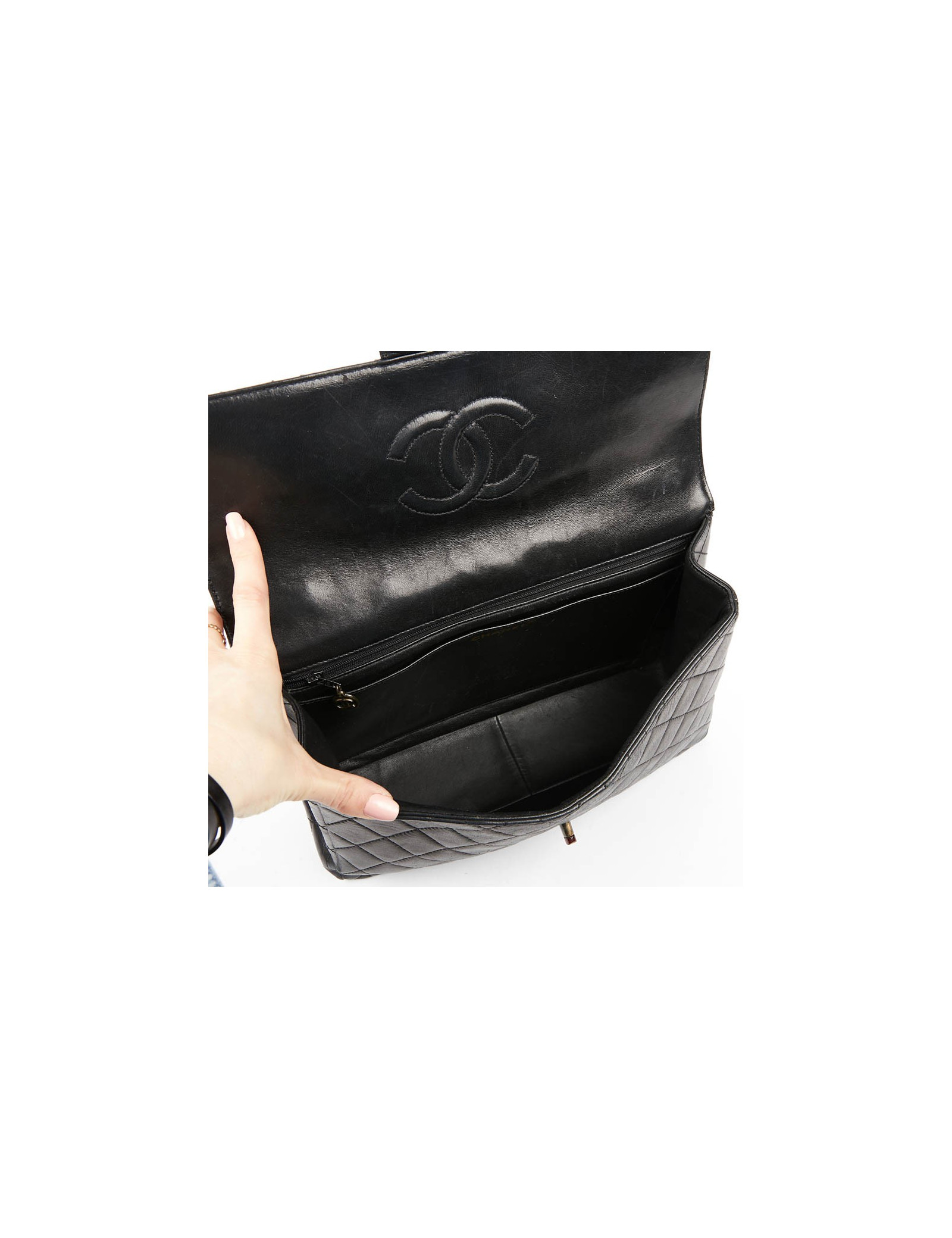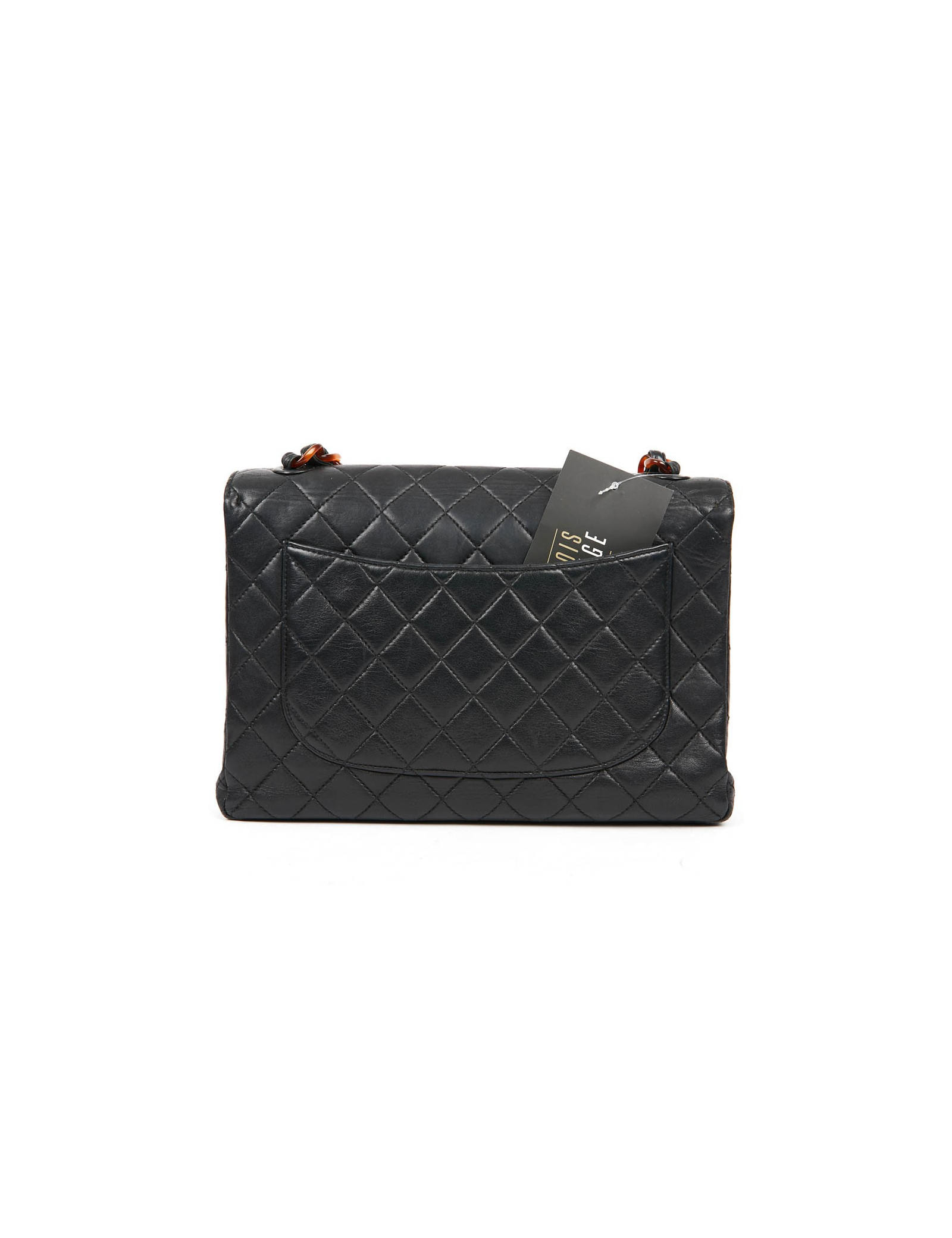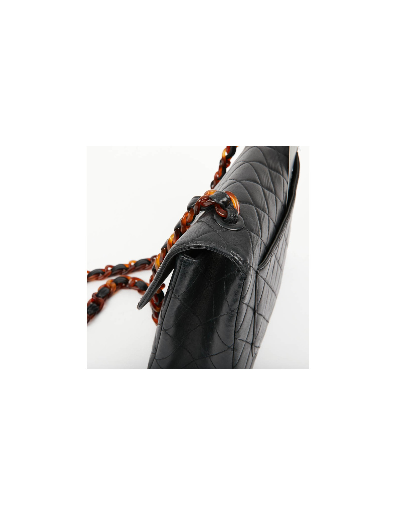 Ce grand sac vintage classique CHANEL, avec sa bandoulière façon écaille, est en cuir lisse noir matelassé. Il peut se porter crossbody.