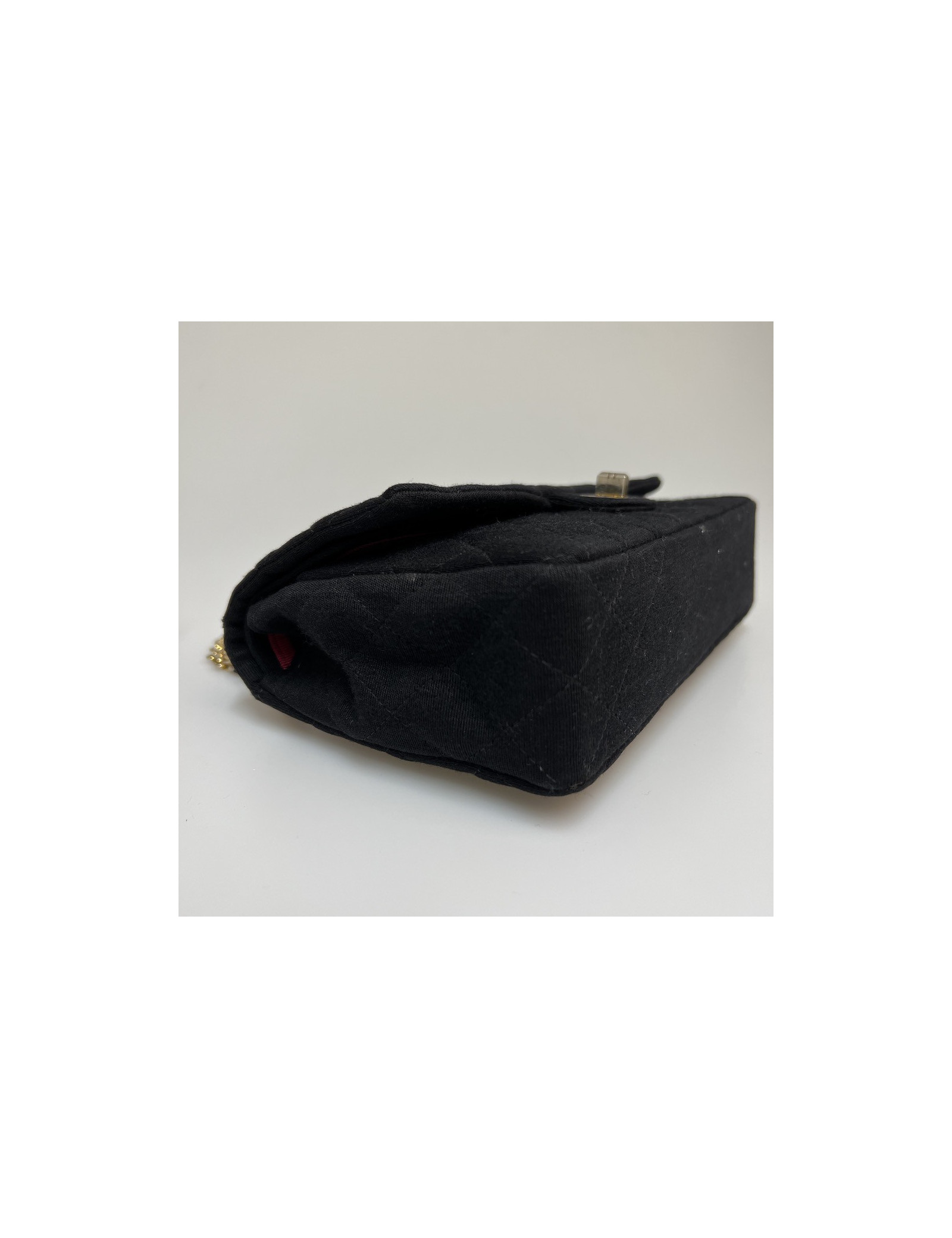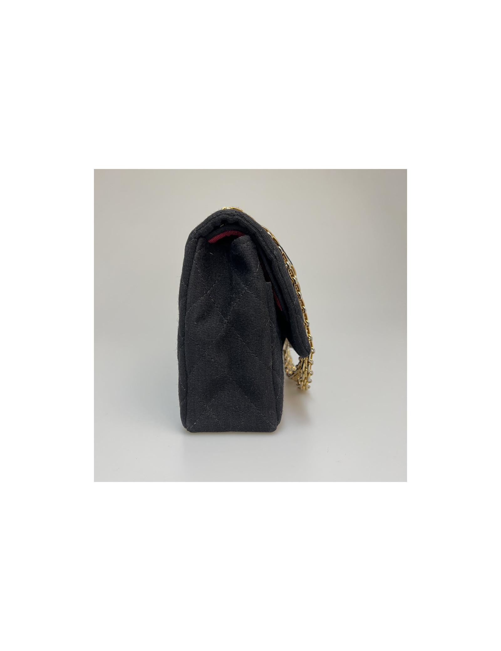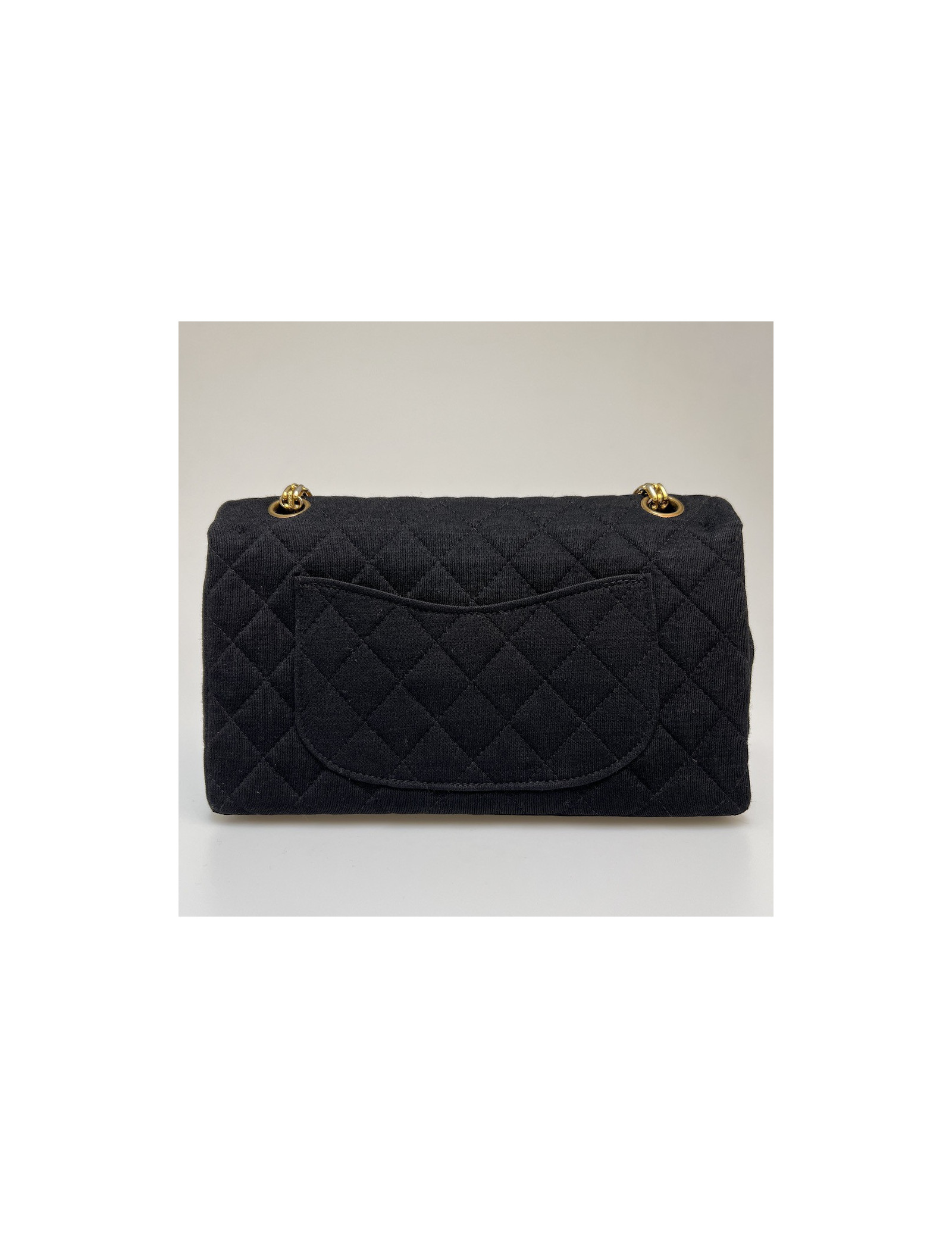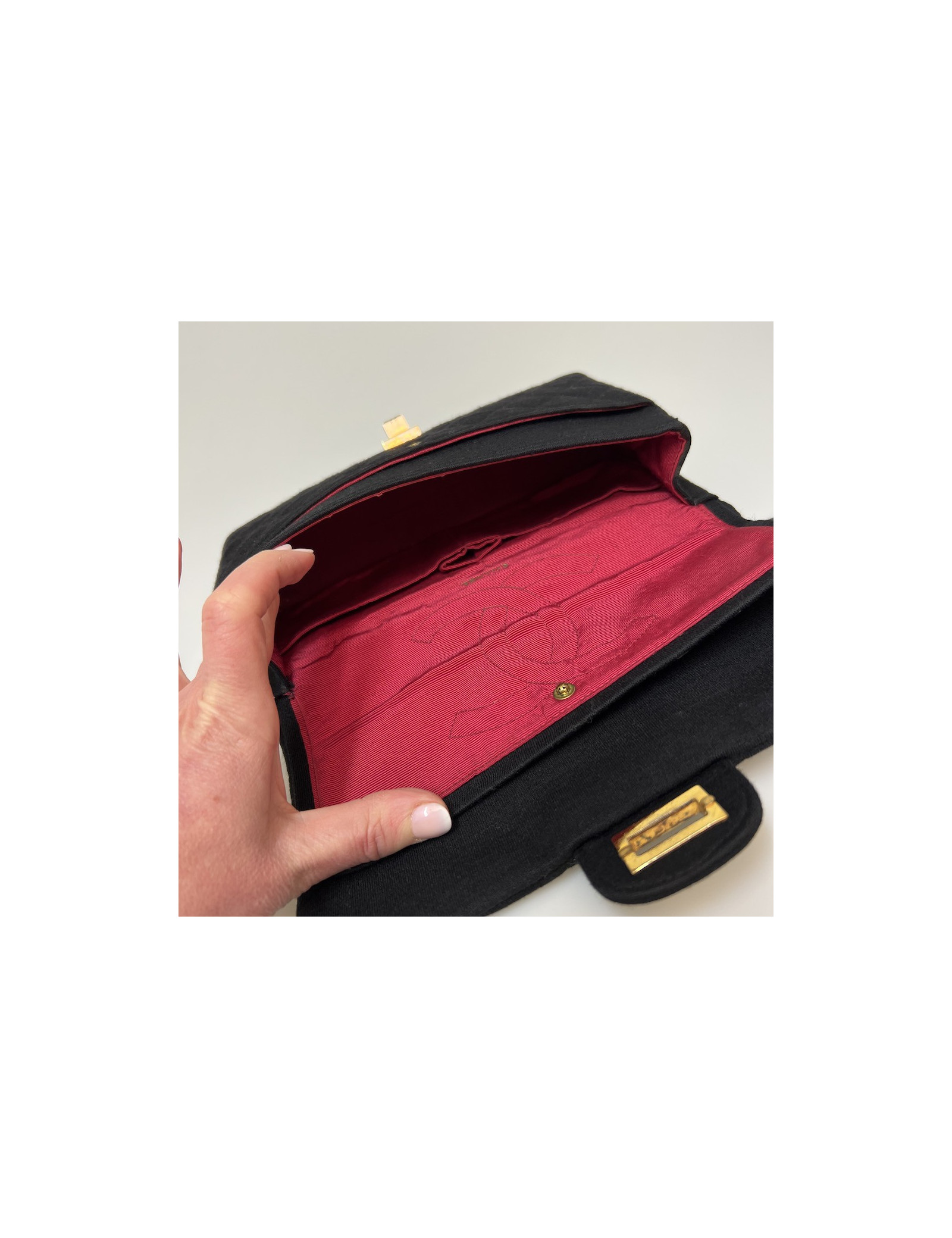 Ce sac vintage CHANEL est en jersey noir. La bijouterie est en métal doré avec des micro-rayures.