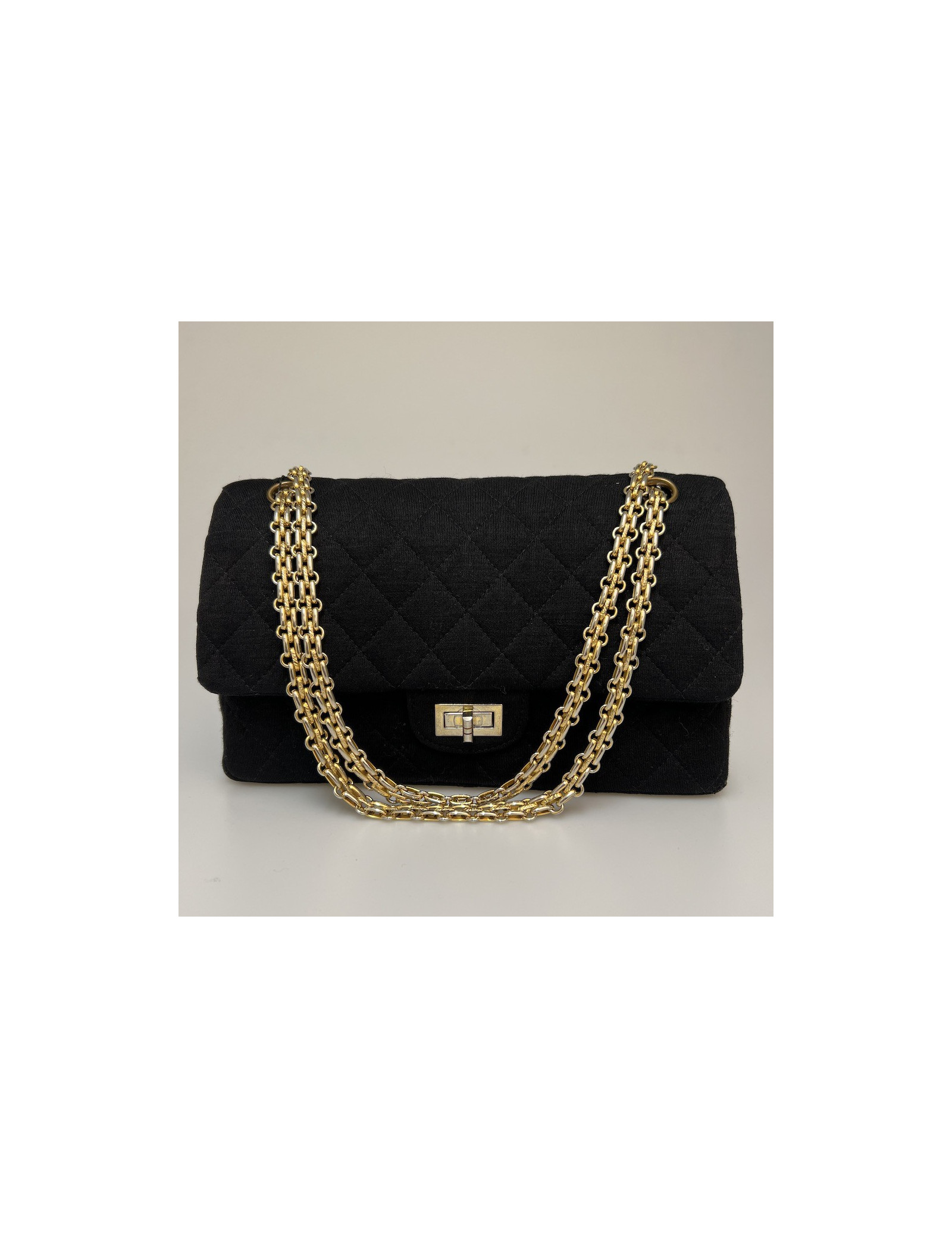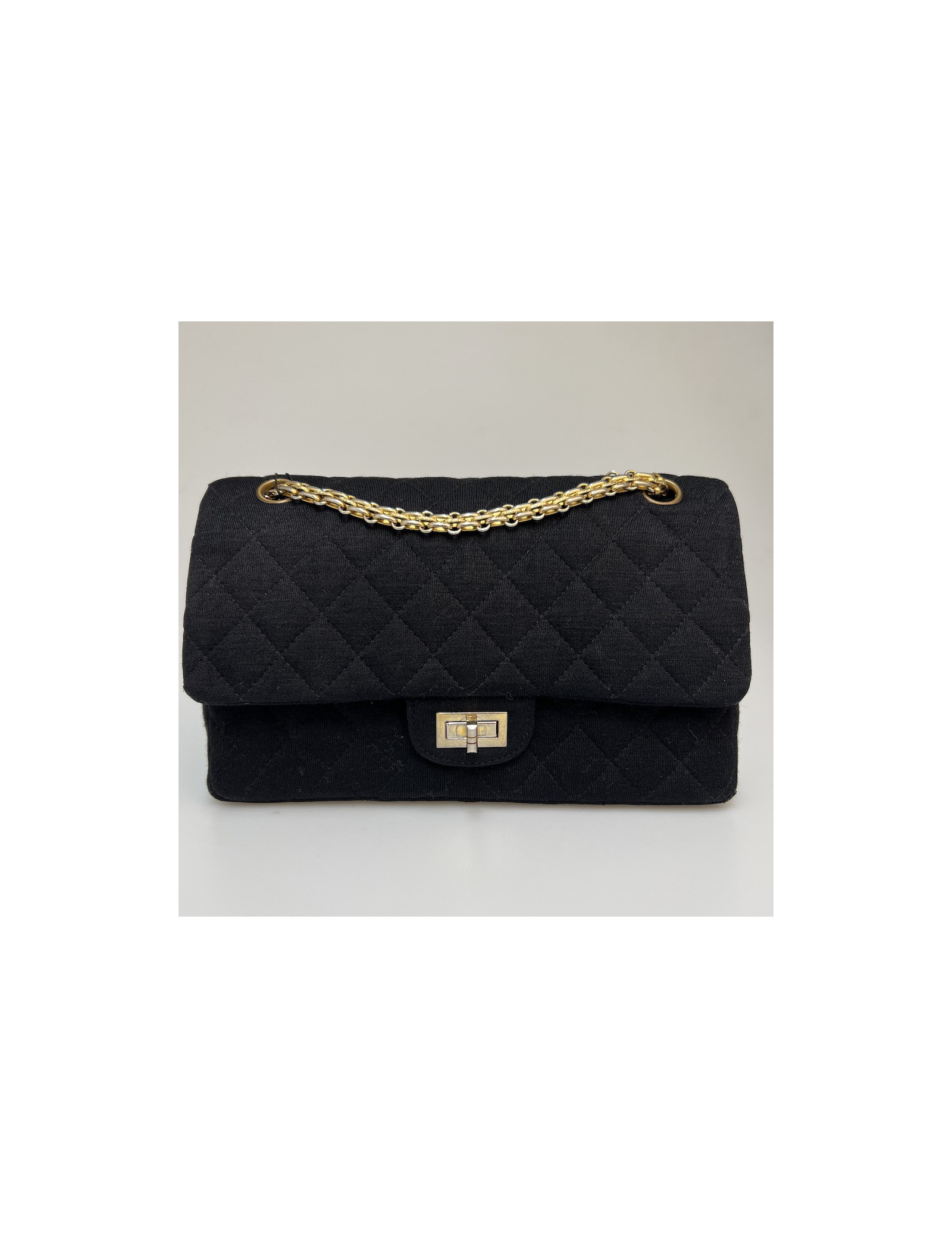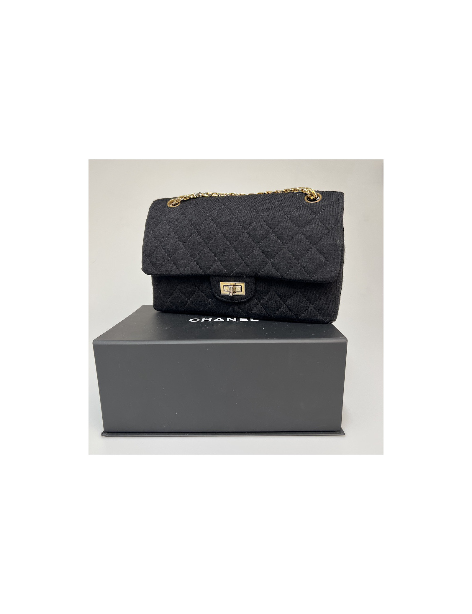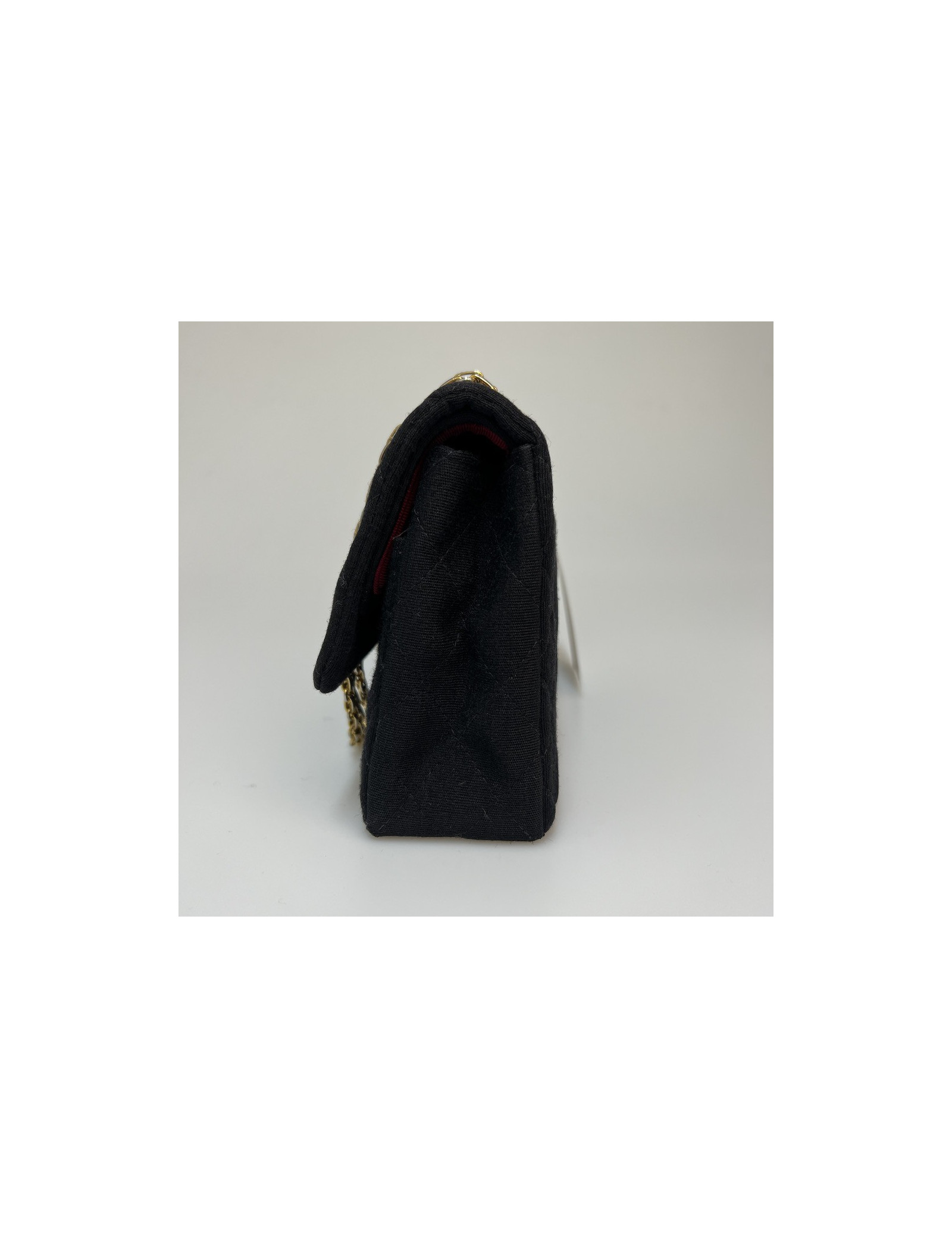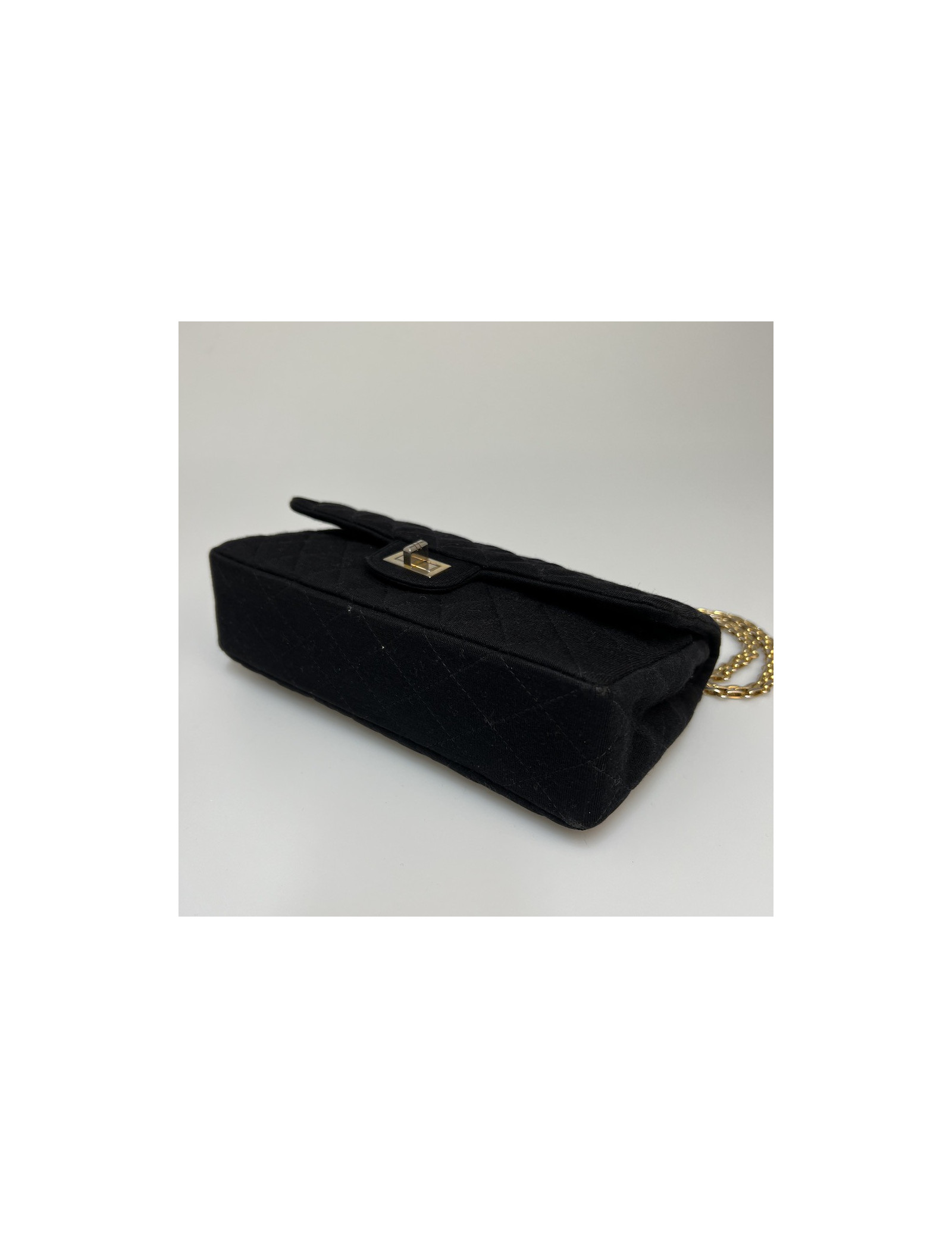 Ce sac vintage CHANEL est en jersey noir. La bijouterie est en métal doré avec des micro-rayures.