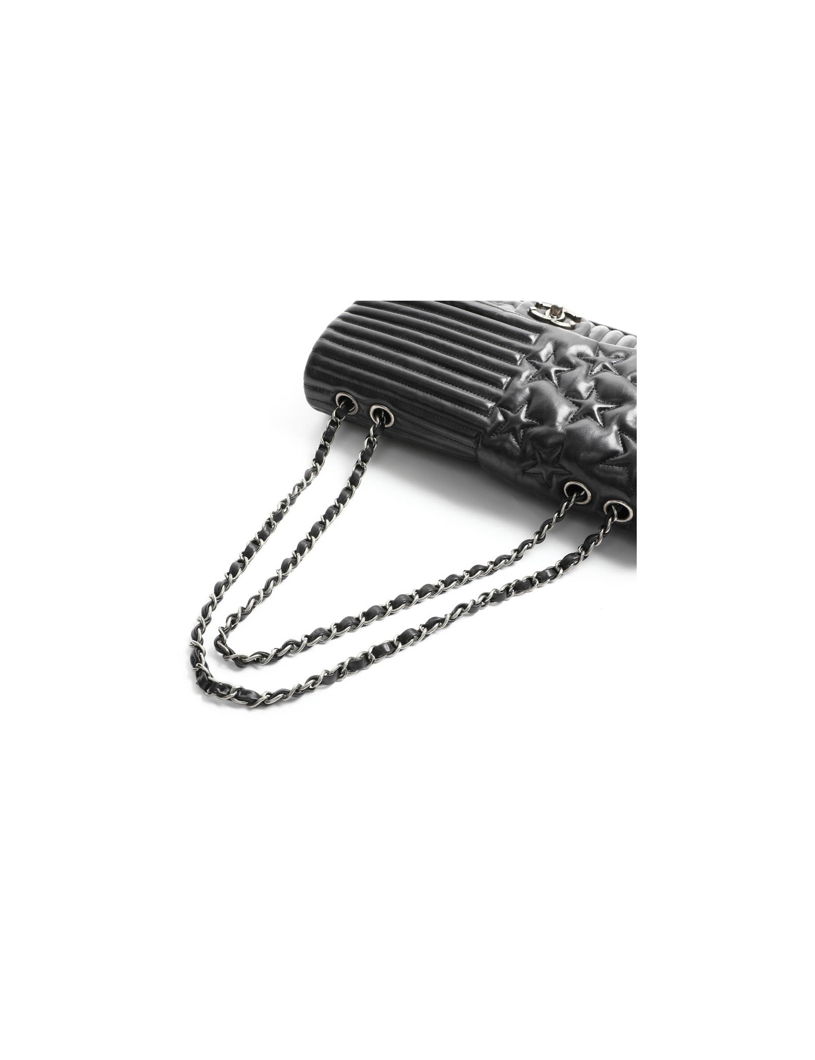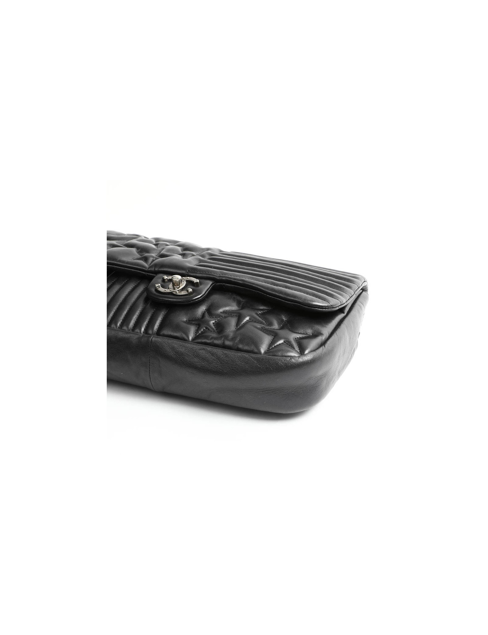Sac Collector du défilé Métiers d'Art "Paris Dallas" Chanel en cuir d'agneau souple lisse noir. La bijouterie et en métal argent vieilli. Le double "C" représente des fers à chevaux cloutés.