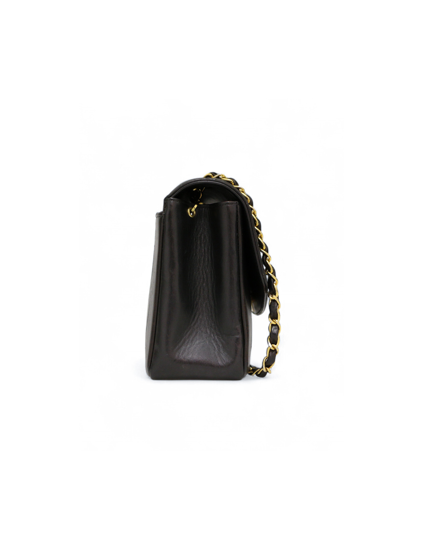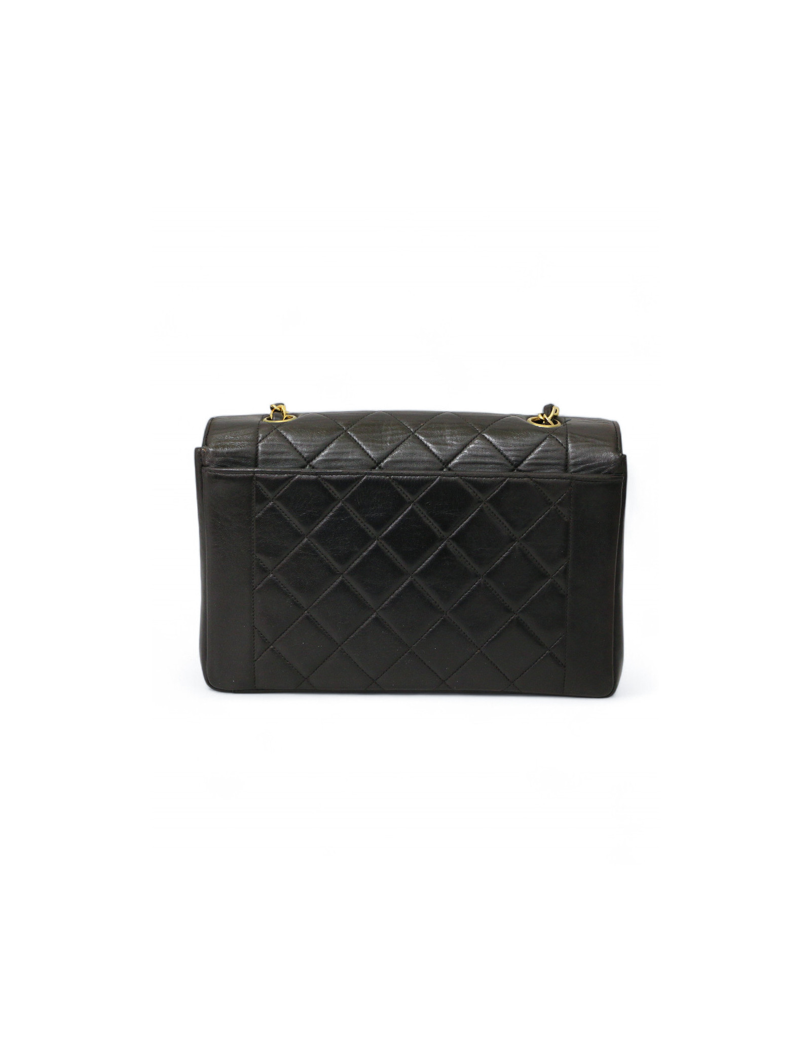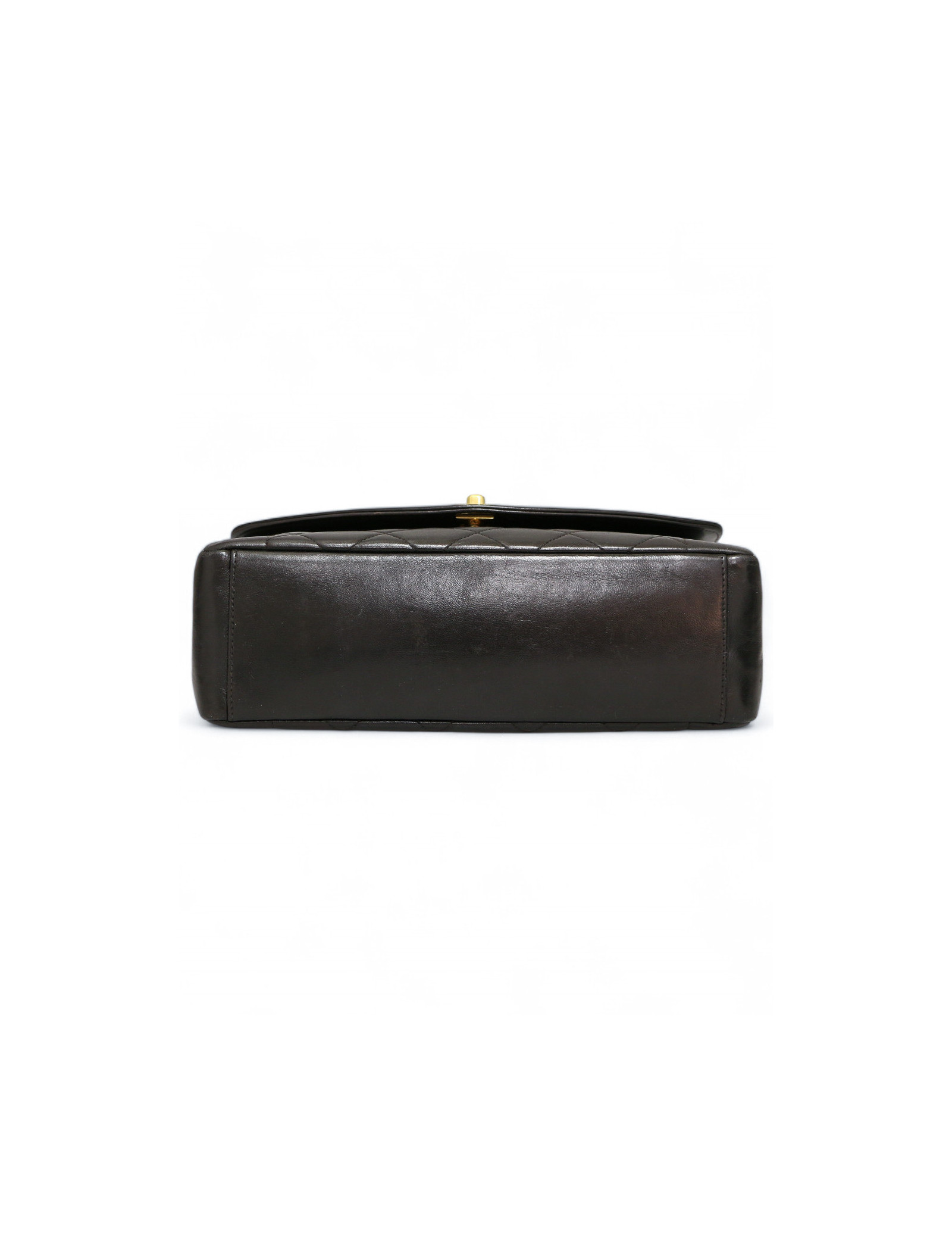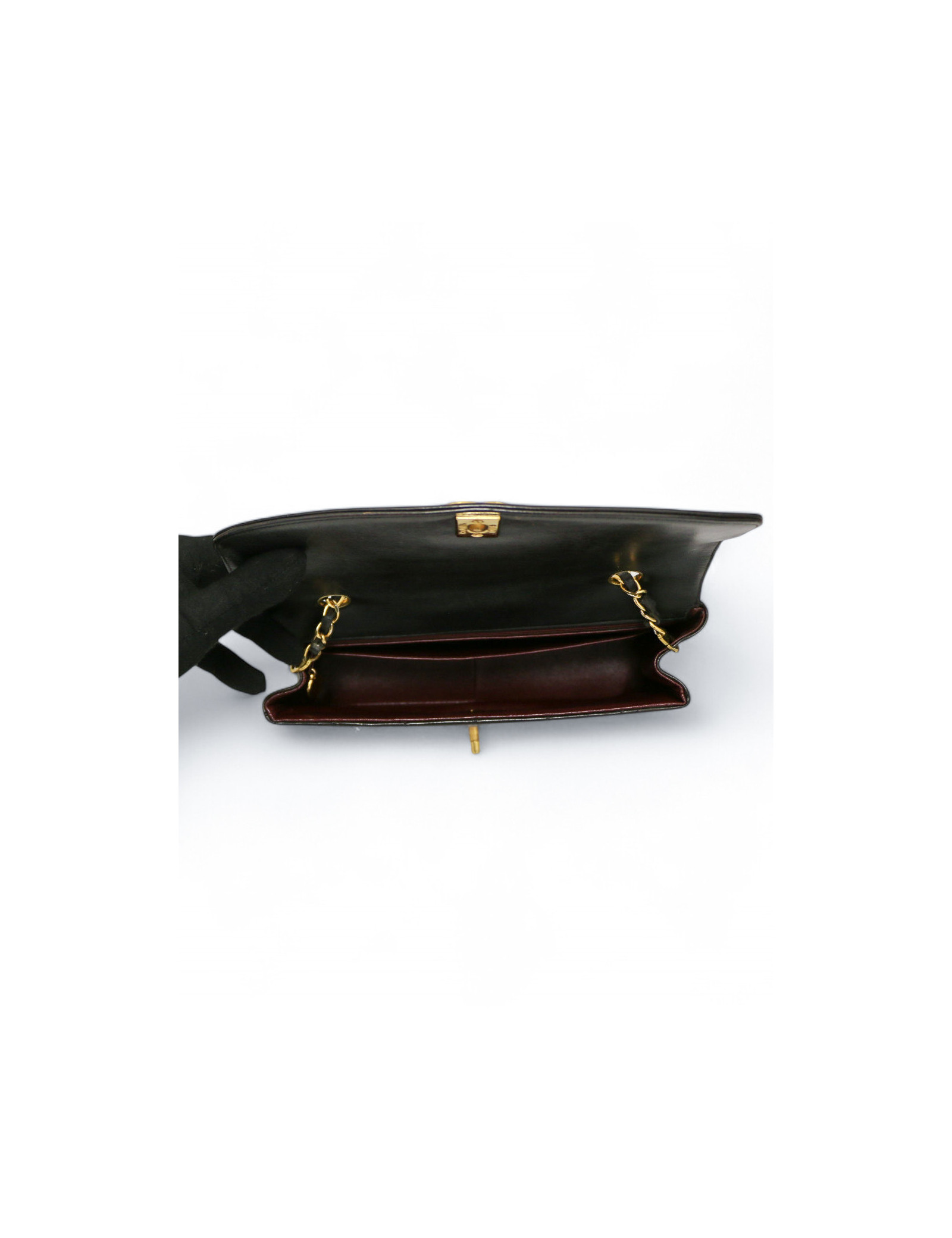 Détails : sac vintage à rabat unique orné d'une bijouterie en or 24 carats. Les coins sont en très bon état alors que le bord du rabat présente une légère usure. A l'arrière du sac une poche discrète, sous le rabat un unique espace de rangement avec deux poches plaquées dont une zippée.
