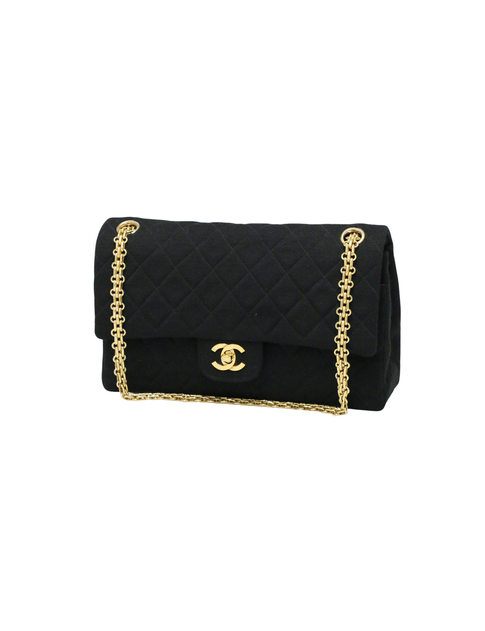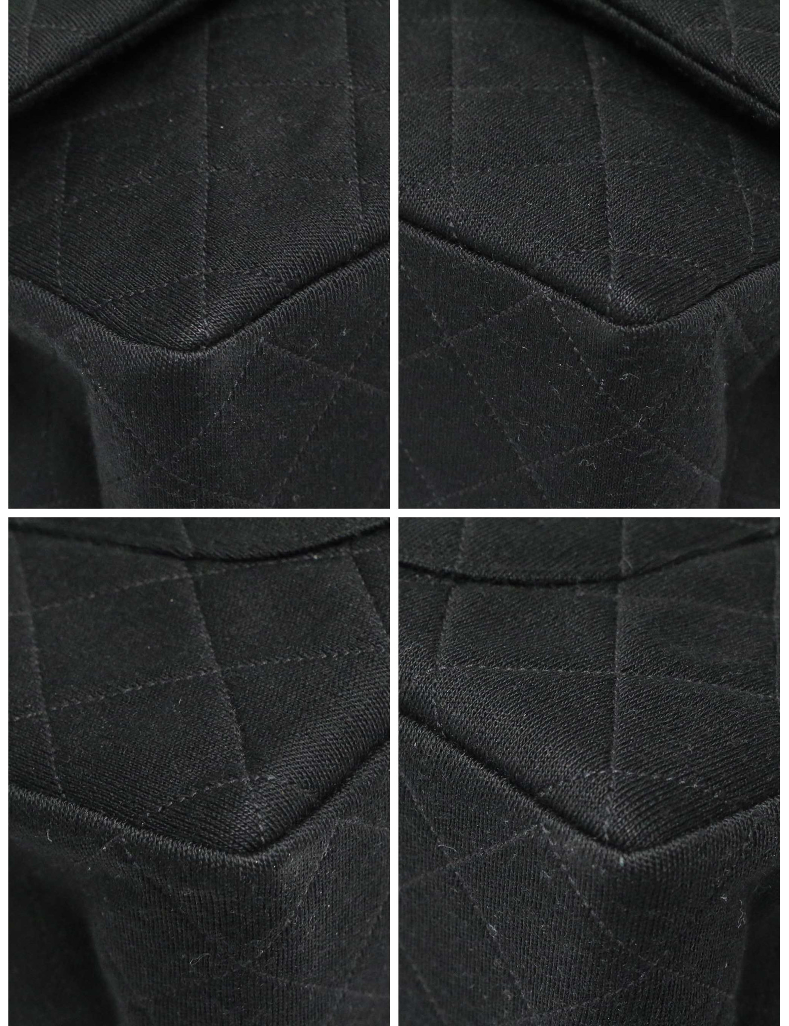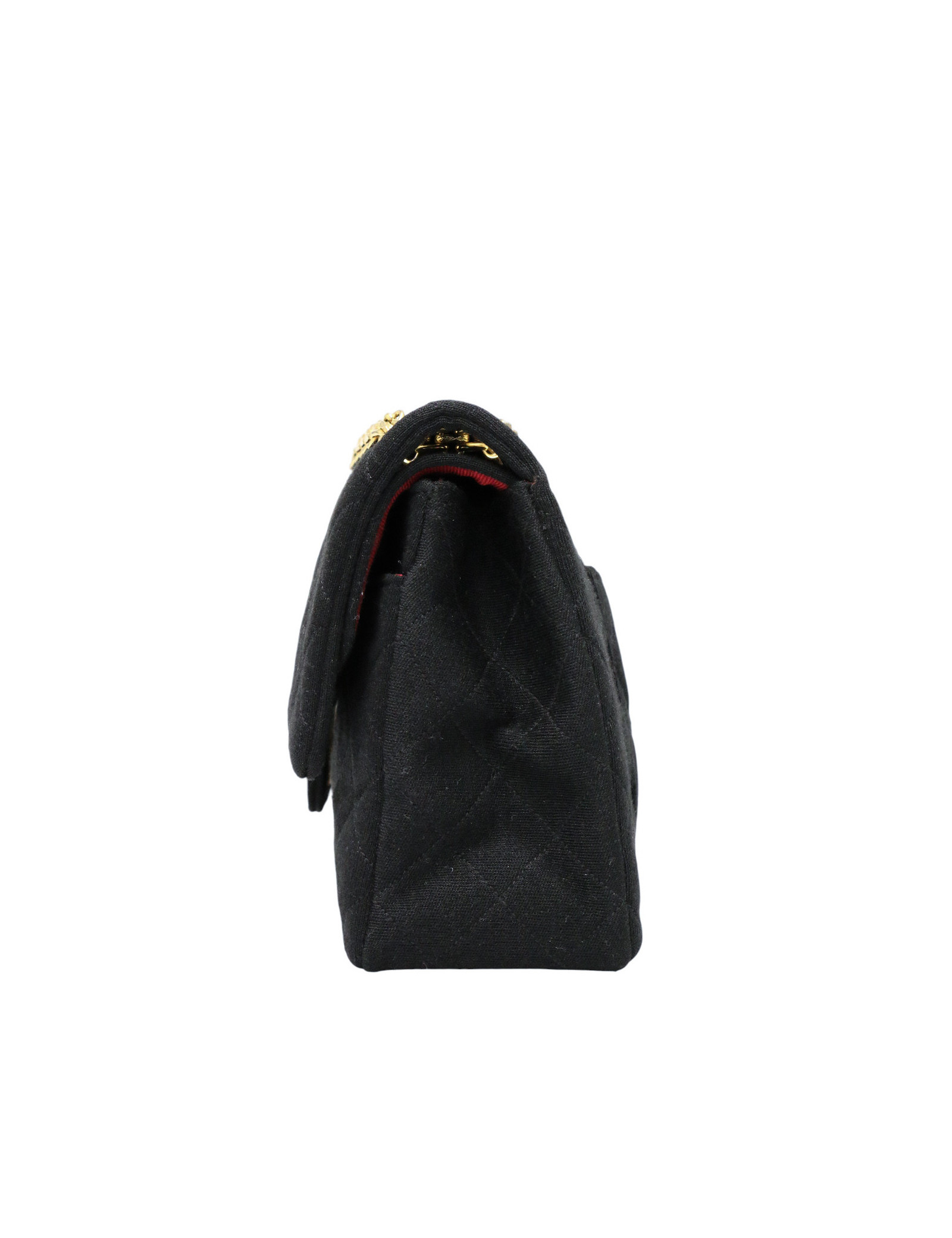 Détails : Sac Chanel vintage en jersey noir, la toile est en excellent état, aucune trace d'usure visible. Modèle rare dont la particularité réside dans sa bandoulière qui au lieu d'avoir la traditionnelle chaine en métal entrelacée de cuir, celui-ci est doté de l'emblématique fermoir du modèle 2.55 imaginée par Gabrielle Chanel. L'intérieur offre un compartiment principal de rangement agrémenté de deux petites poches plaquées. De chaque côté on retrouve une poche plate supplémentaire ainsi qu'une troisième poche à l'arrière du sac. Il se porte à l'épaule.