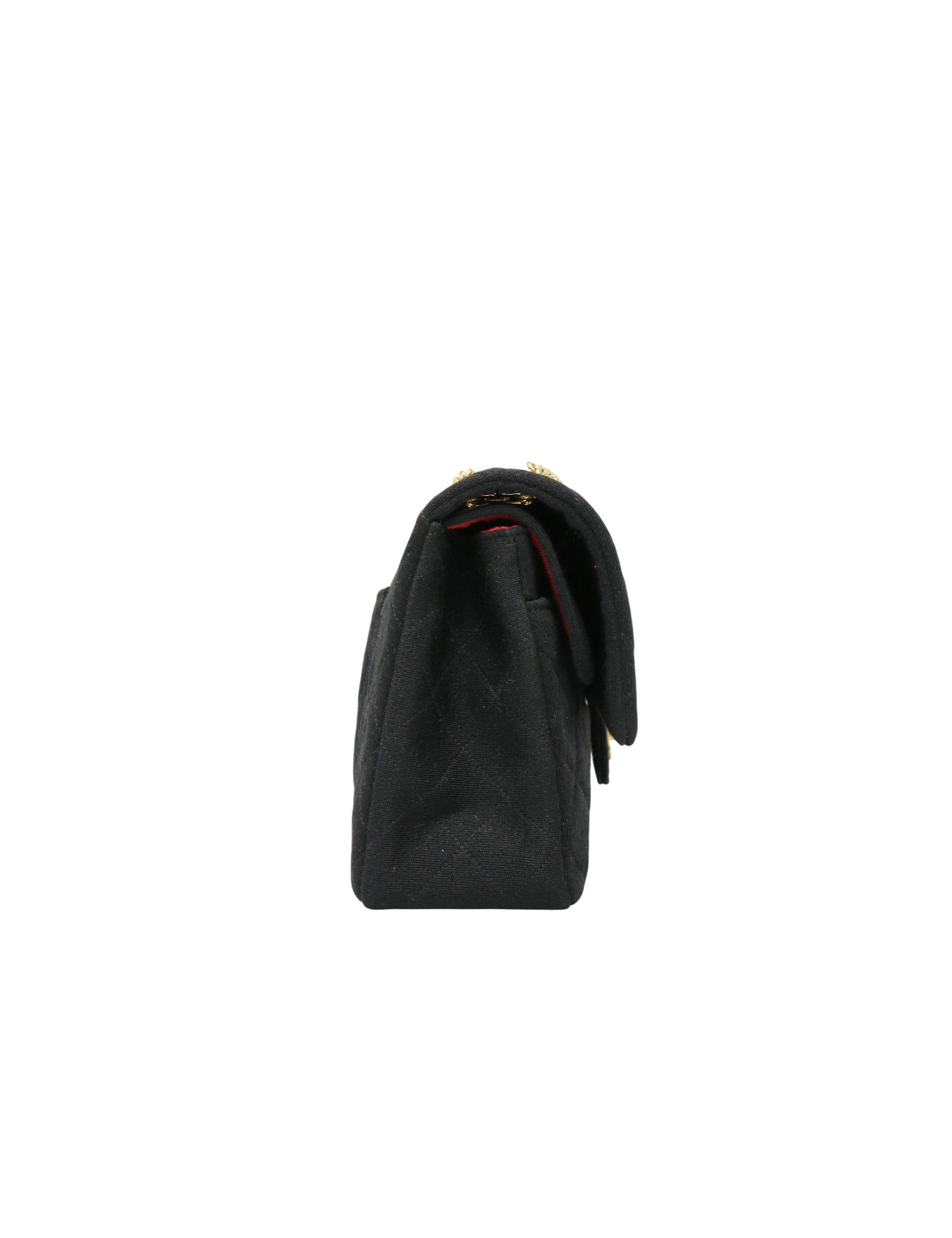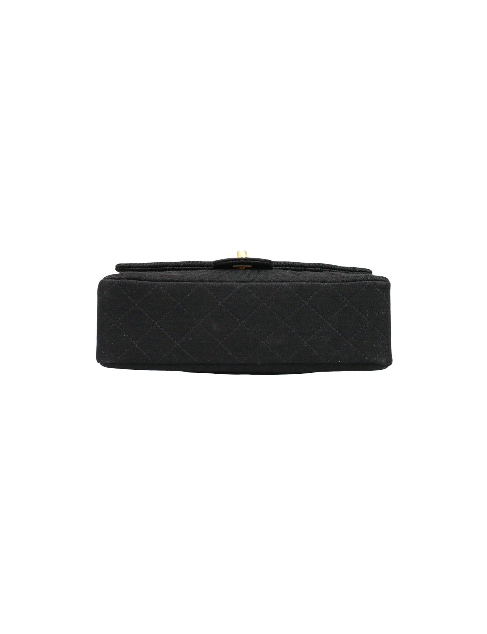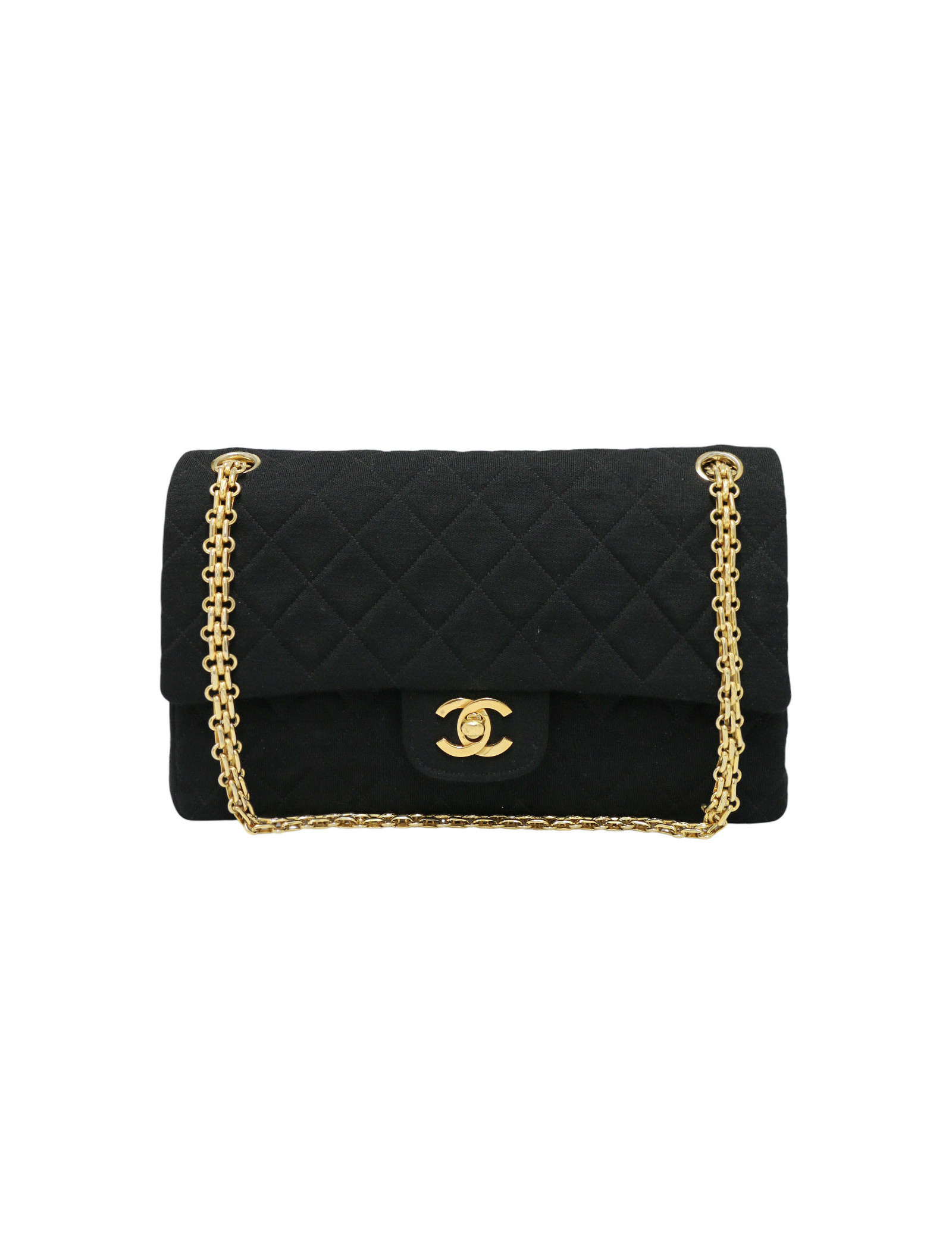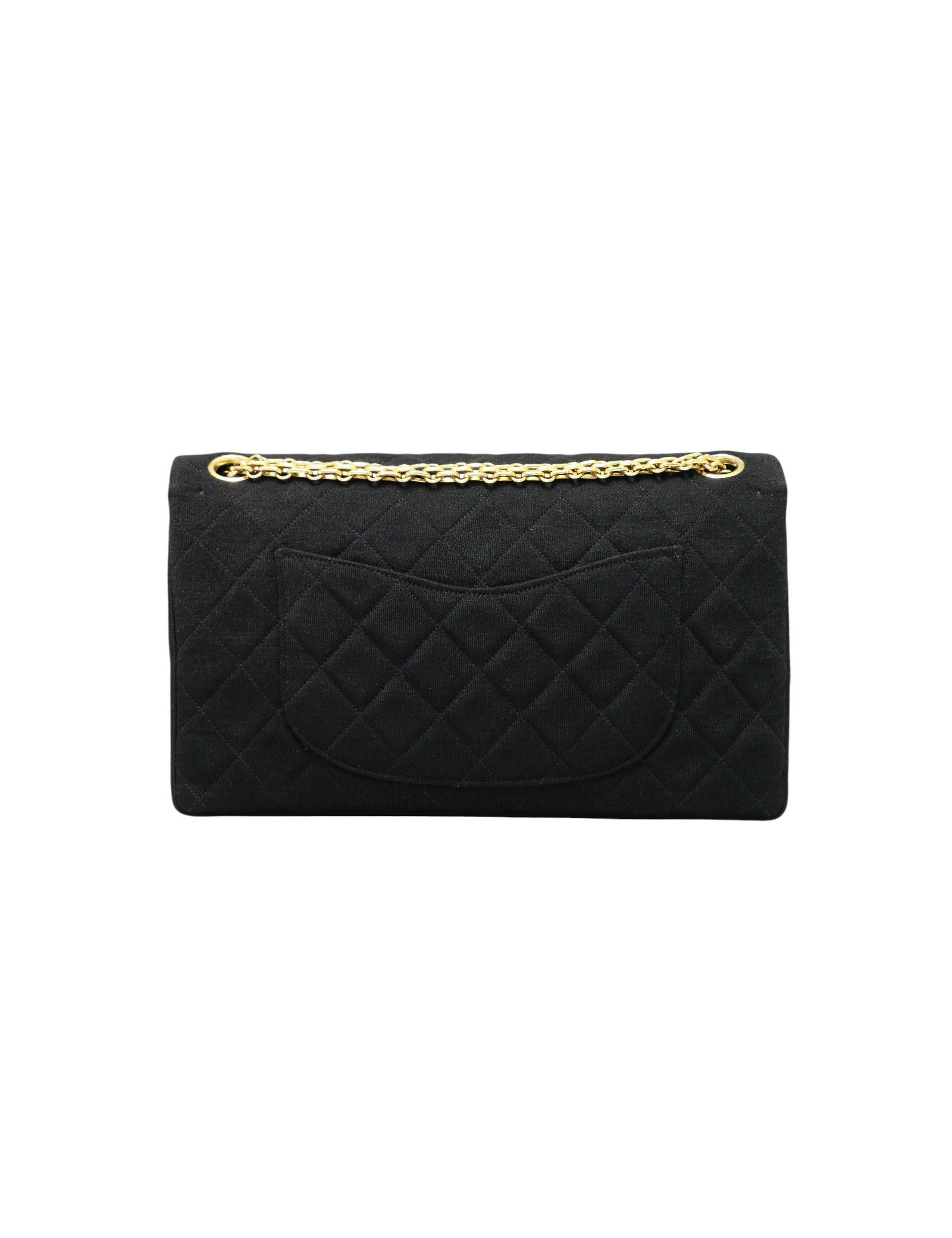 Détails : Sac Chanel vintage en jersey noir, la toile est en excellent état, aucune trace d'usure visible. Modèle rare dont la particularité réside dans sa bandoulière qui au lieu d'avoir la traditionnelle chaine en métal entrelacée de cuir, celui-ci est doté de l'emblématique fermoir du modèle 2.55 imaginée par Gabrielle Chanel. L'intérieur offre un compartiment principal de rangement agrémenté de deux petites poches plaquées. De chaque côté on retrouve une poche plate supplémentaire ainsi qu'une troisième poche à l'arrière du sac. Il se porte à l'épaule.
