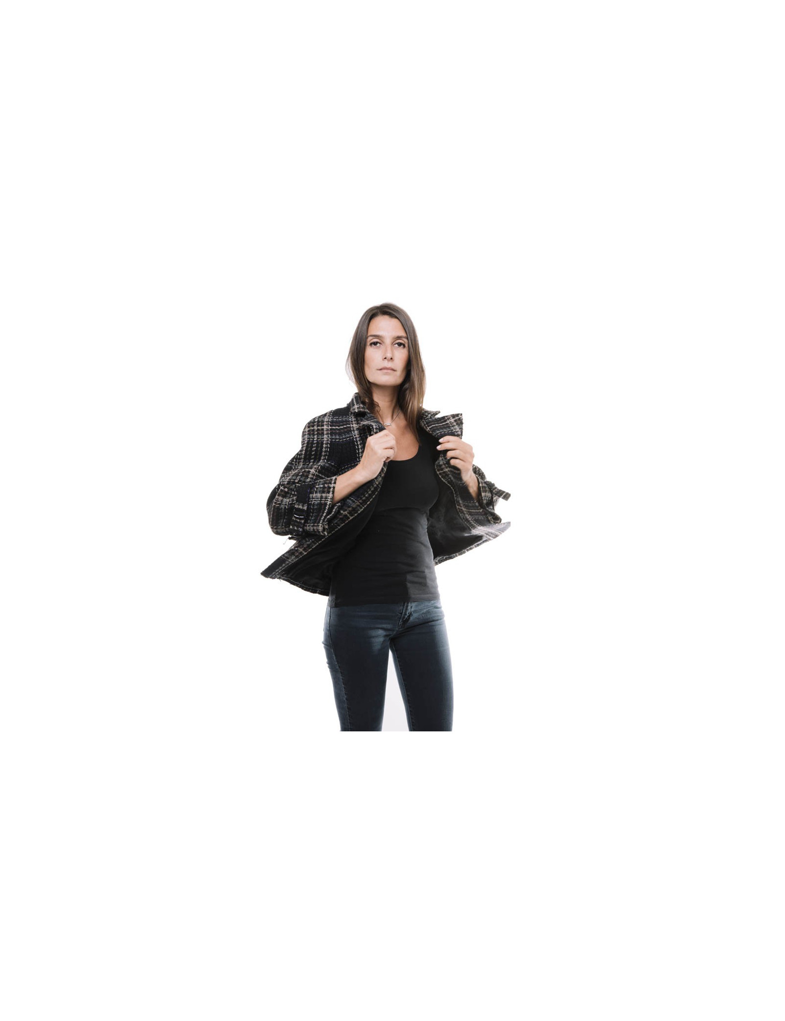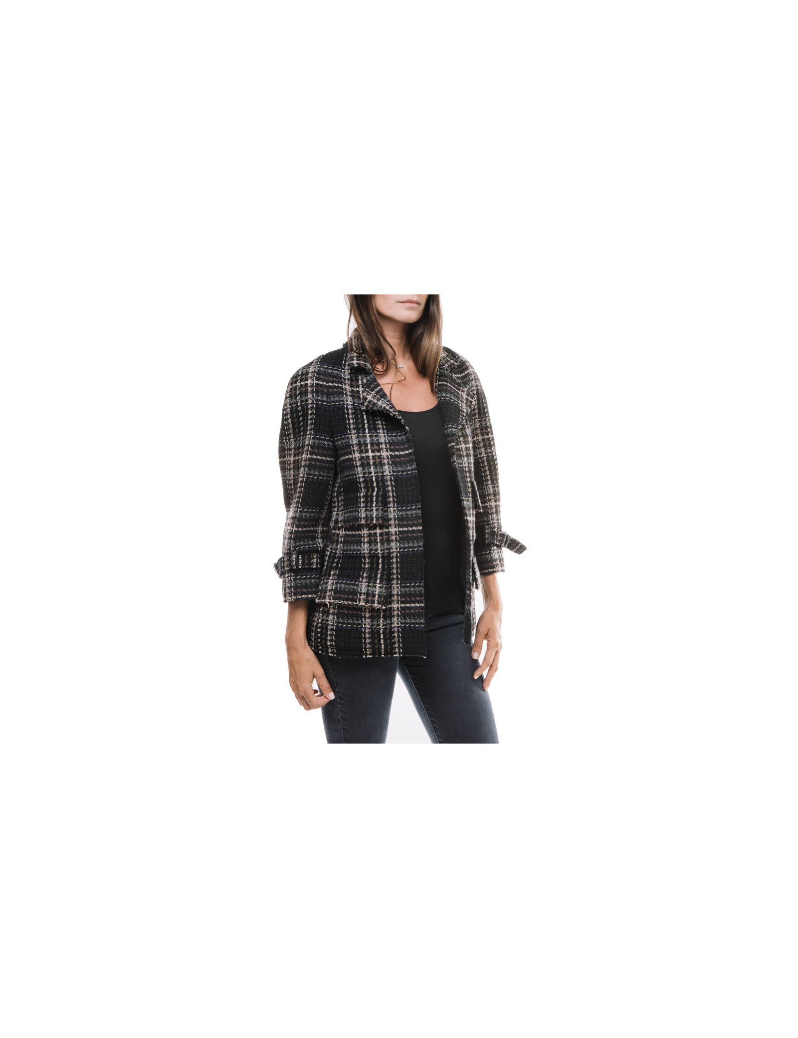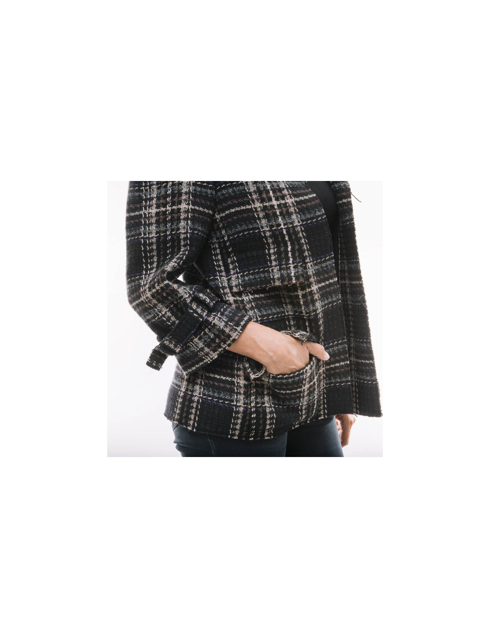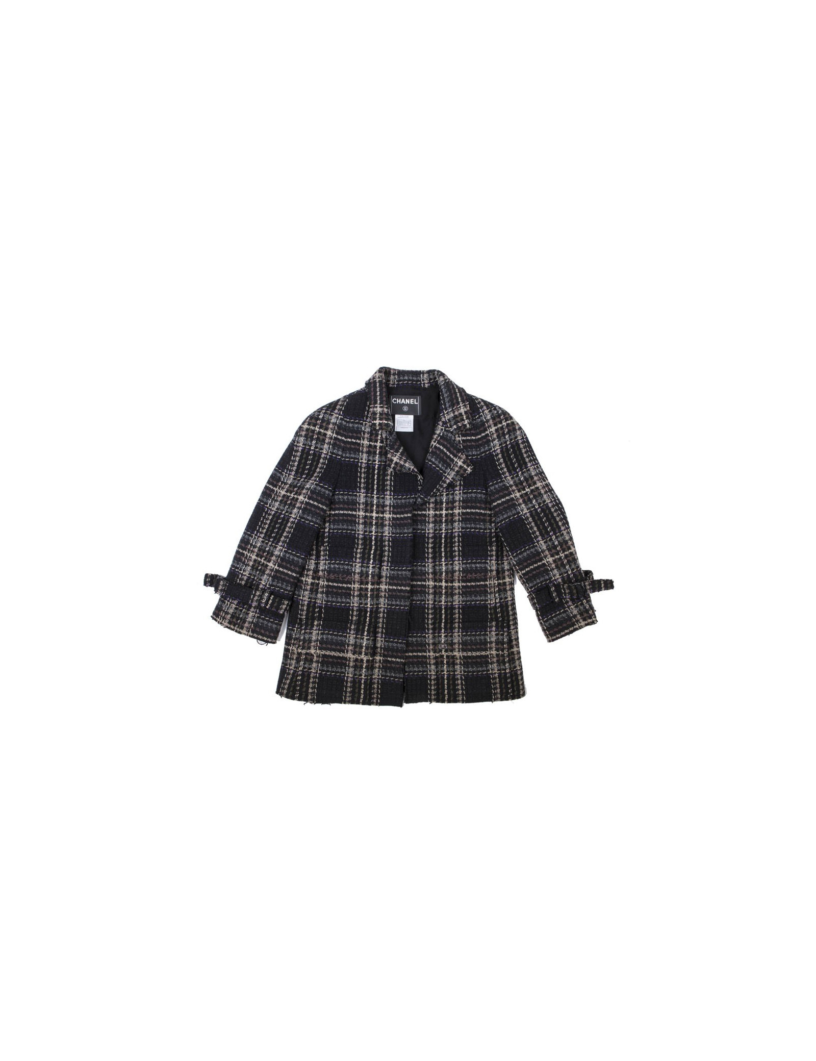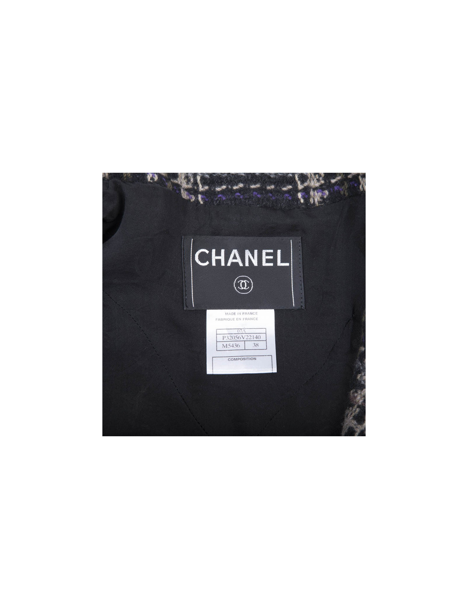 Veste taille 38, de la Maison Chanel en tweed de laine noire à carreaux beige, marron et violet, manches raglan.