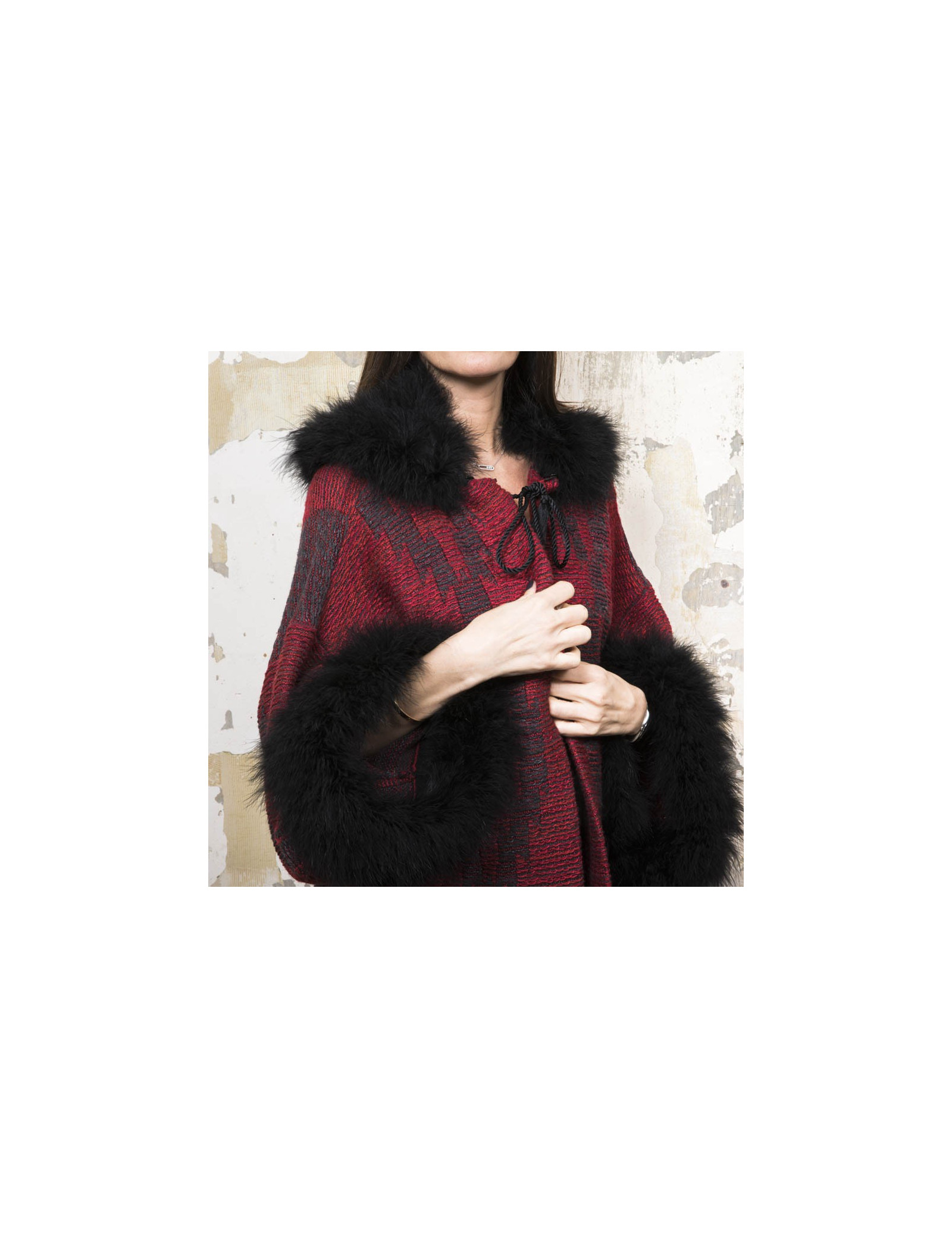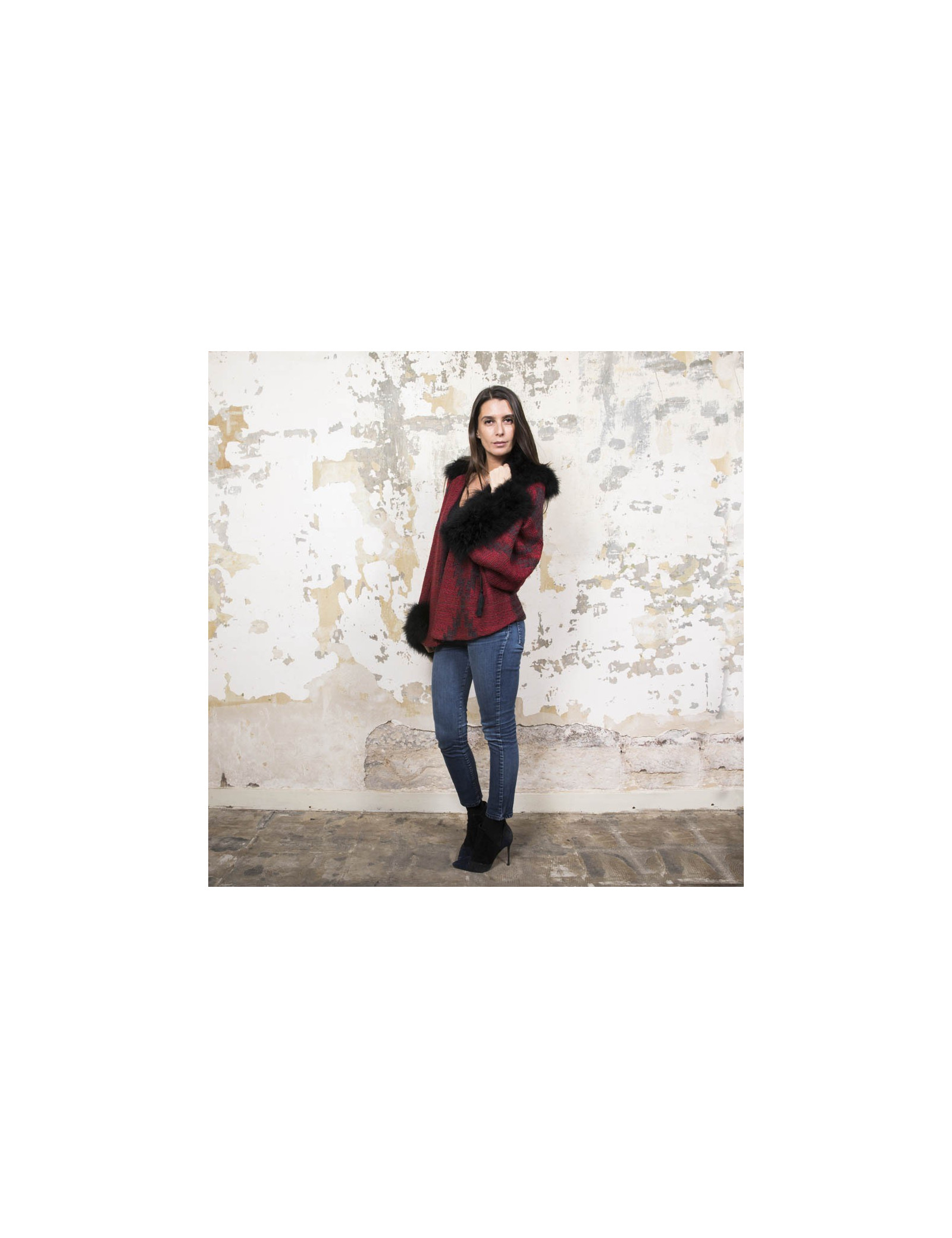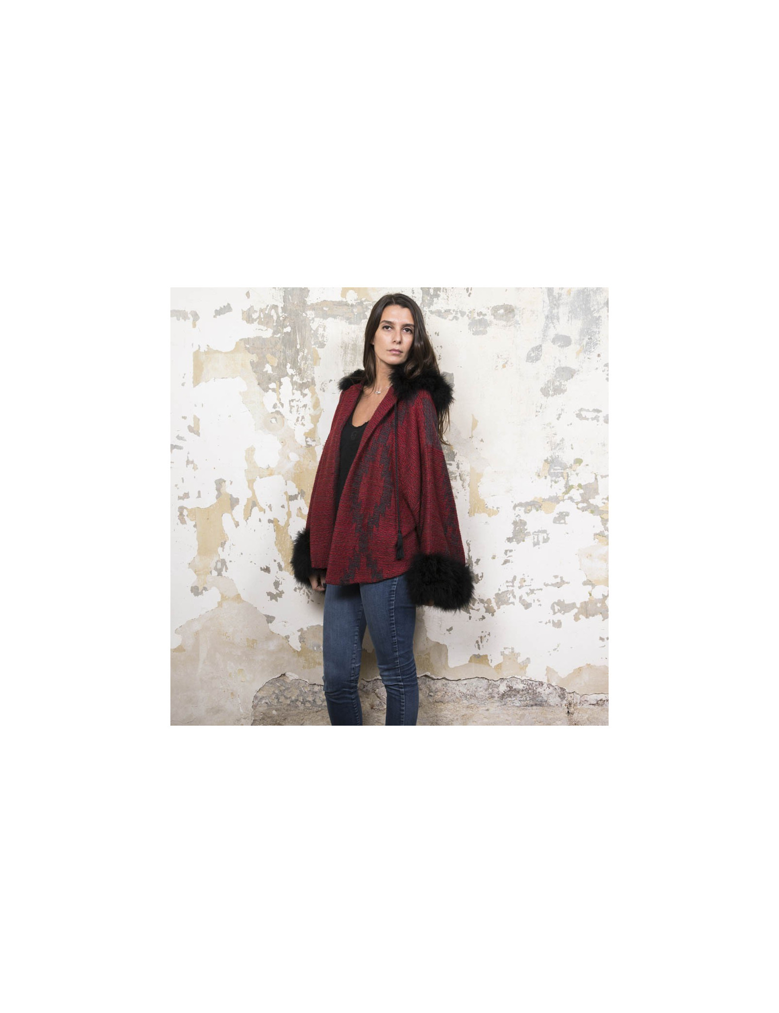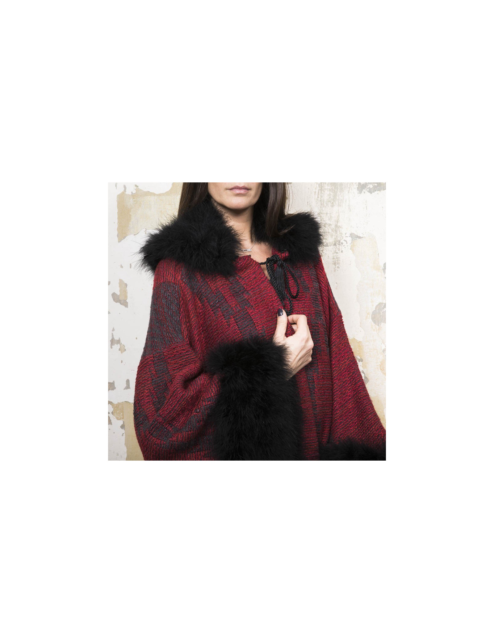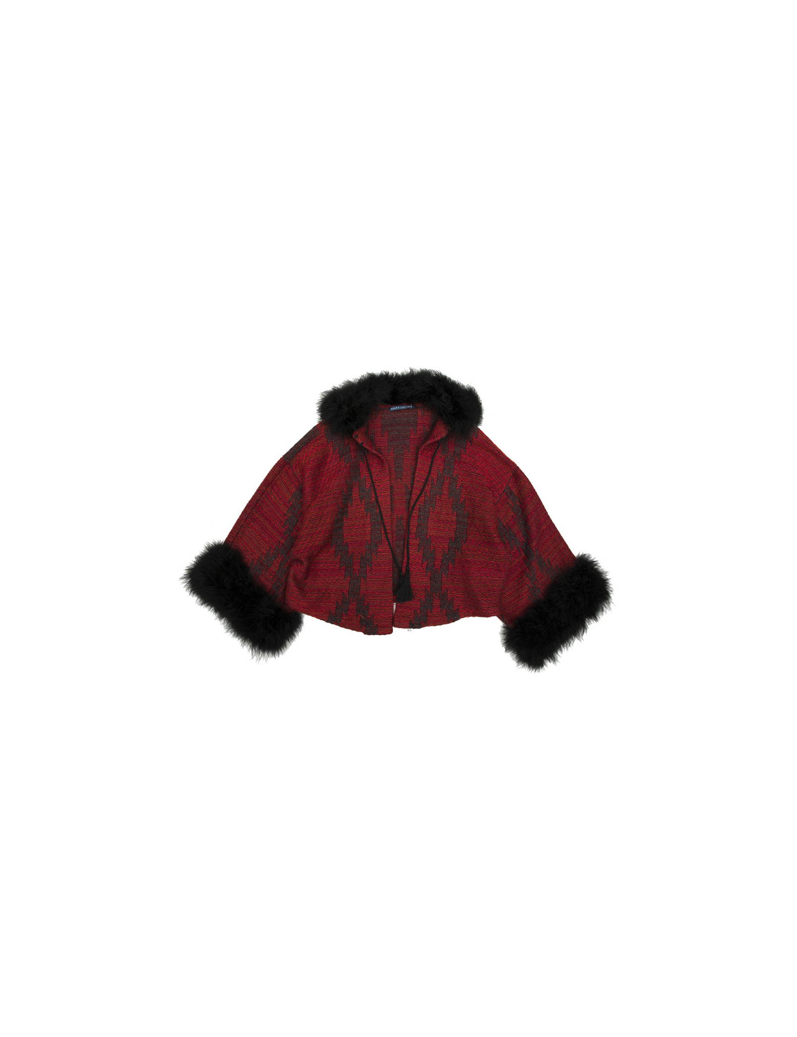 Grand col amovible en plume noire. La bordure des manches est également en plume noire. Le gilet se ferme à l'aide d'un crochet au niveau du col et de deux lanière en tissus avec un pompon au bout. Les manches sont raglan. Porté oversize.