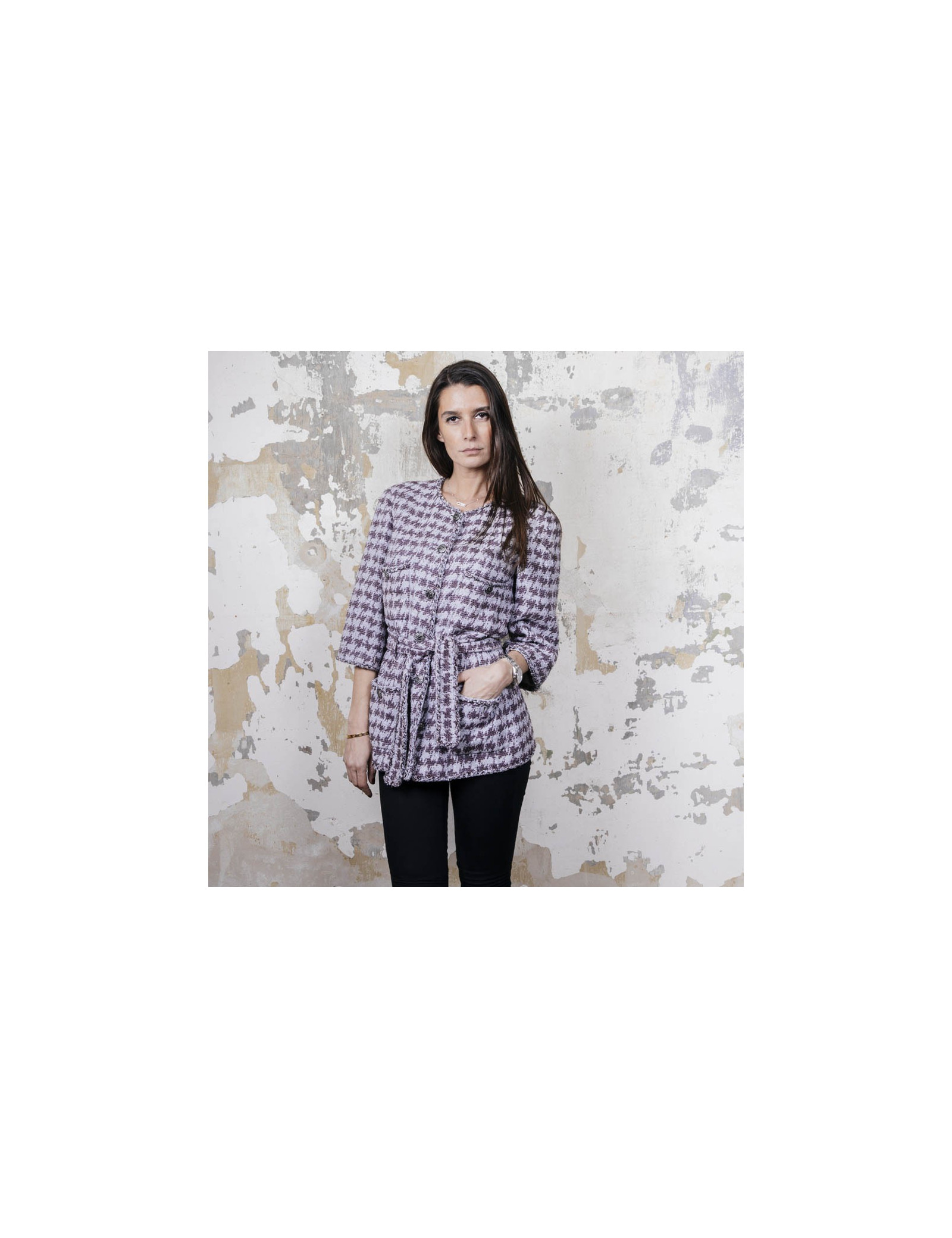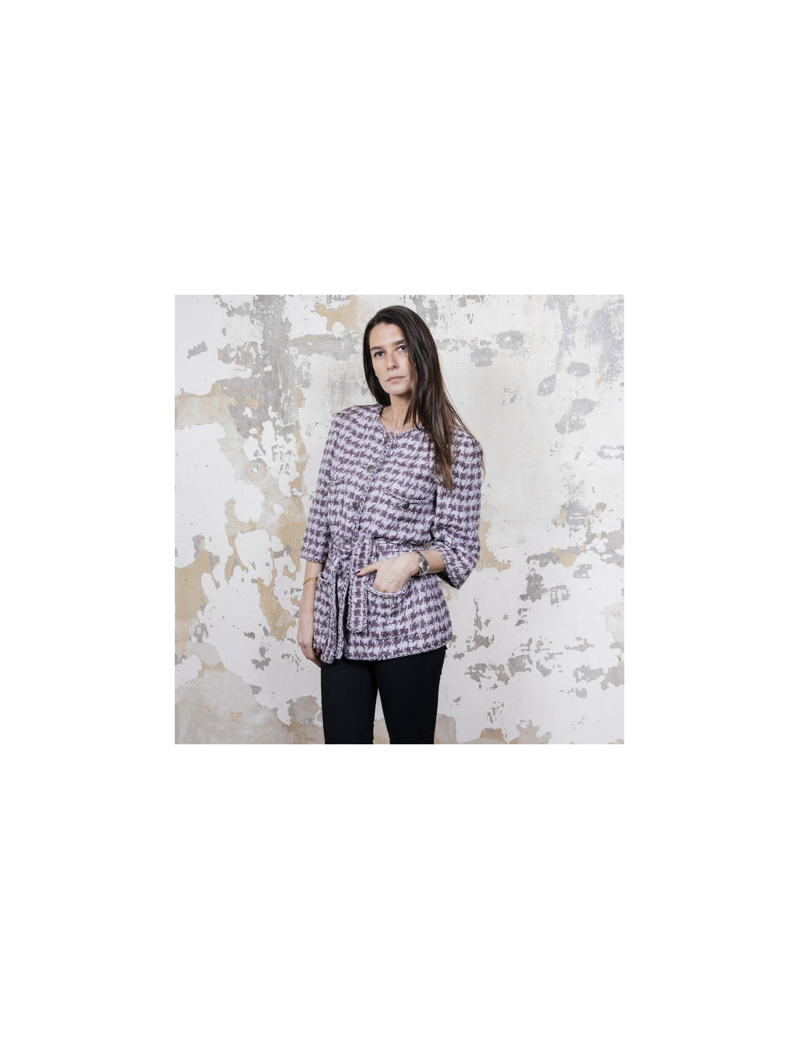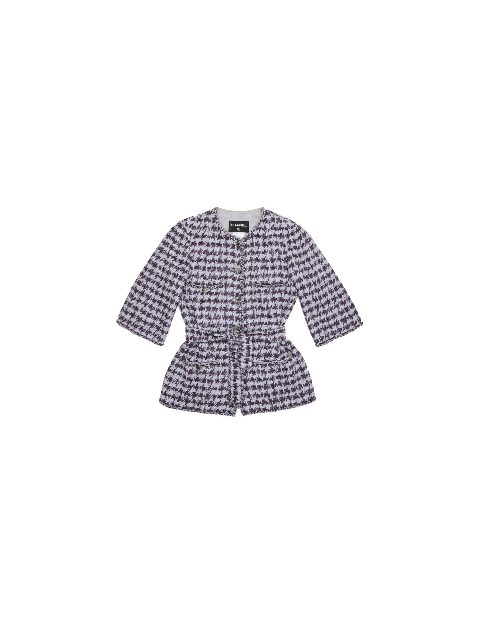 Veste taille 40 Chanel en coton gris avec motifs violet. Se ferme à l'aide de six boutons argent ruthénium siglés 'CC'. Quatre poches plaquées fermées par un bouton. Ceinture au niveau de la taille. Doublure monogram 100% soie. Très bon état (quelques traces sous les aisselles ) Made in France