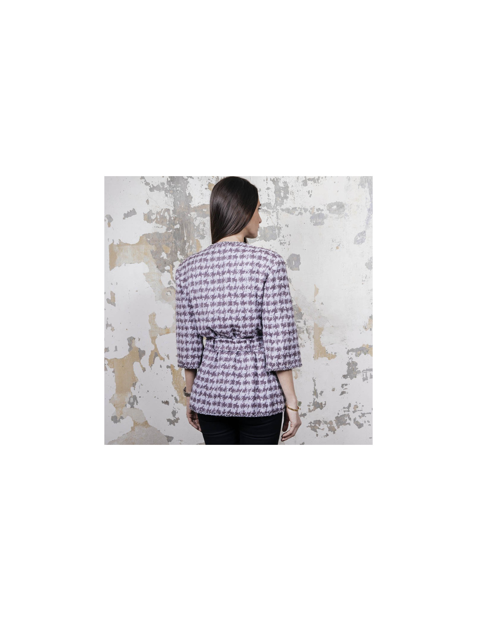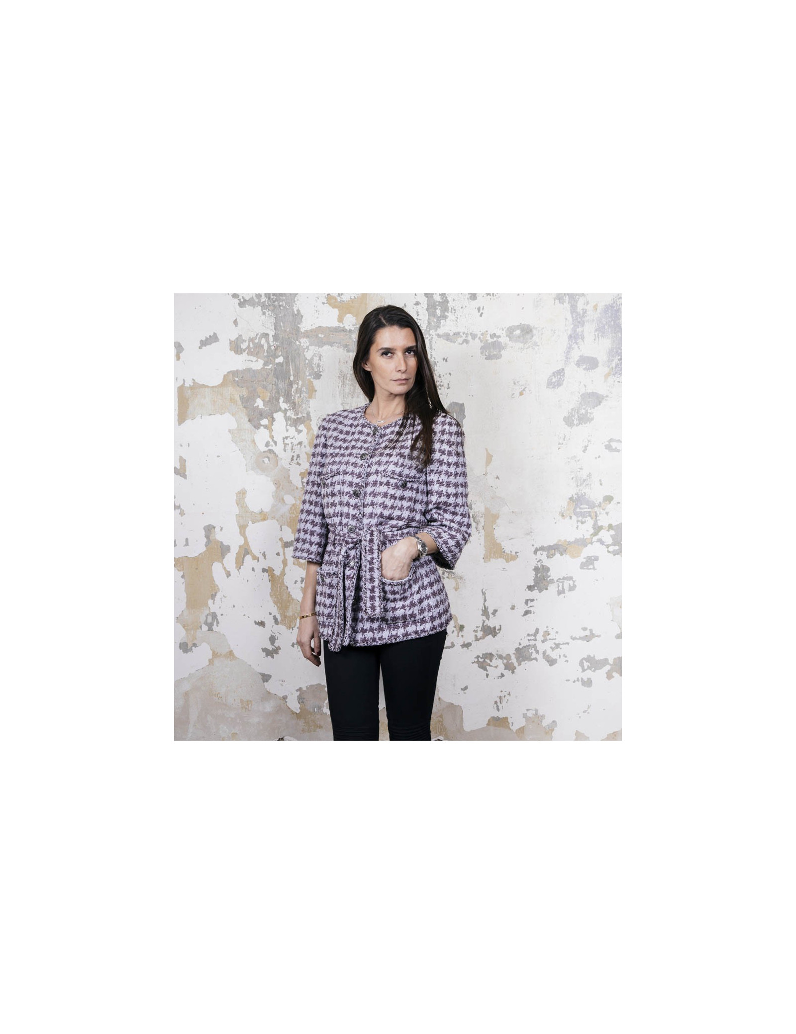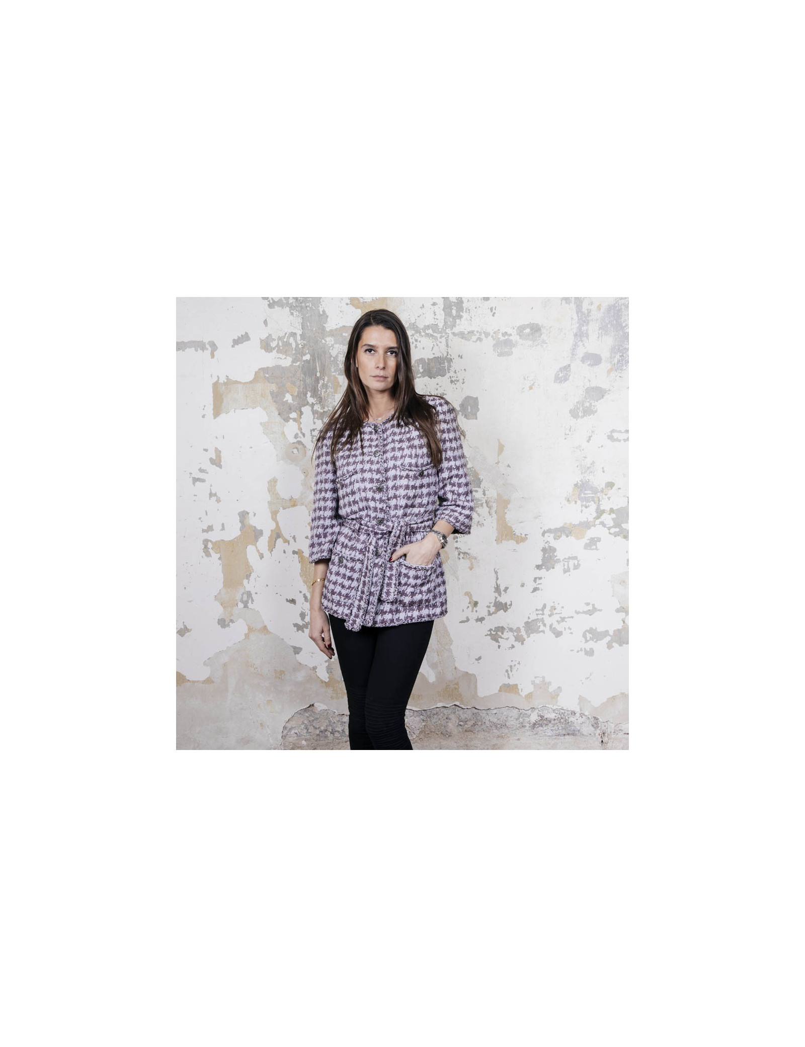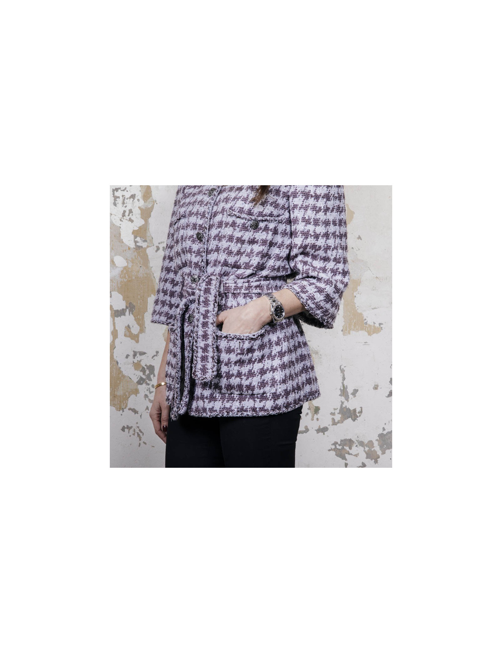 Veste taille 40 Chanel en coton gris avec motifs violet. Se ferme à l'aide de six boutons argent ruthénium siglés 'CC'. Quatre poches plaquées fermées par un bouton. Ceinture au niveau de la taille. Doublure monogram 100% soie. Très bon état (quelques traces sous les aisselles ) Made in France