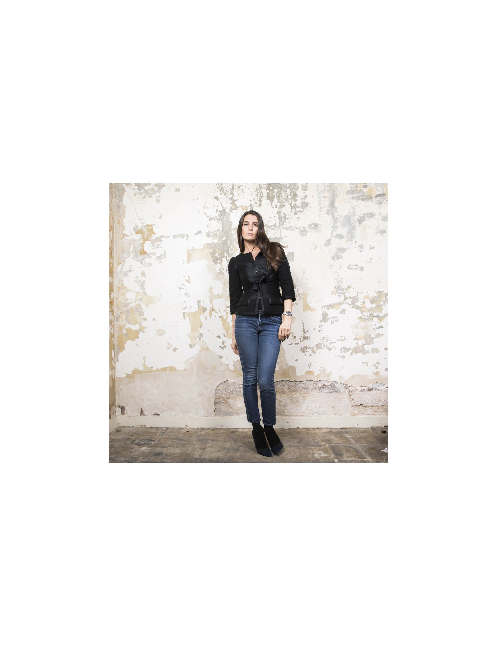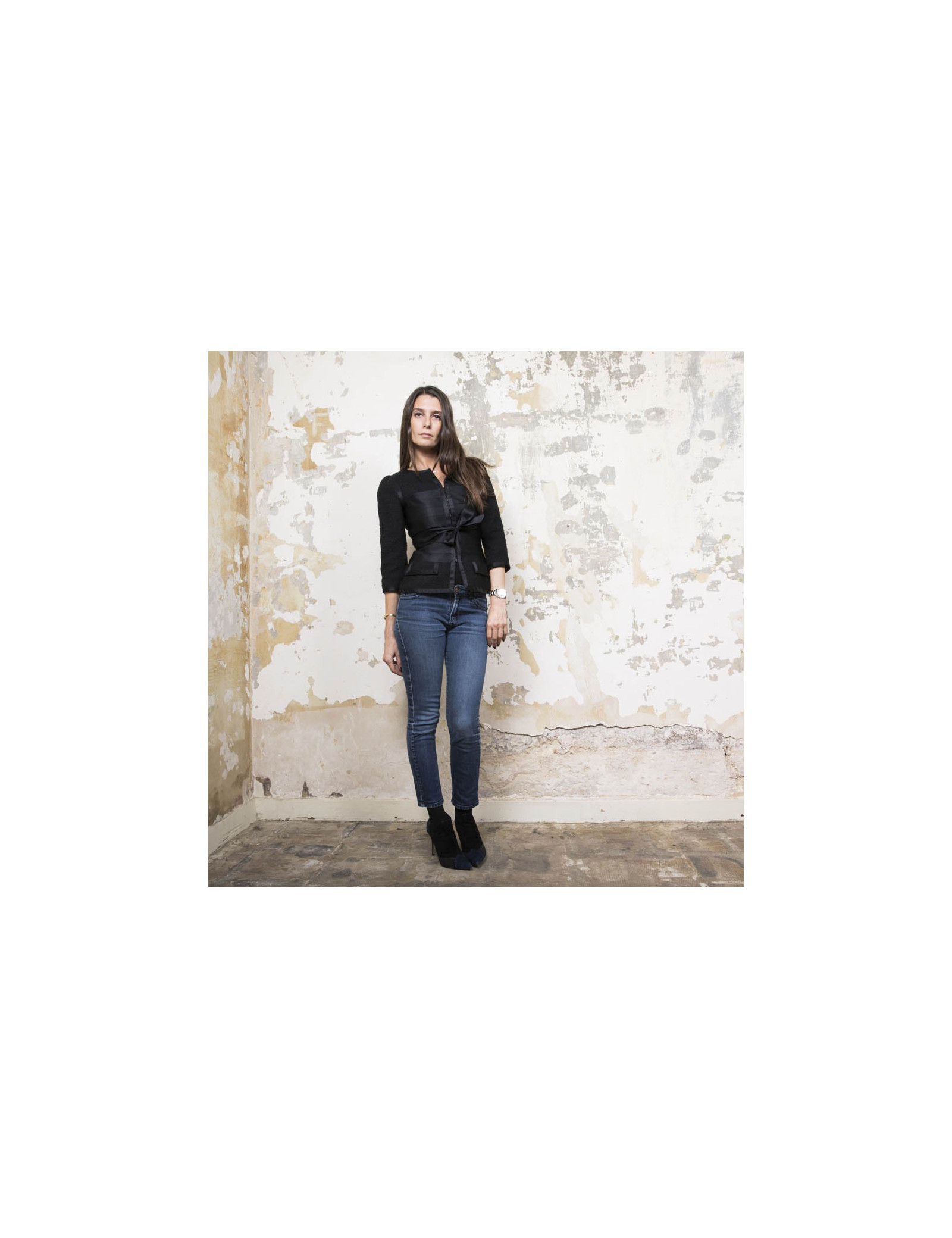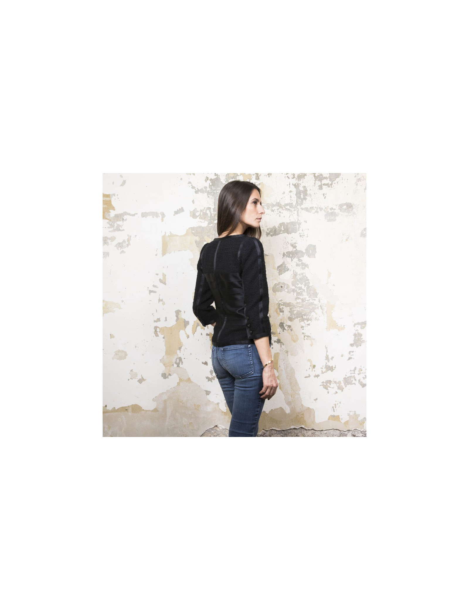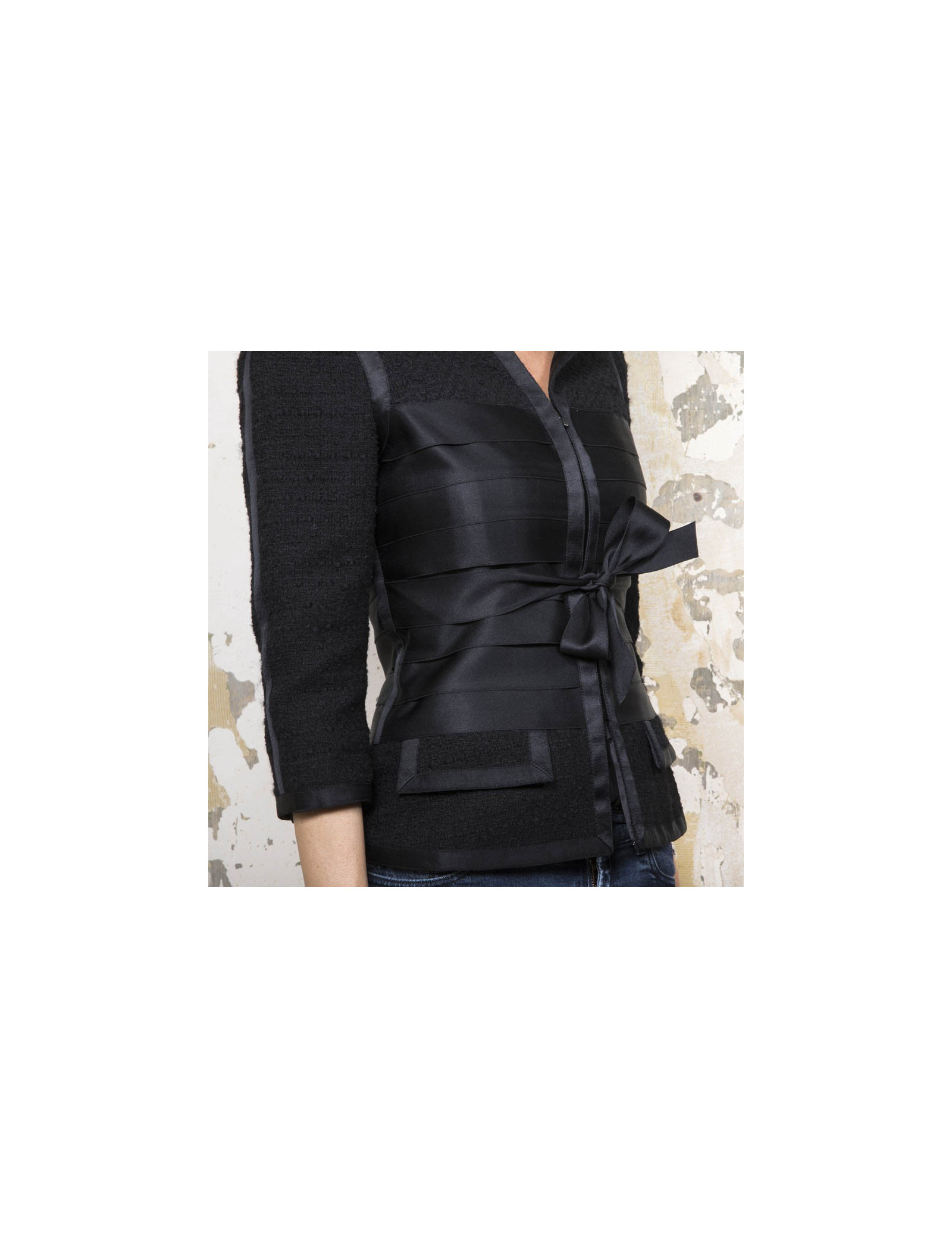 Veste Chanel en tweed noir et rubans de soie. La doublure est en soie noire. Deux fausses poches et une fermeture à glissière. Elle se cintre à la taille à l'aide d'un jolie ruban noir. Collection 06/A