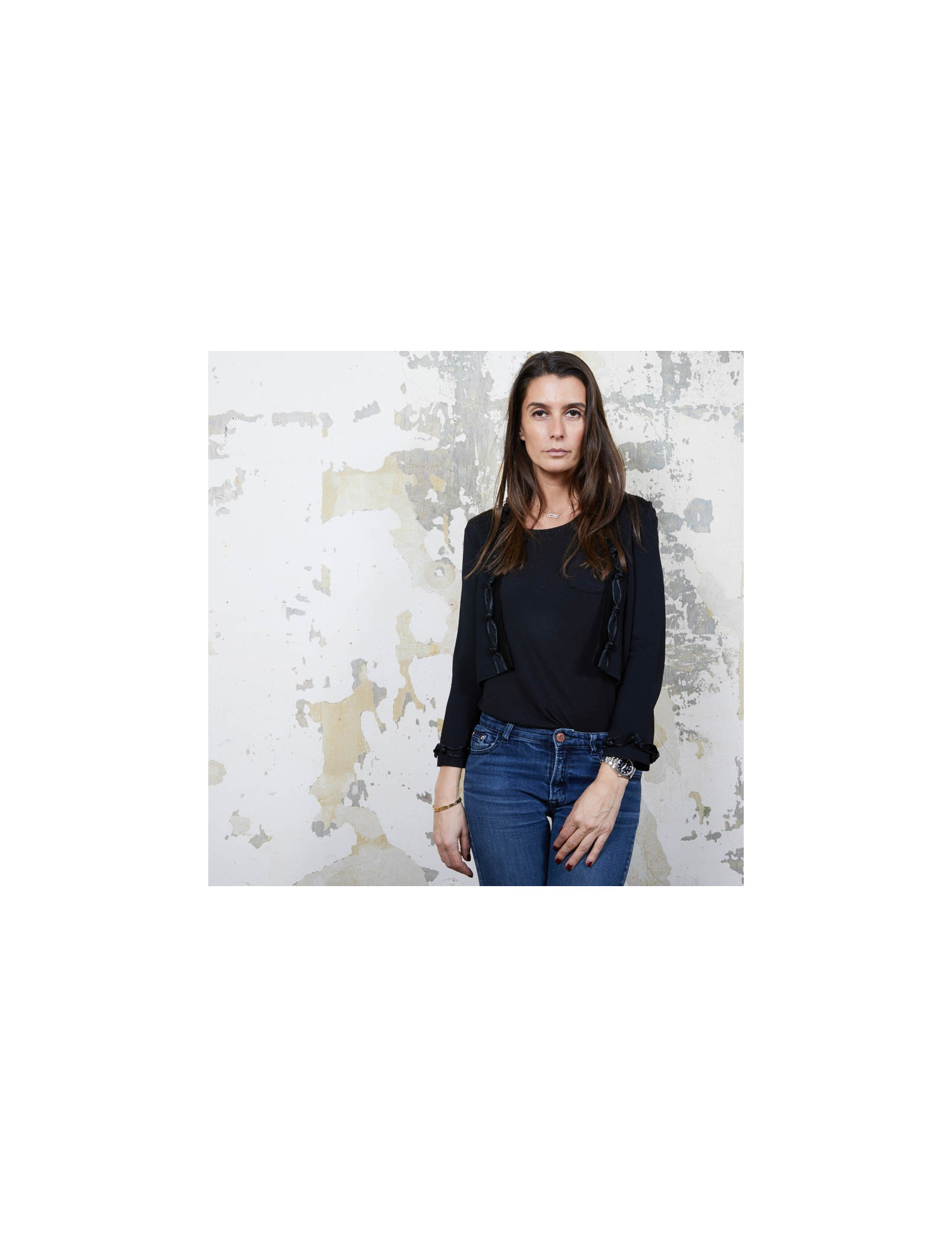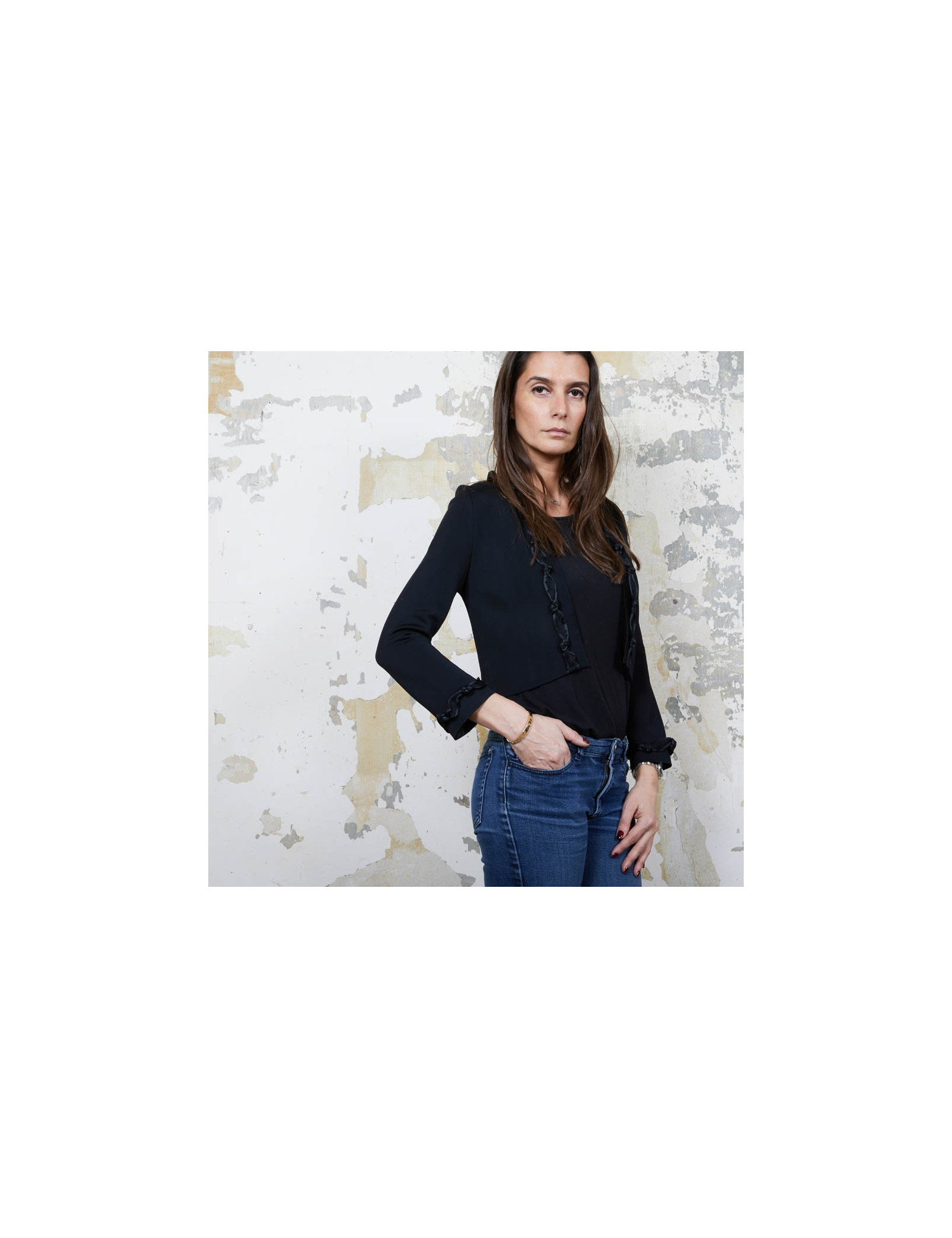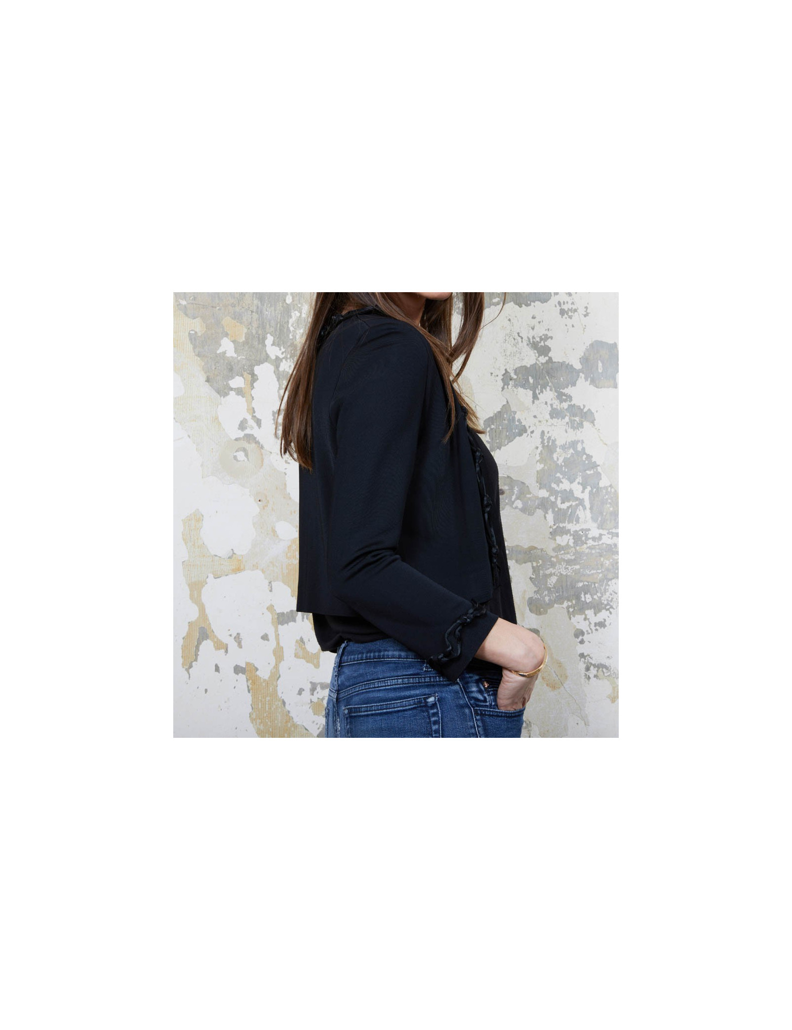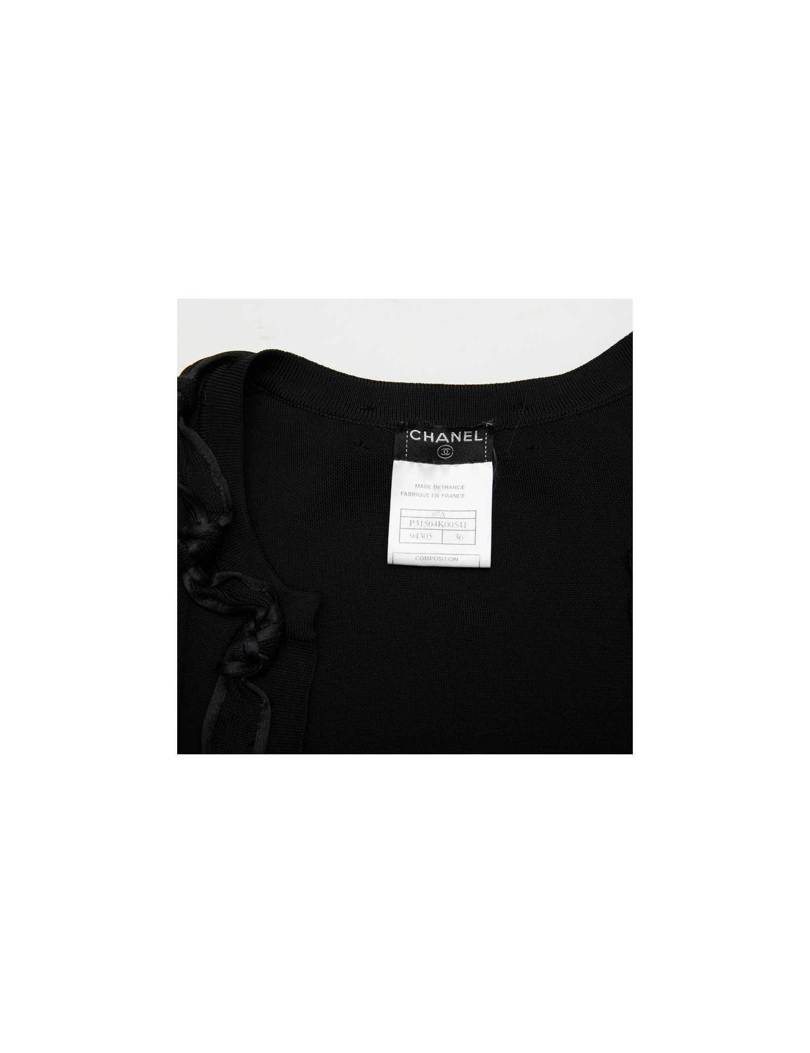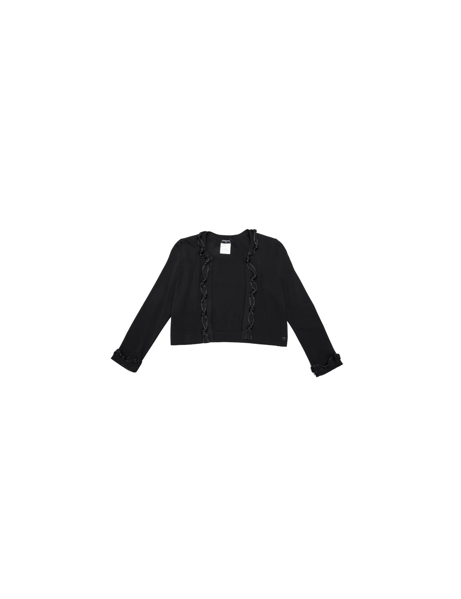 Gilet noir T 36 en viscose Chanel, gansé à l'avant et aux poignets d'une bande agrémentée des noeuds. Collection Automne 2007. Made in France.