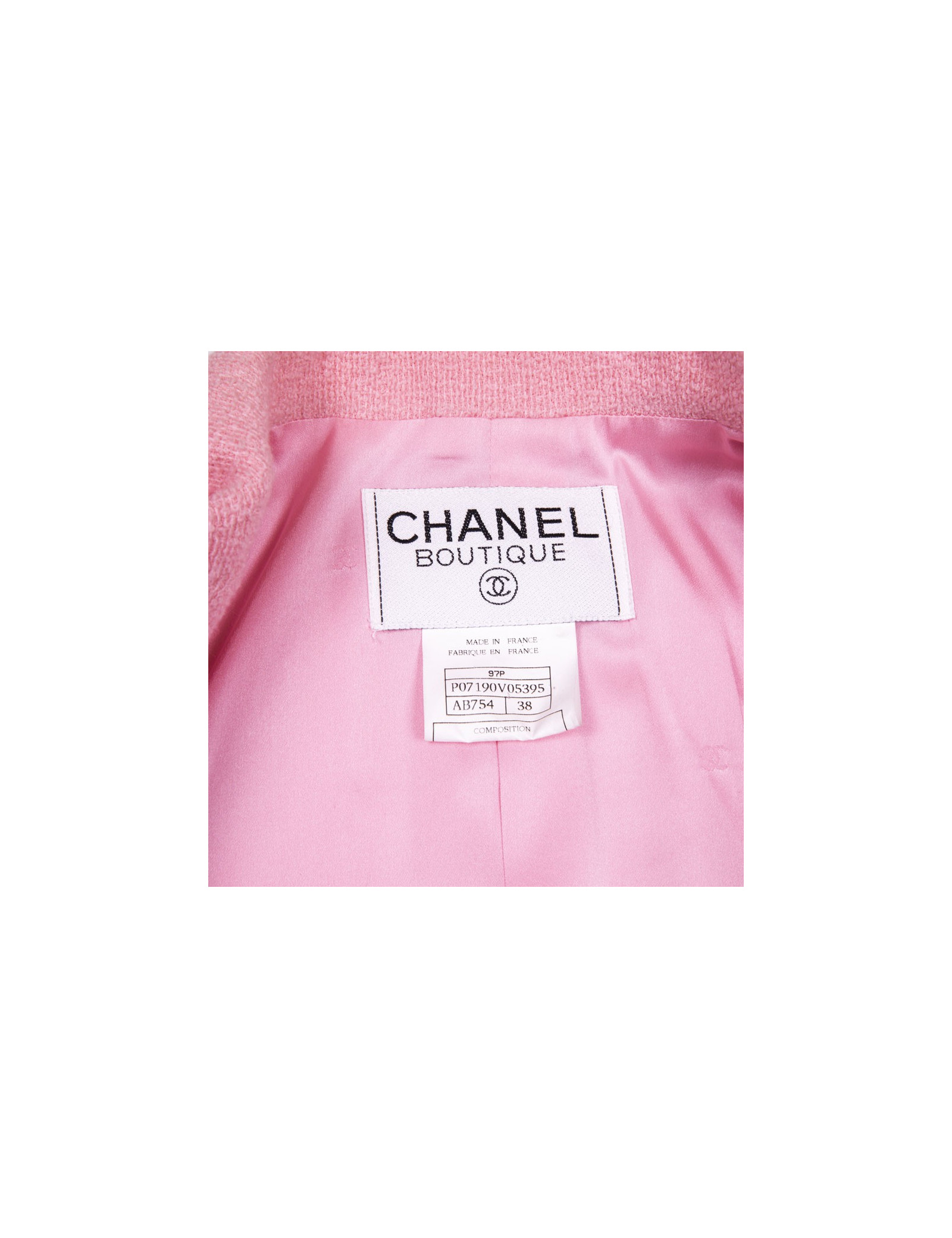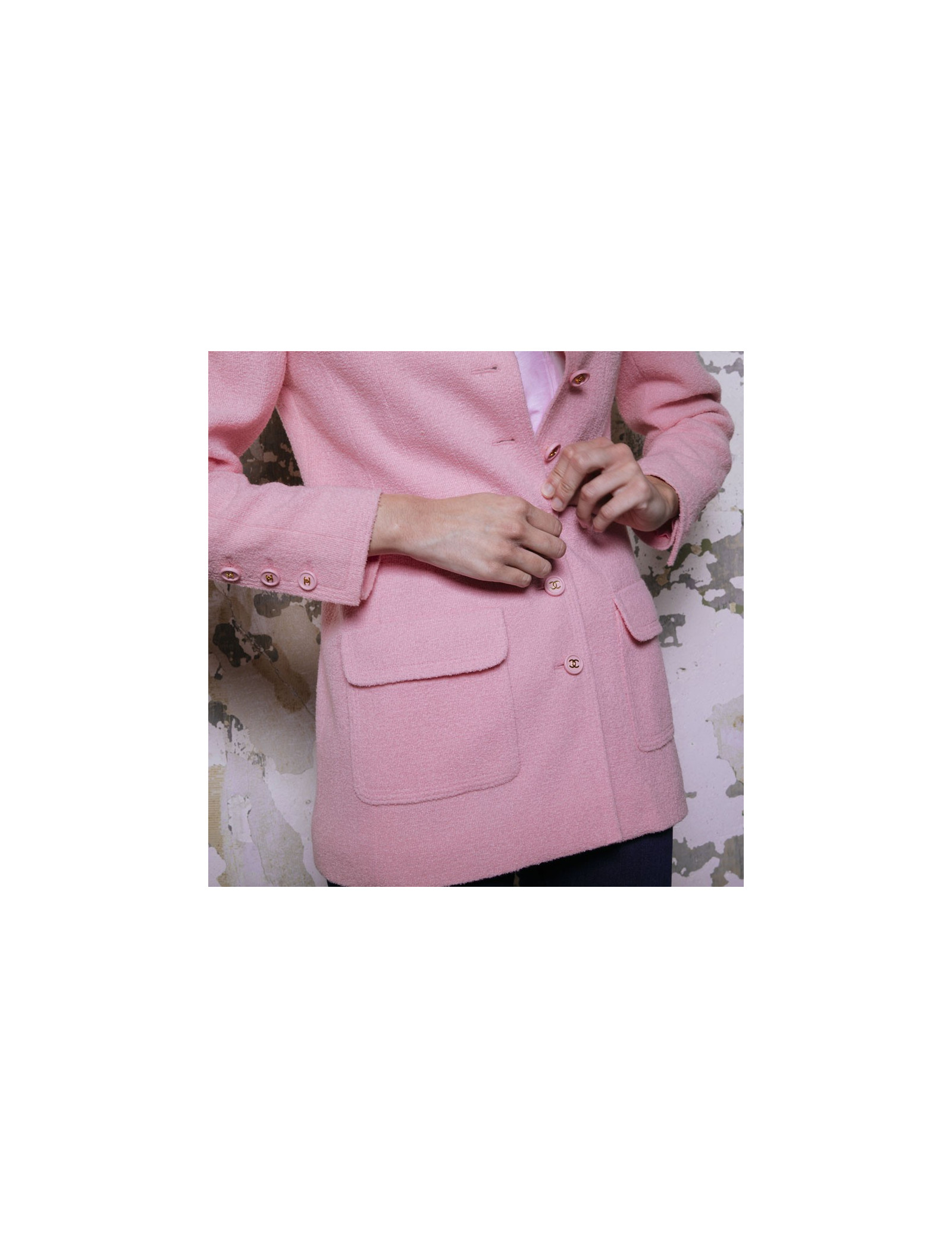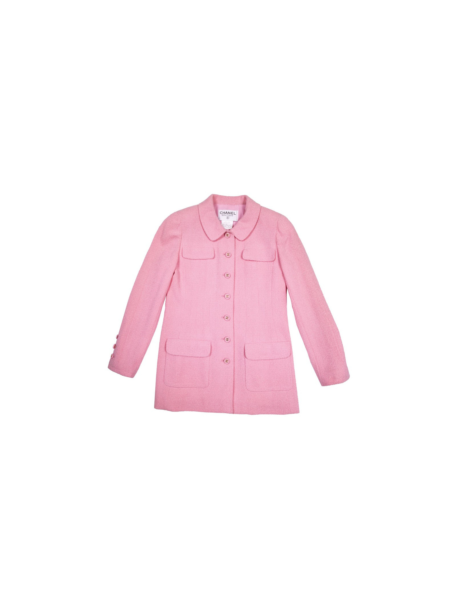 Veste Chanel en tweed en laine rose Collection Printemps-été 1997. Doublure en soie rose. Boutons roses avec signature CC dorée. Deux vraies poches sur le bas de la veste et deux fausses poches au niveau de la poitrine.