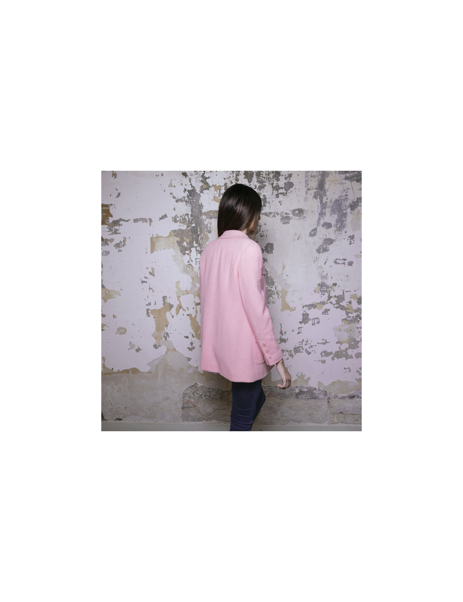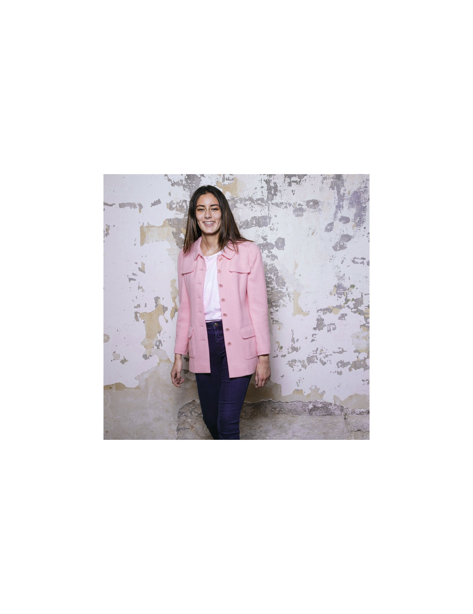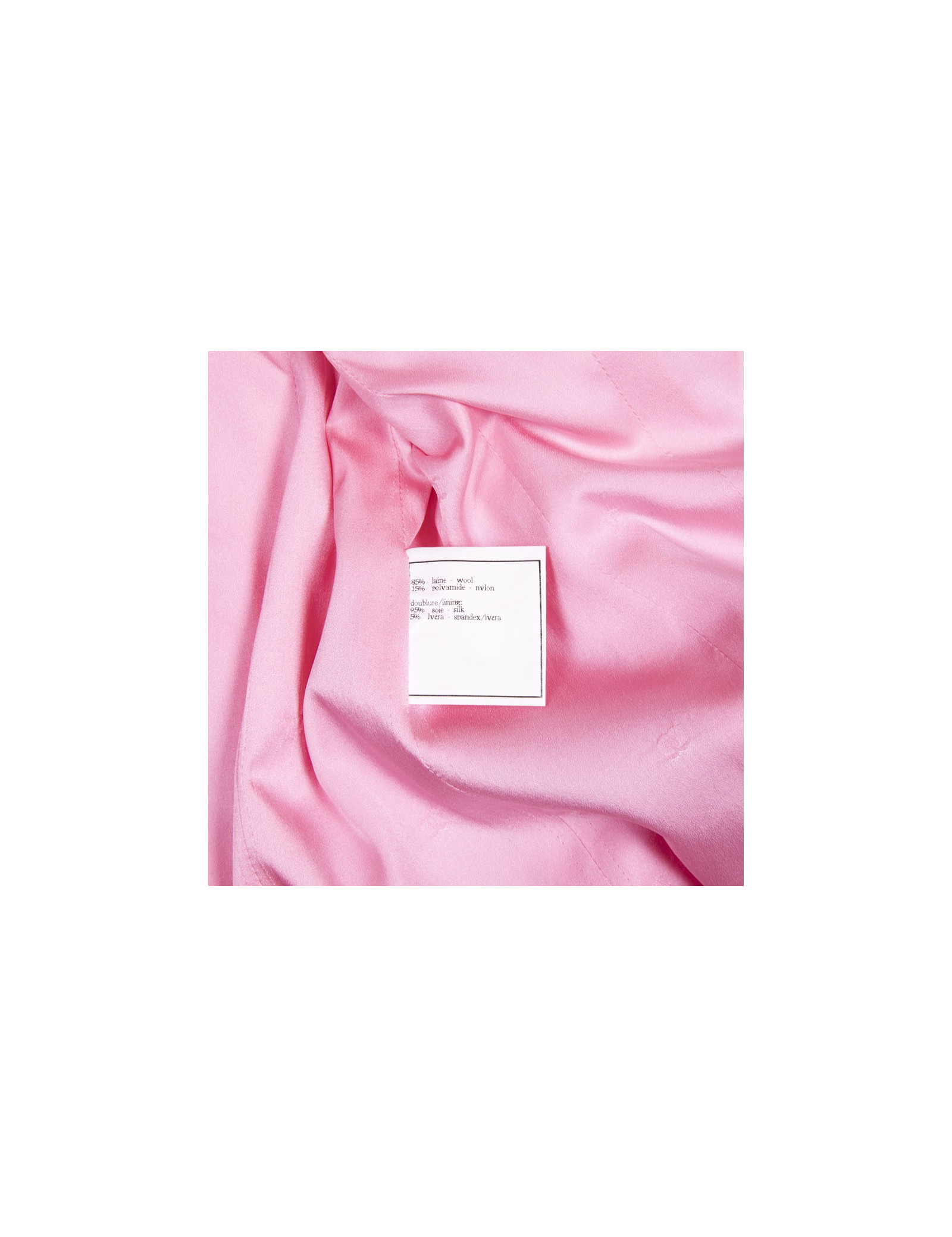 Veste Chanel en tweed en laine rose Collection Printemps-été 1997. Doublure en soie rose. Boutons roses avec signature CC dorée. Deux vraies poches sur le bas de la veste et deux fausses poches au niveau de la poitrine.