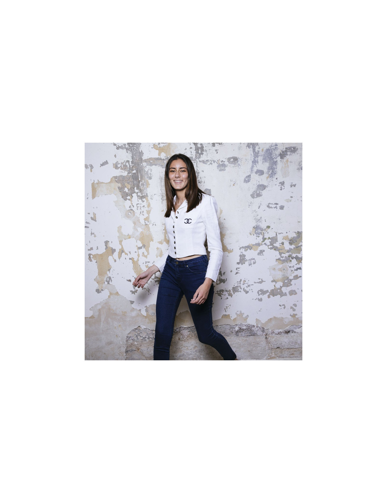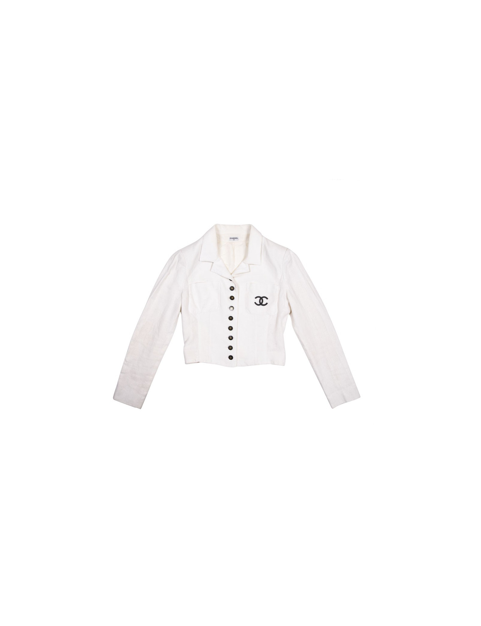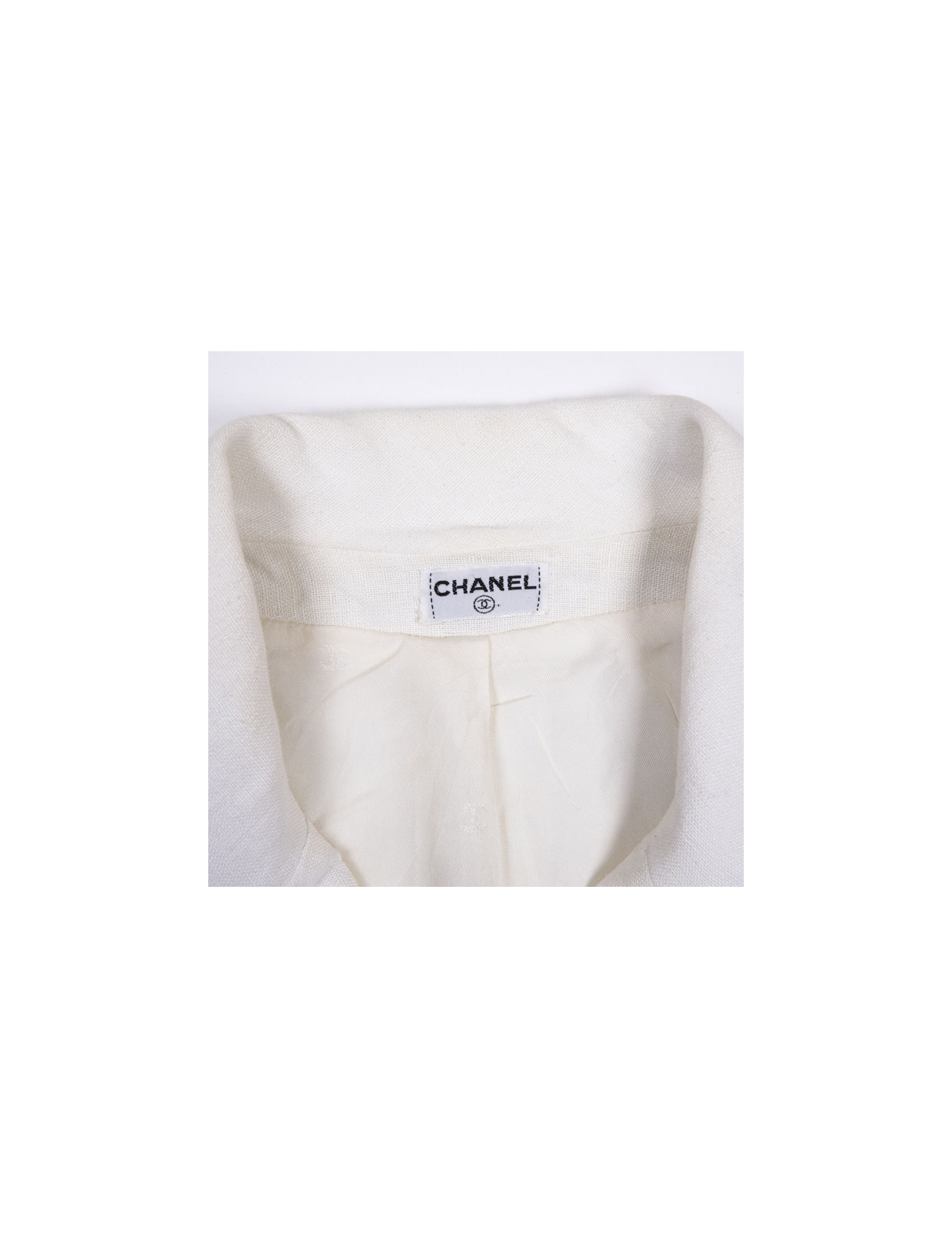 Veste CHANEL en lin écru, Deux poches plates. Boutons noirs avec signature CC dorée. Signature CC noire brodée sur l'une des poches. Doublure écrue 100% soie. Très bon état. Plus d'étiquette de taille et de composition.