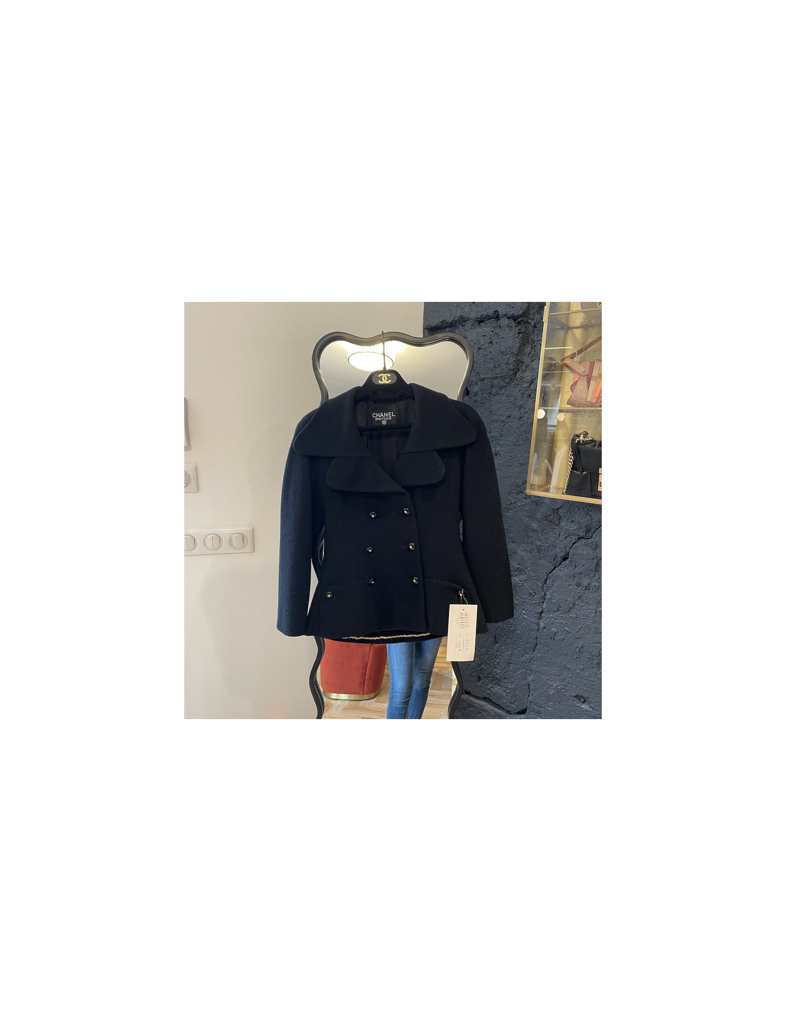Derniers articles en stock VESTES Veste CHANEL Automne 2008 T36 CHANEL 36122 3 300,00 € Veste CHANEL automne 2008 noire Condition : très bon étatPays de fabrication : FranceTaille : 36FRMatière : laineDoublure : 100% soieCouleur : noirDimensions à plat : épaules 38 cm, sous la poitrine 46 cm, hauteur 75 cm, longueur des manches 64 cm, tour de poignet 27 cmAnnée : Automne 2008Détails : Veste longue avec petits empiècements gris sur les... Ajouter au panier