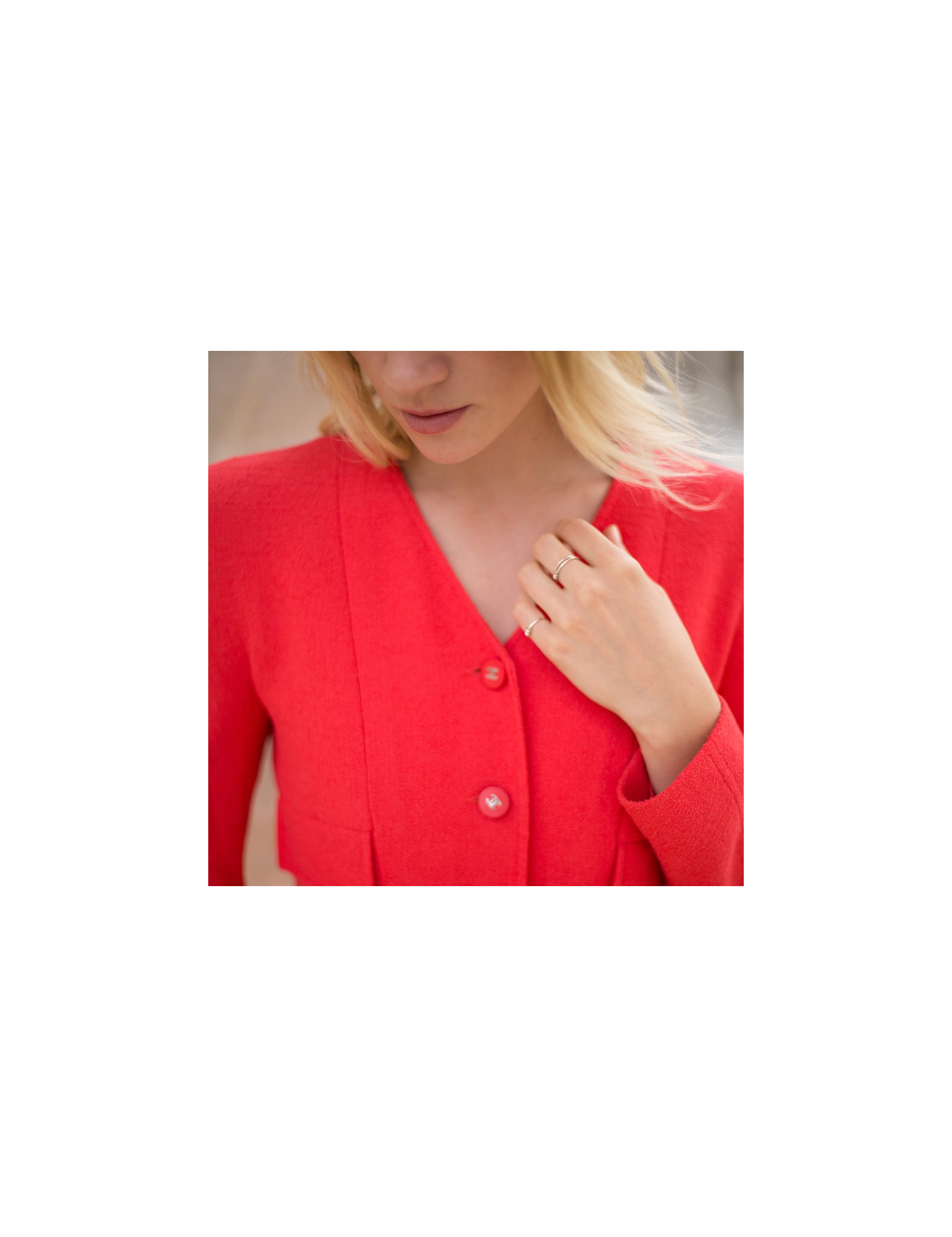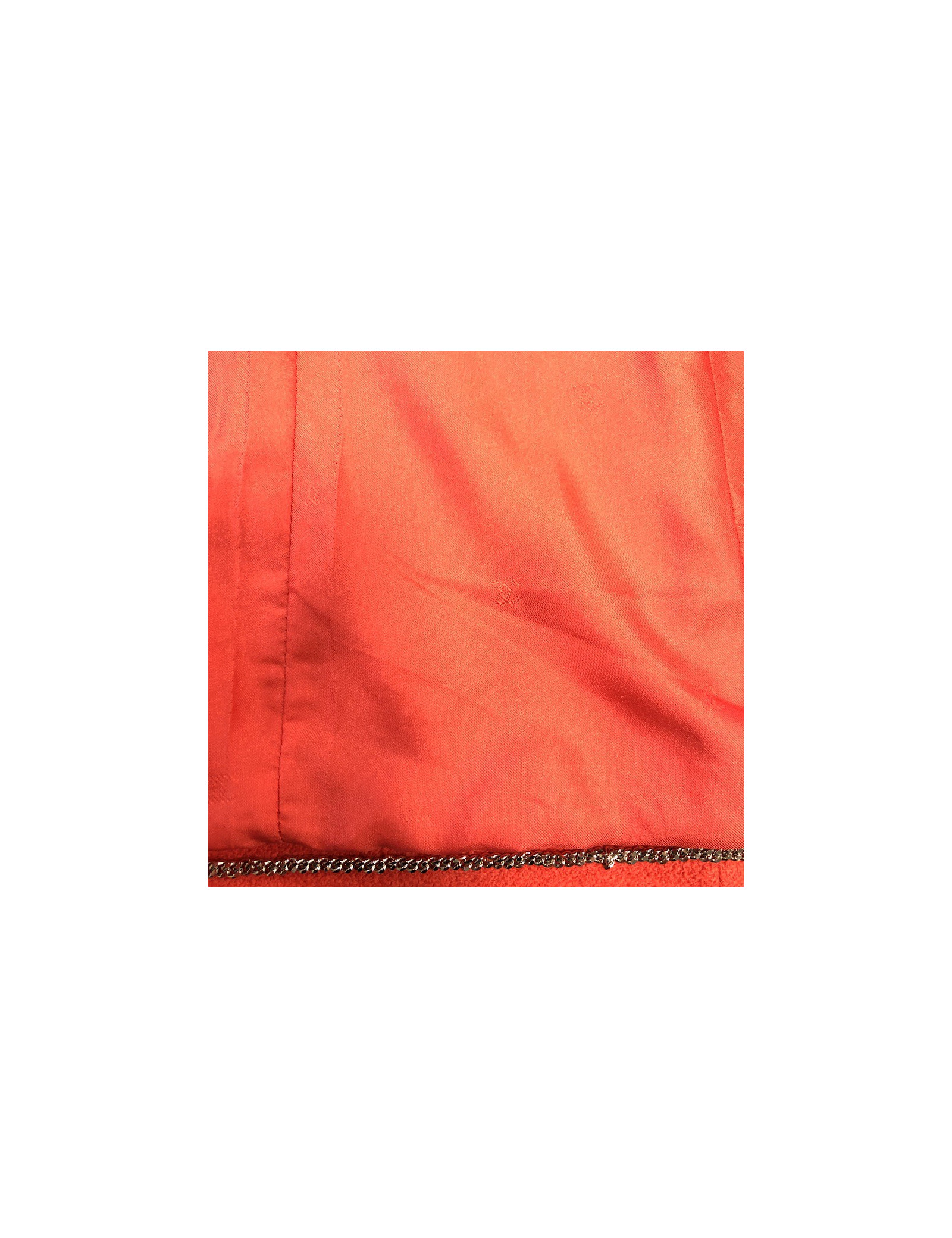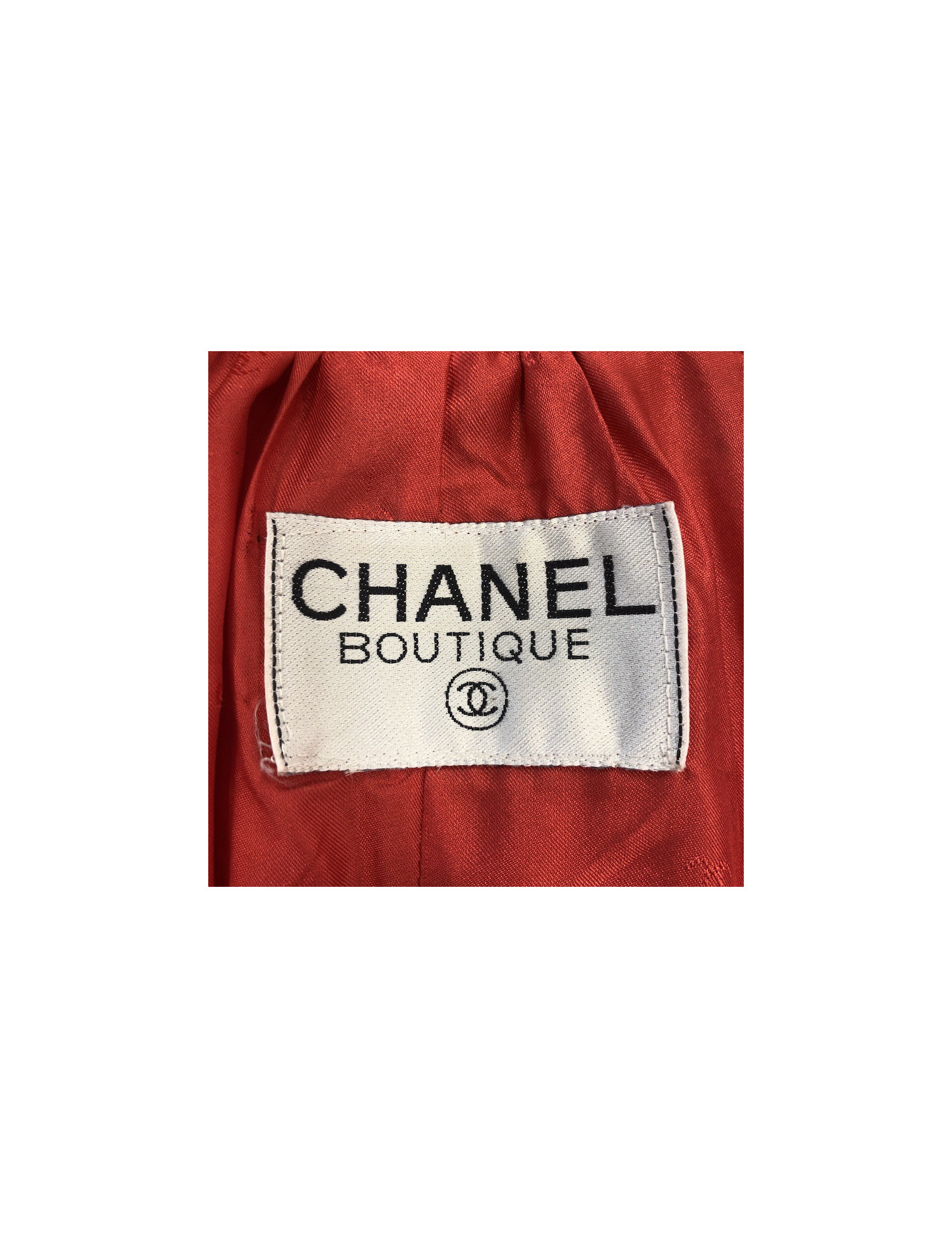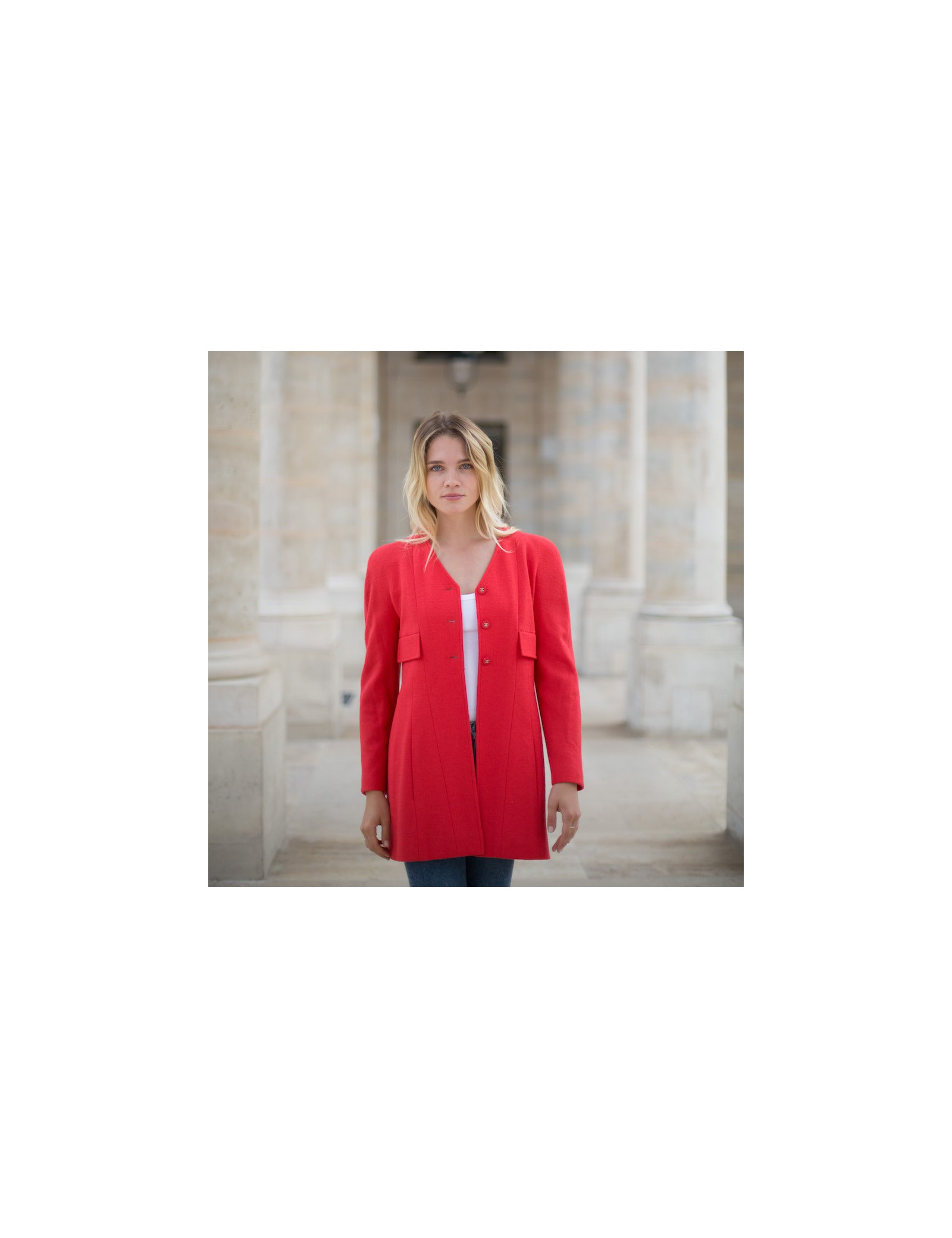 Veste longue corail manches raglan, CHANEL Vintage T40 est un véritable classique. Elle est signée Chanel Boutique. Intemporelle.. Elle est doublée de soie imprimée de "CC". Elle a une chaine argentée sur le bas de sa doublure, signature de la Maison. Deux revers sur 2 poches sur la poitrine et deux poches droites fente. Trois boutons signés "CC". Elle est en parfait état.