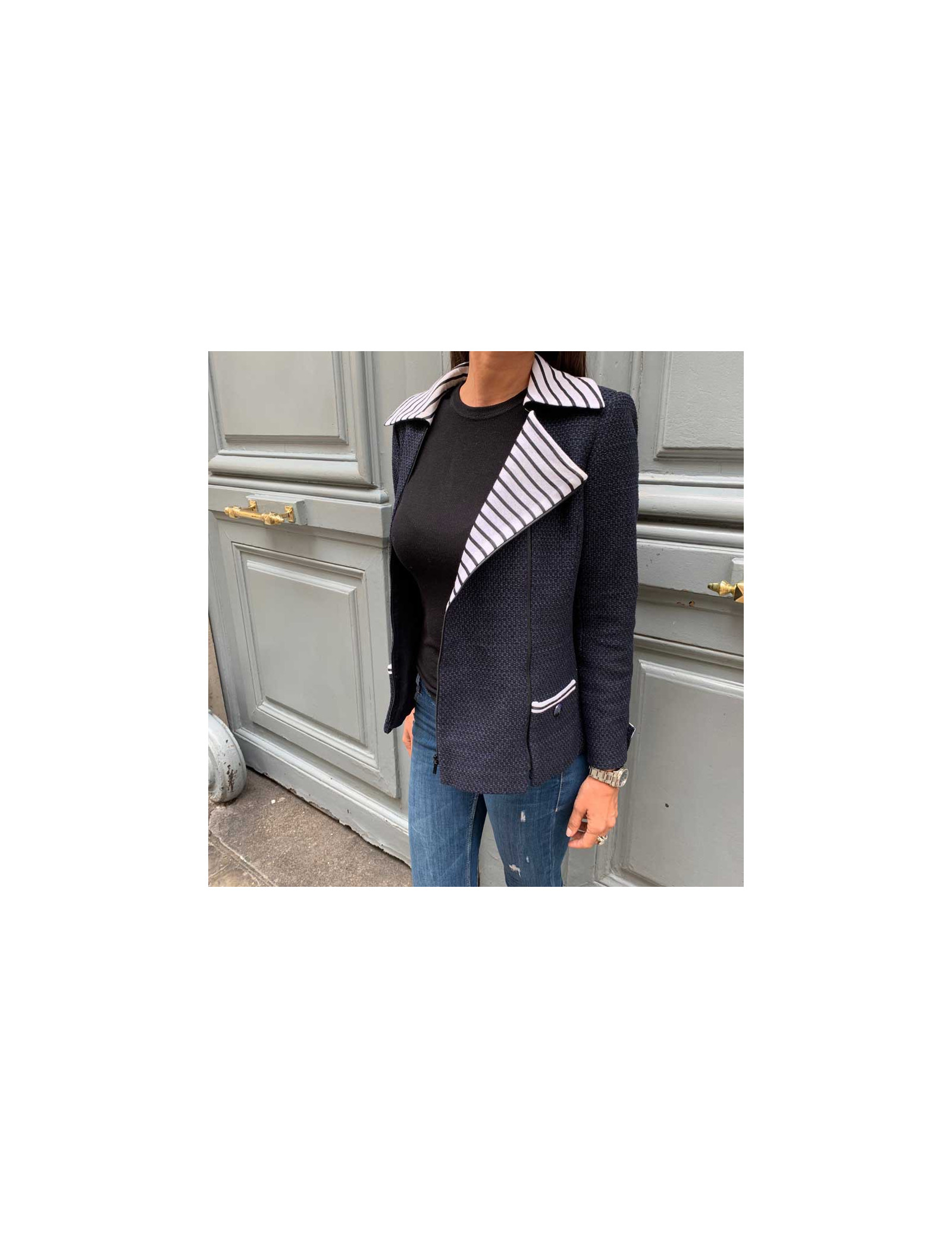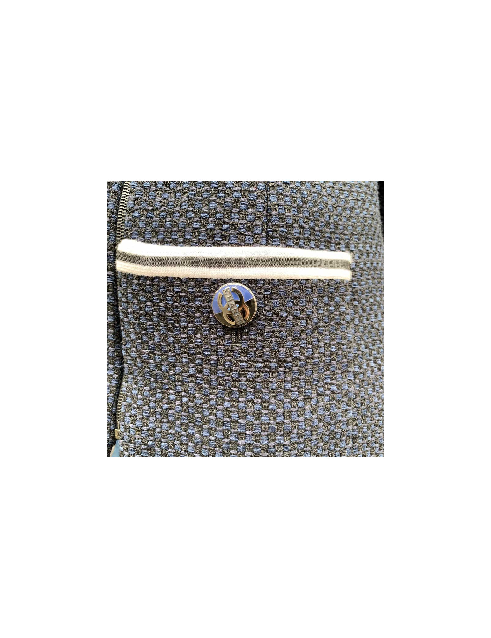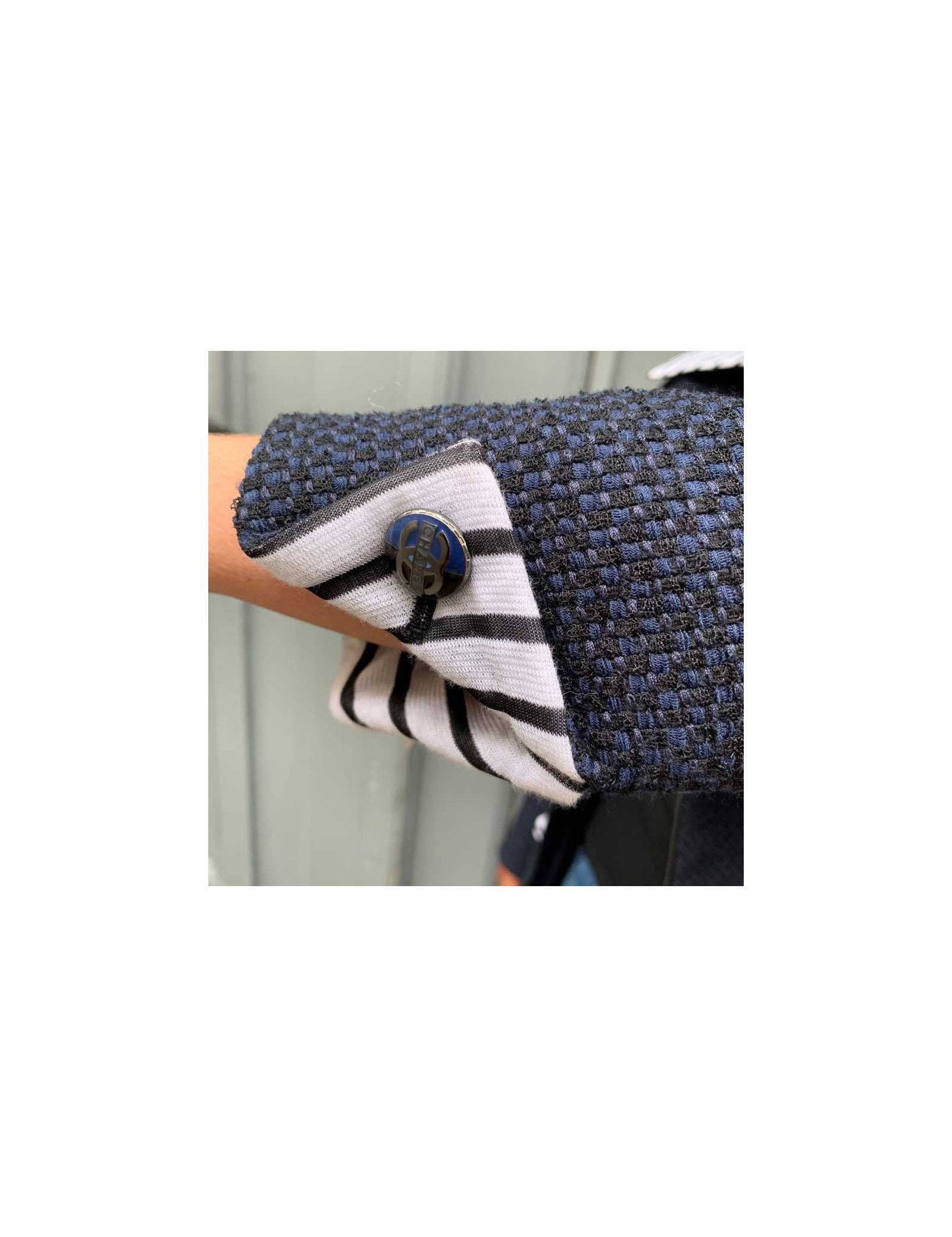 Ravissante veste Chanel T 36, en tweed bleu et noir, avec un panneau amovible, par fermeture éclair noire à l'avant. Les col ainsi que les poignets sont en coton rayé blanc et noir. La doublure siglée est en 100% soie bleue . Elle a son incontournable chaine argent tout autour du bas de la veste. Agréable à porter sur un jean's et un t-shirt blanc. Collection 2017. Elle n'a jamais été portée.
