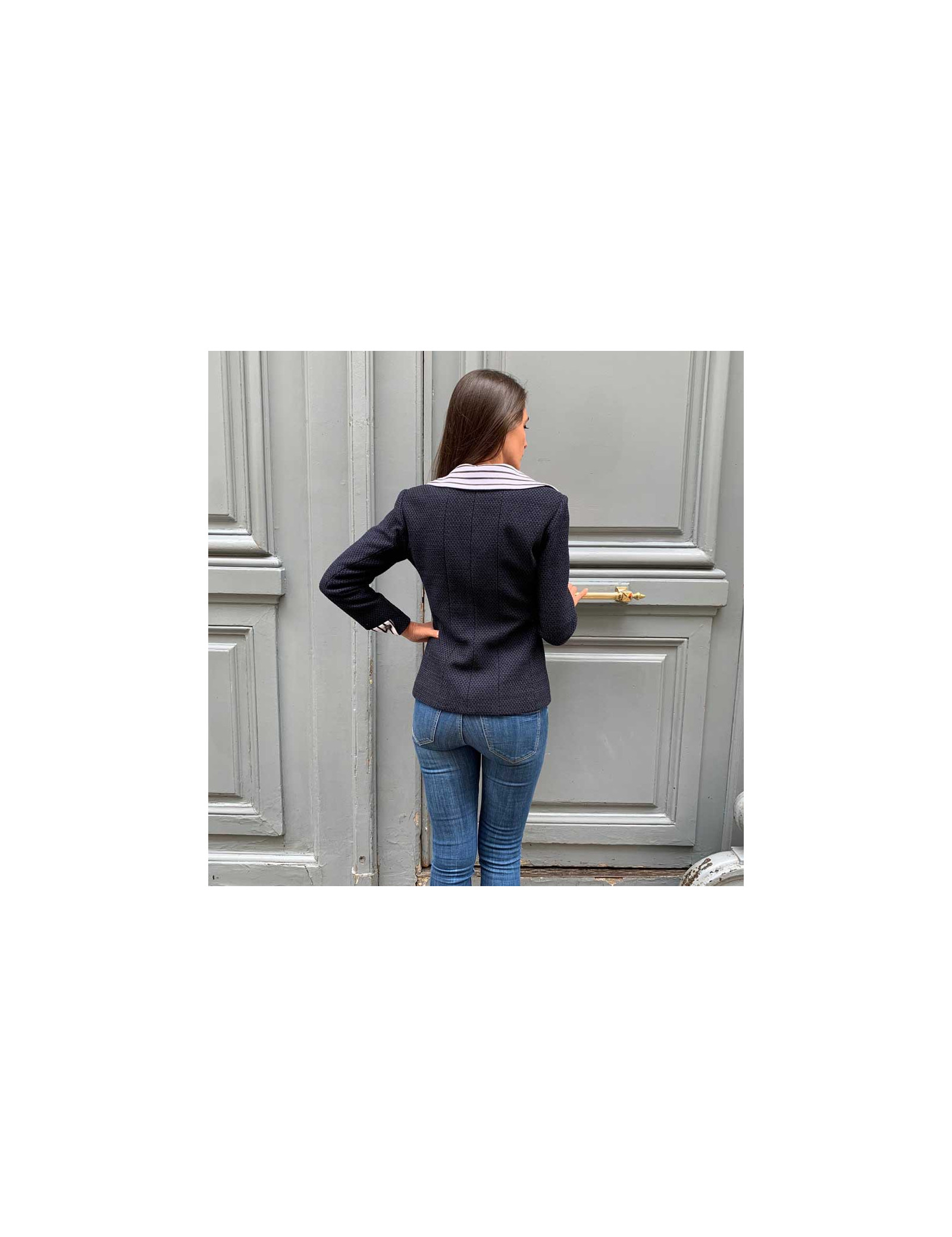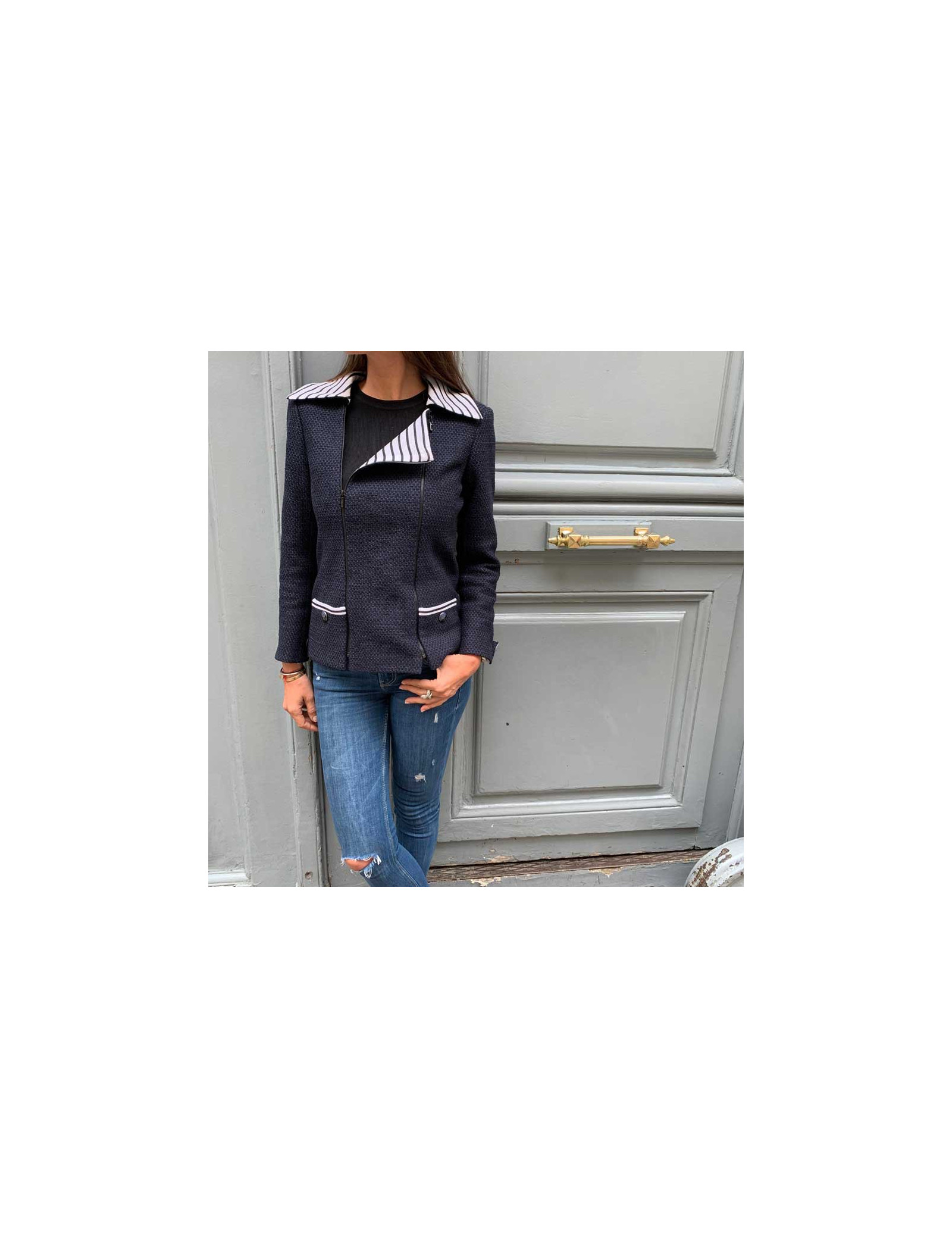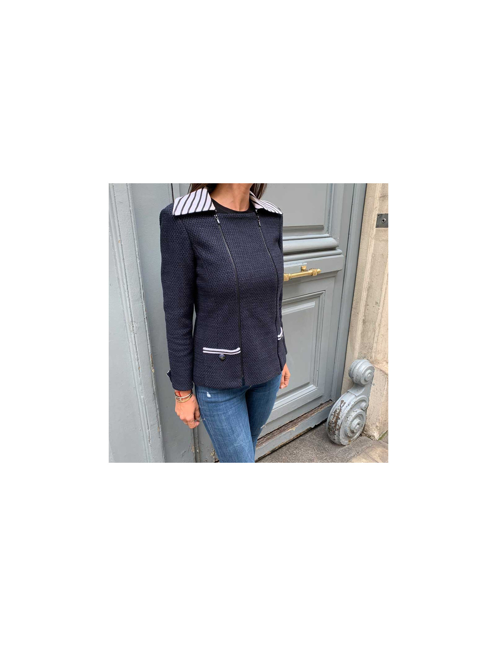 Ravissante veste Chanel T 36, en tweed bleu et noir, avec un panneau amovible, par fermeture éclair noire à l'avant. Les col ainsi que les poignets sont en coton rayé blanc et noir. La doublure siglée est en 100% soie bleue . Elle a son incontournable chaine argent tout autour du bas de la veste. Agréable à porter sur un jean's et un t-shirt blanc. Collection 2017. Elle n'a jamais été portée.