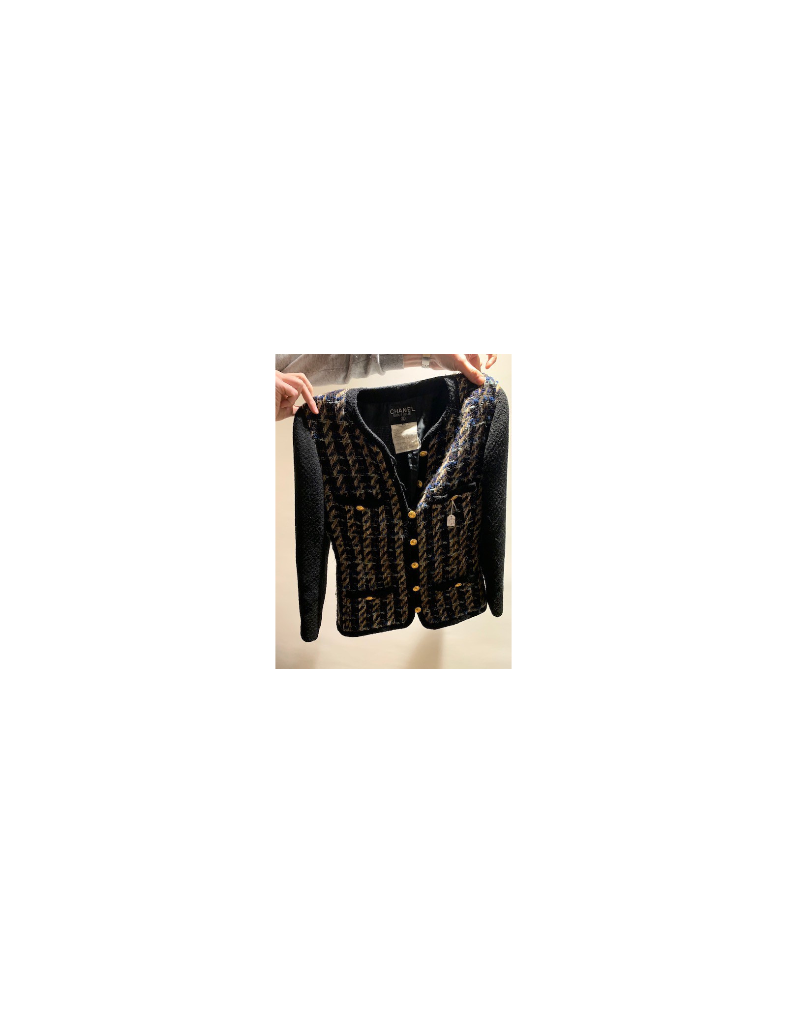Derniers articles en stock VESTES Veste T40 CHANEL Vintage CHANEL 35684 3 700,00 € Veste T40 CHANEL boutons CC Condition : très bon étatPays de fabrication : FranceTaille : 40Matière : tweedDoublure : soie noire monogramméeCouleur : bleu marine, noir, écruDimensions à plat : épaules 40 cm, sous la poitrine 48 cm, hauteur 72 cm, longueur des manches 55 cm, tour de poignet 25 cmAnnée : vintageDétails : deux poches, magnifiques boutons... Ajouter au panier