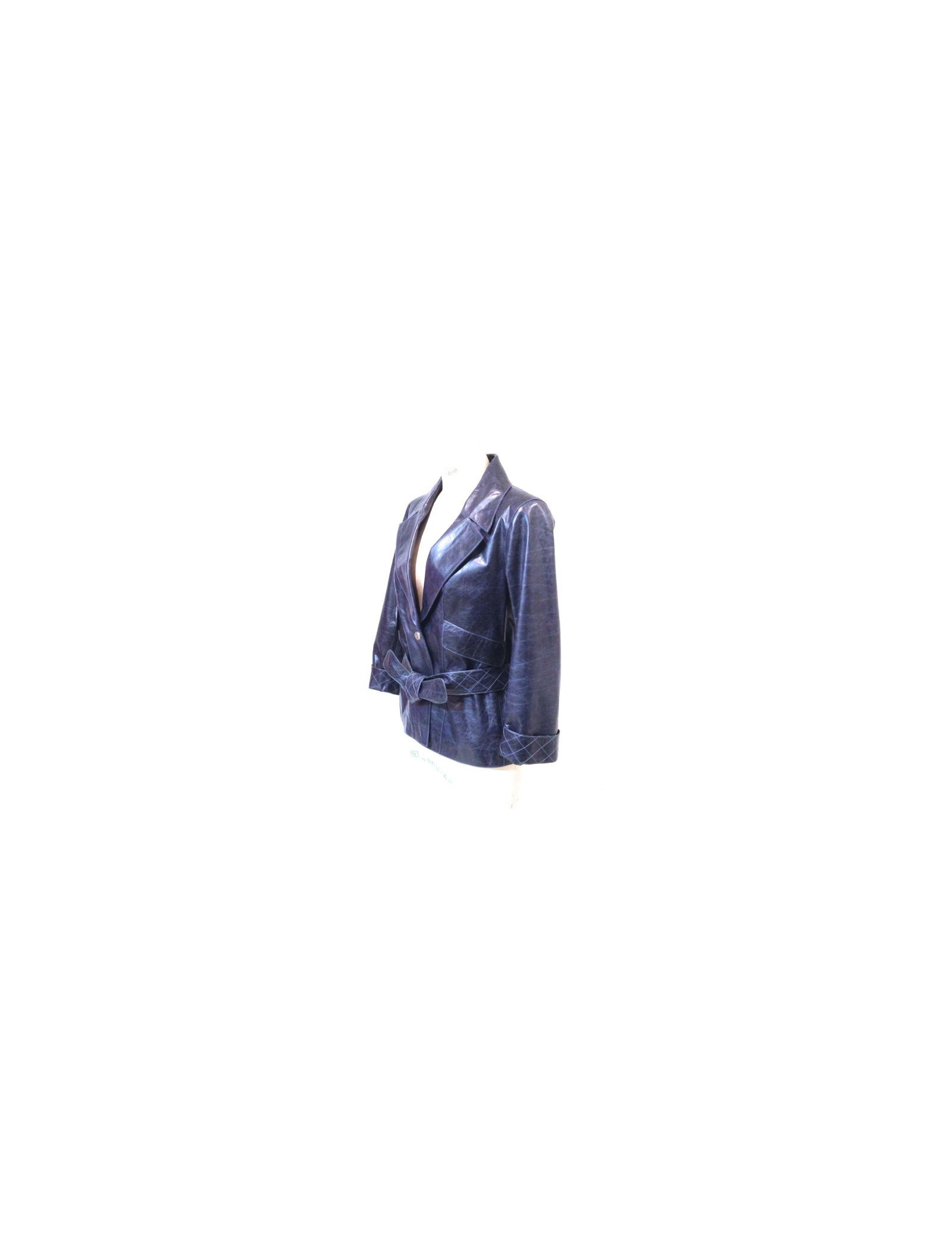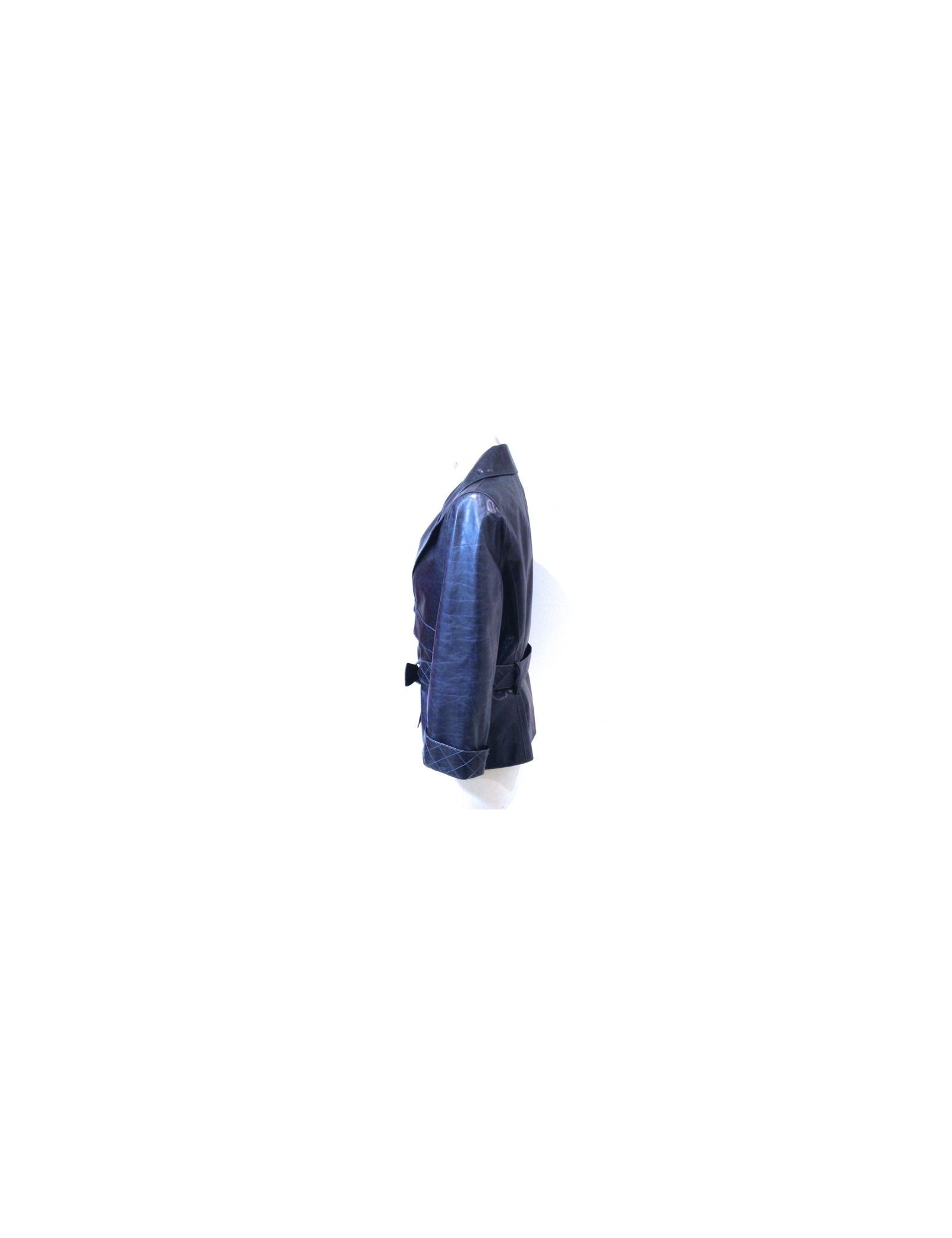 Veste CHANEL en cuir de veau bleu délavé. Les manches ont un joli revers matelassé. Deux grandes poches à rabat. Ceinture matelassée avec passants le dos. Doublure intérieure en soie imprimée noire et bleu. En très bon état.