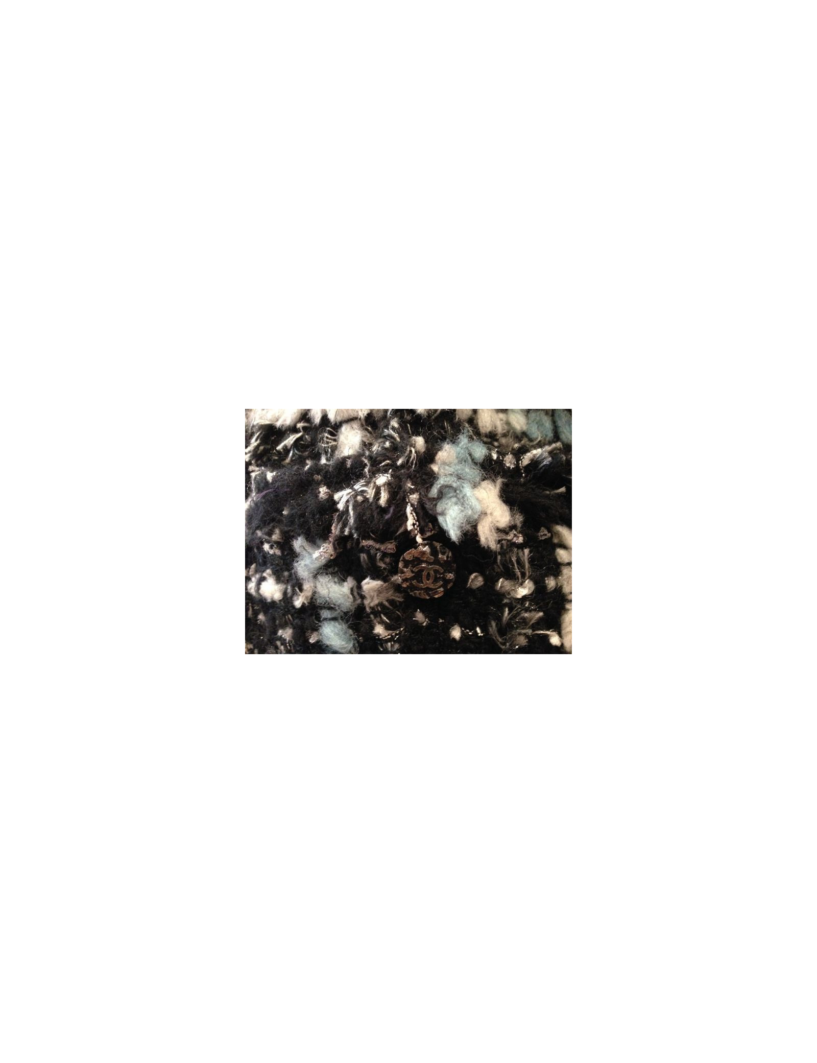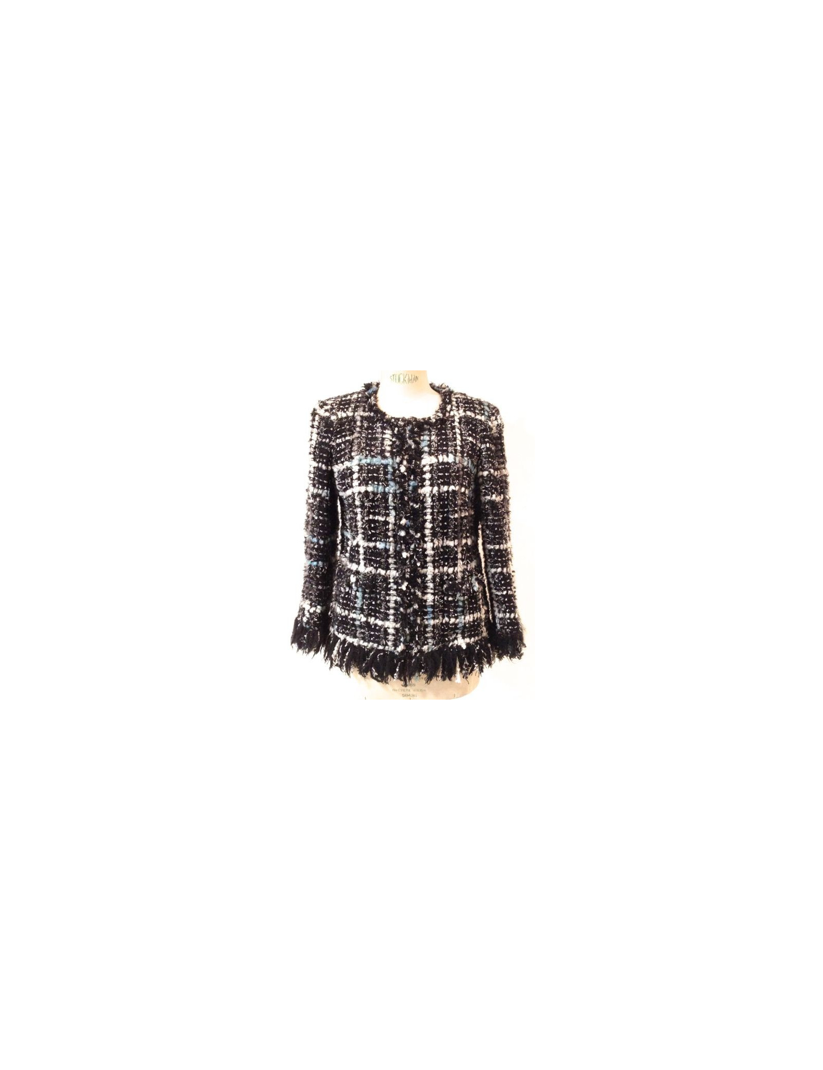 Veste CHANEL en tweed noir, blanc, et turquoise T 42