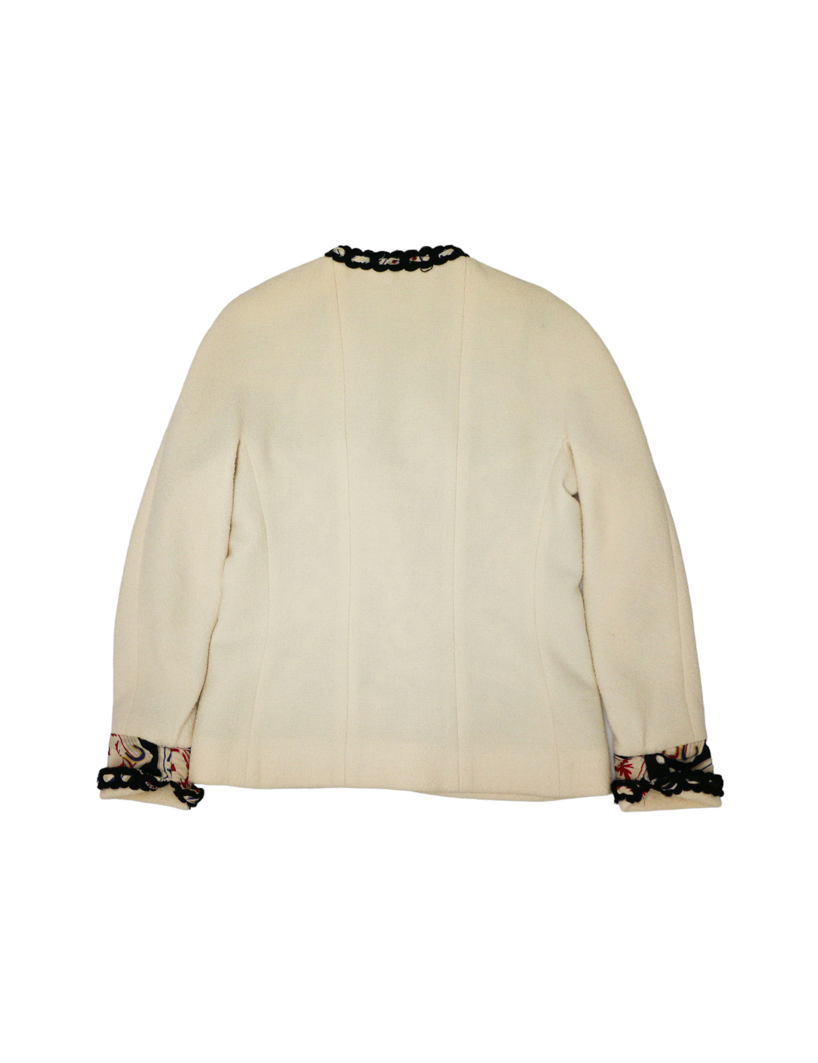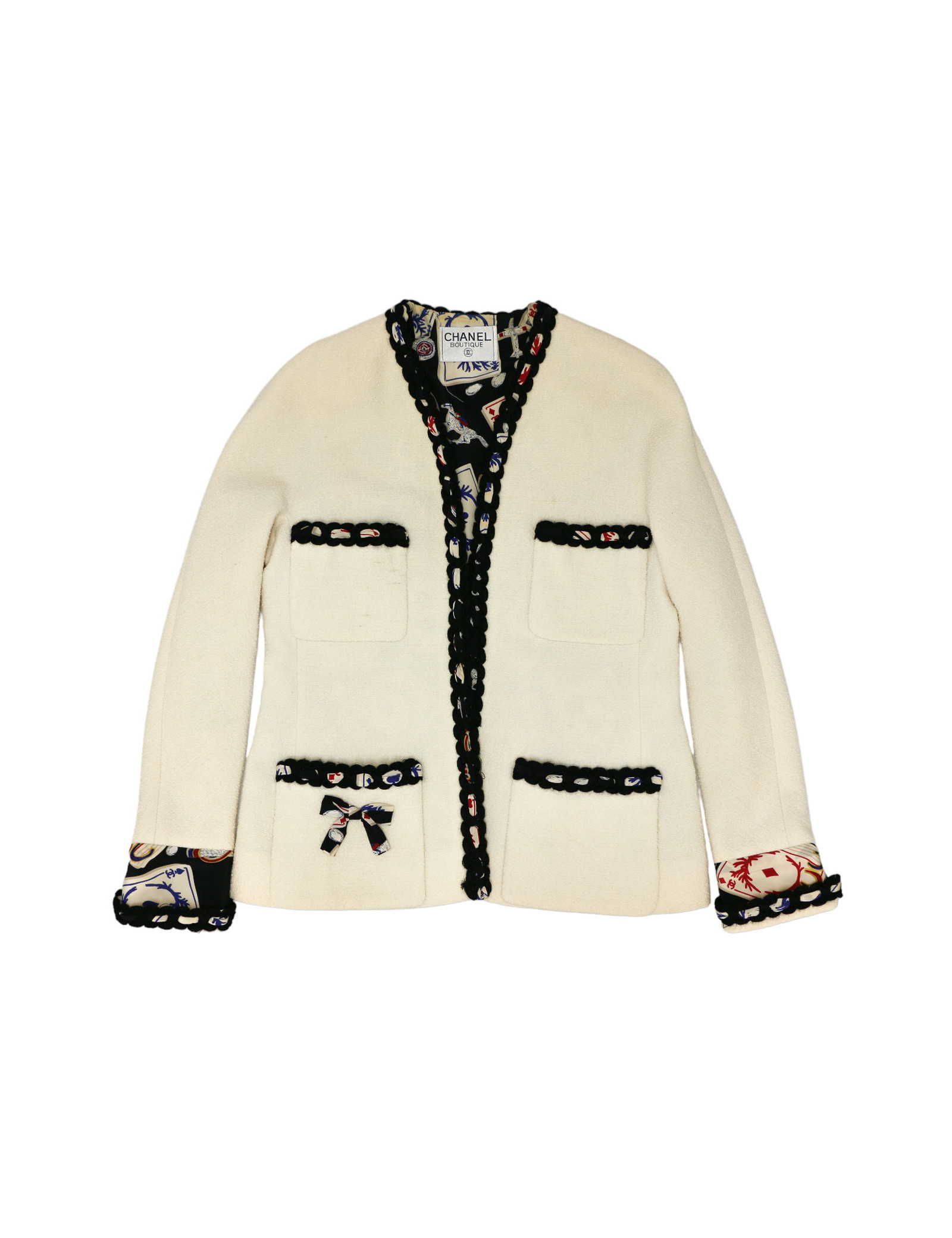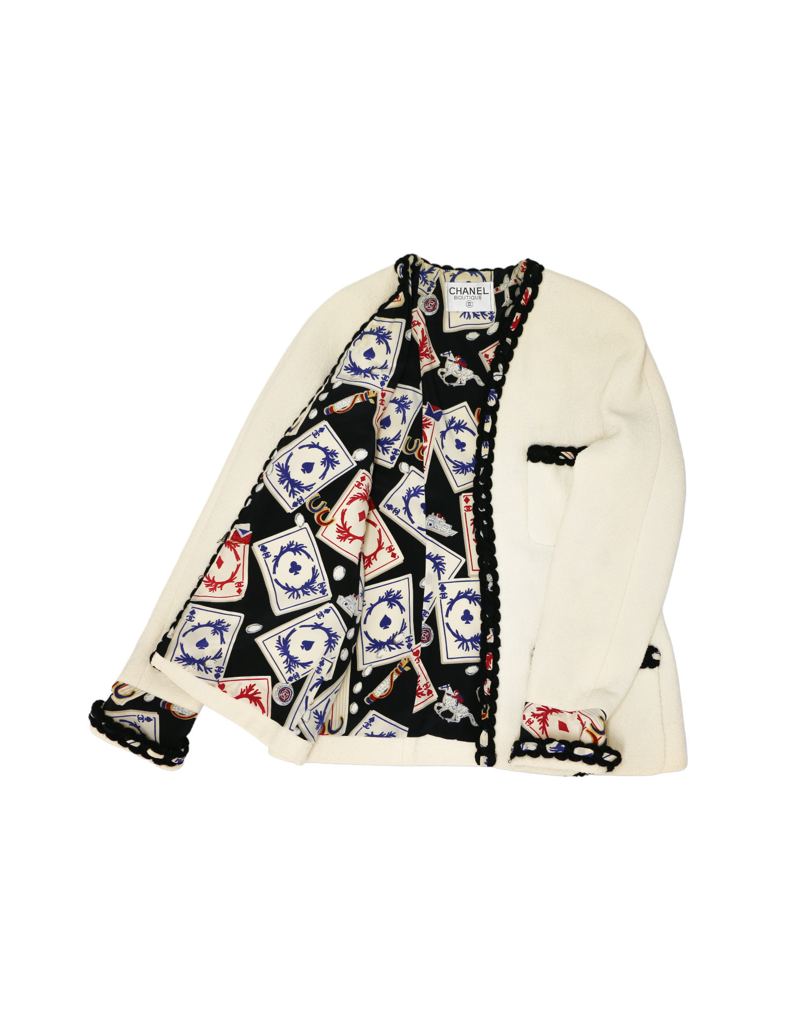 Détails : Veste à 4 poches gansée de tweed noir tressé de soie blanche, rouge et bleu. La doublure en soie qui nous rappelle les jeux de cartes. Elle est en très bon état extérieure mais la doublure intérieure présente des traces jaunies autour du cou due au temps et au niveau des aisselles une déchirure. Nous la plaçons donc dans la catégorie bon état