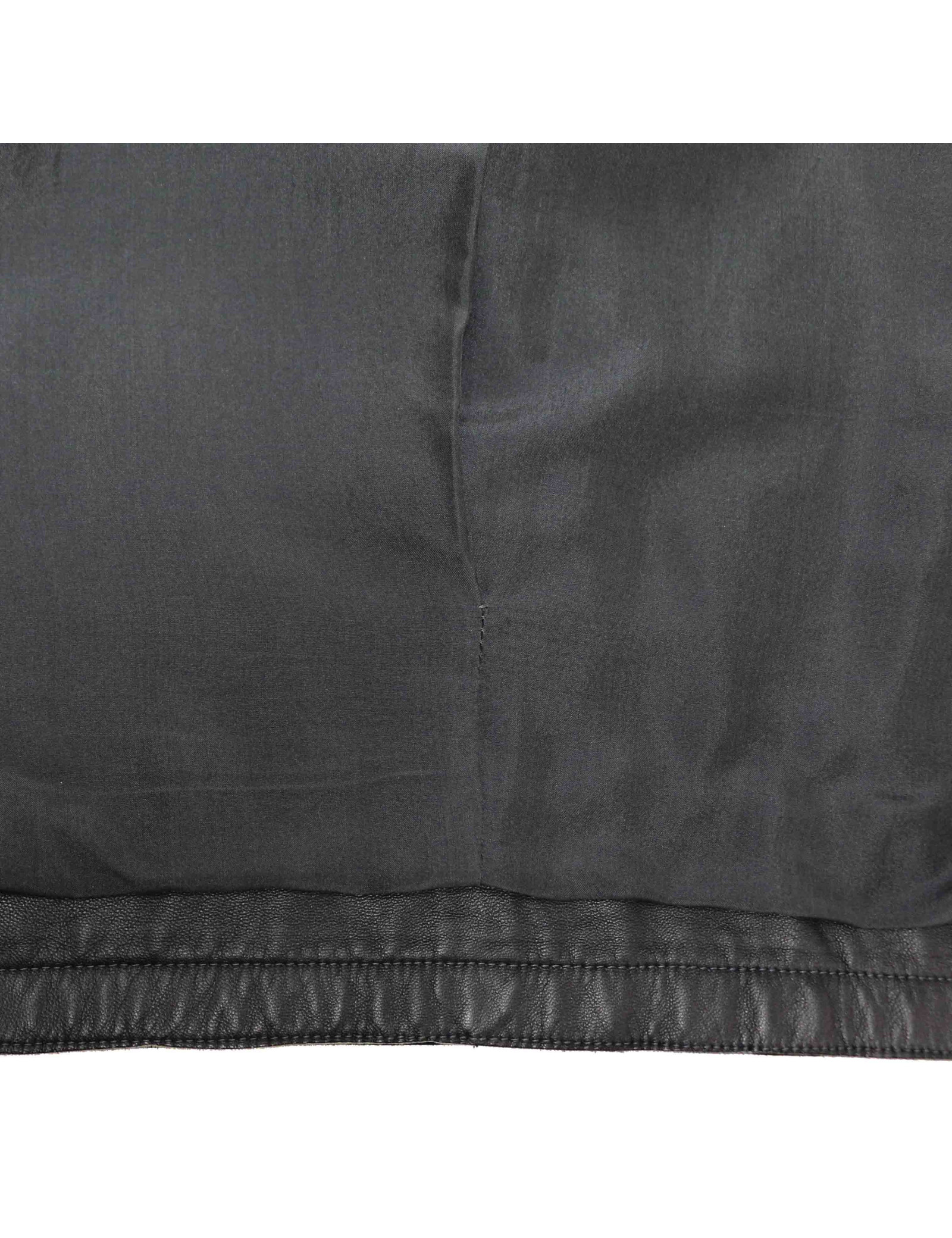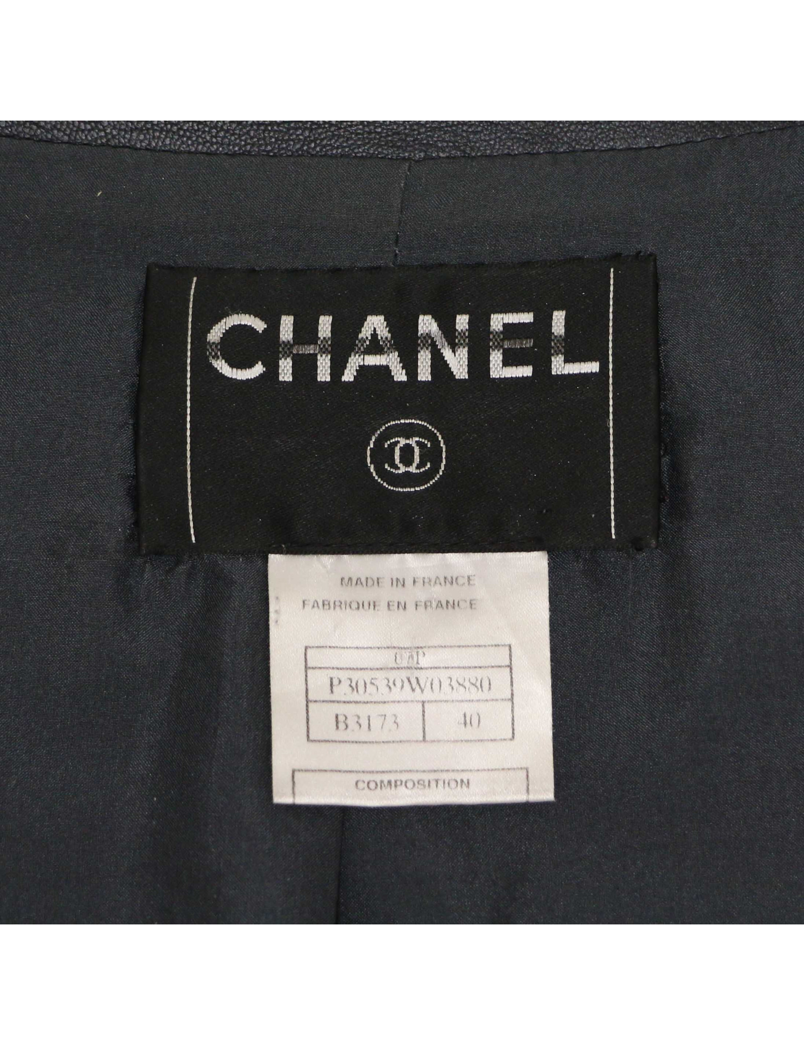 Détails : veste en cuir d'agneau gansée de cuir vernis noir. Elle a 4 poches et 12 boutons en émail bleu et métal argent qui sont siglés CC au milieu.