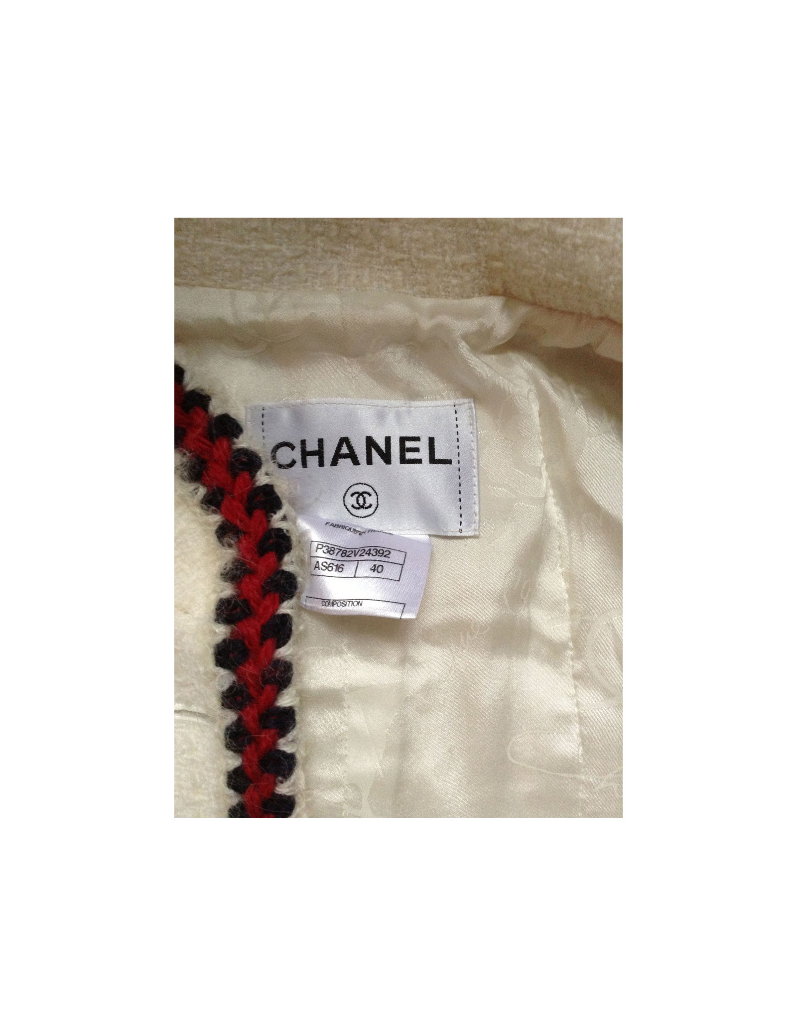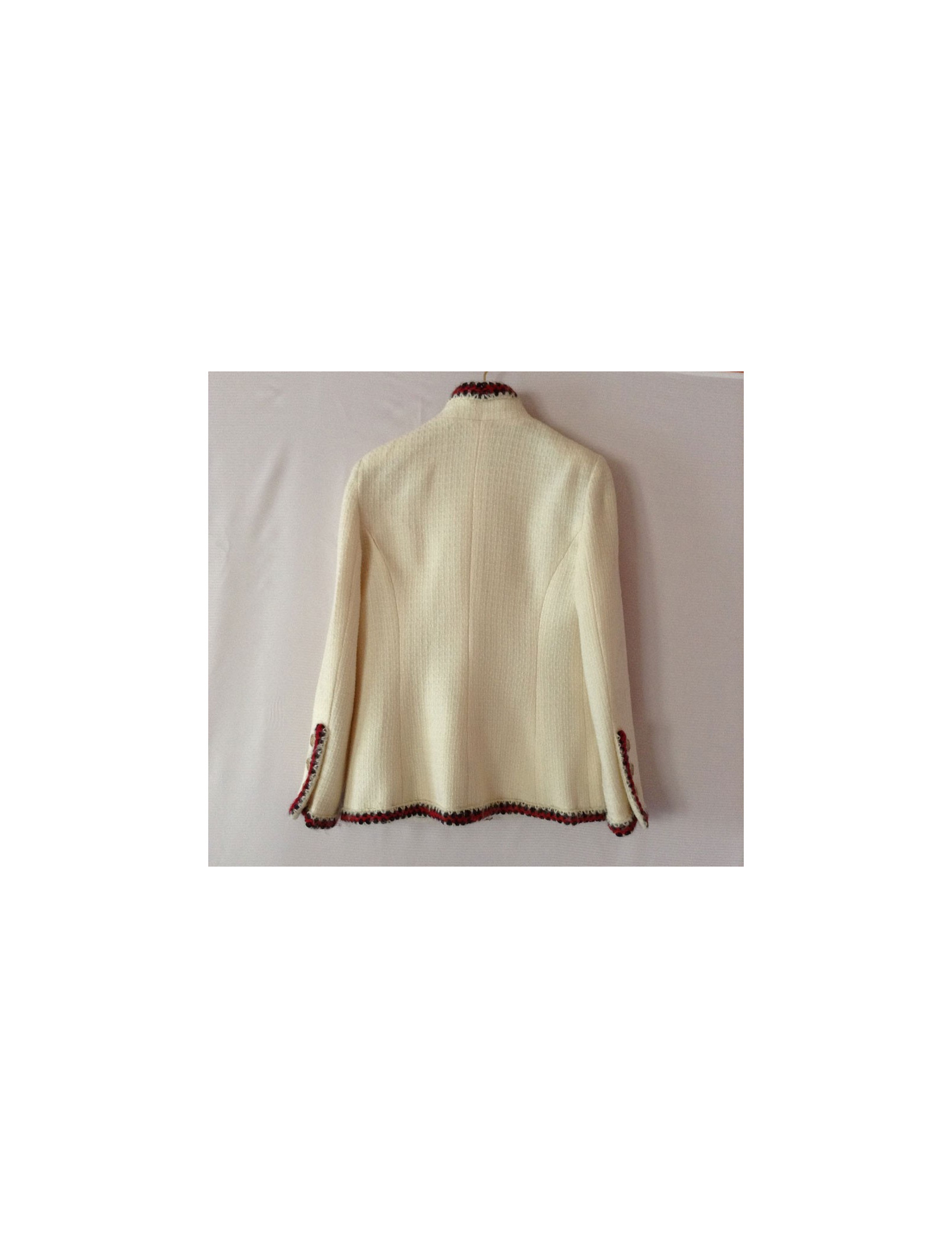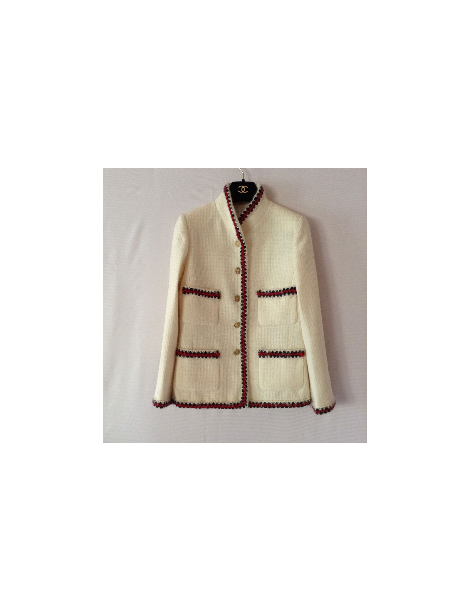 Veste Chanel courte T40, 100% laine, modèle ajusté, de couleur "off White", avec ses 4 poches plaquées, ses boutons assortis dorés, sa petite chaînette surpiquée à l'intérieur de la taille, ses finitions en fils de laine rouge et marine sur un fond "off White" sur les poches, les poignets et le contour de taille, donne un look Très "Mademoiselle Chanel" Comme le dit si bien Karl Lagerfeld " il y a des choses qui ne passent jamais de mode dans la mode: le jean, une chemise blanche, une veste Chanel. La doublure est un mélange de soie 86% et d'elasthanne 14%.