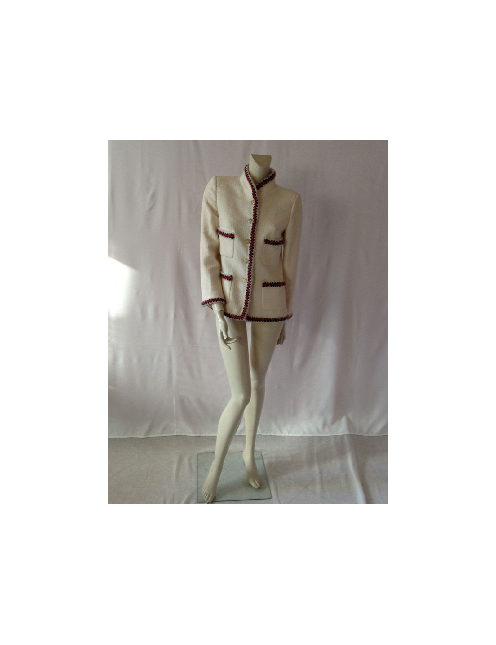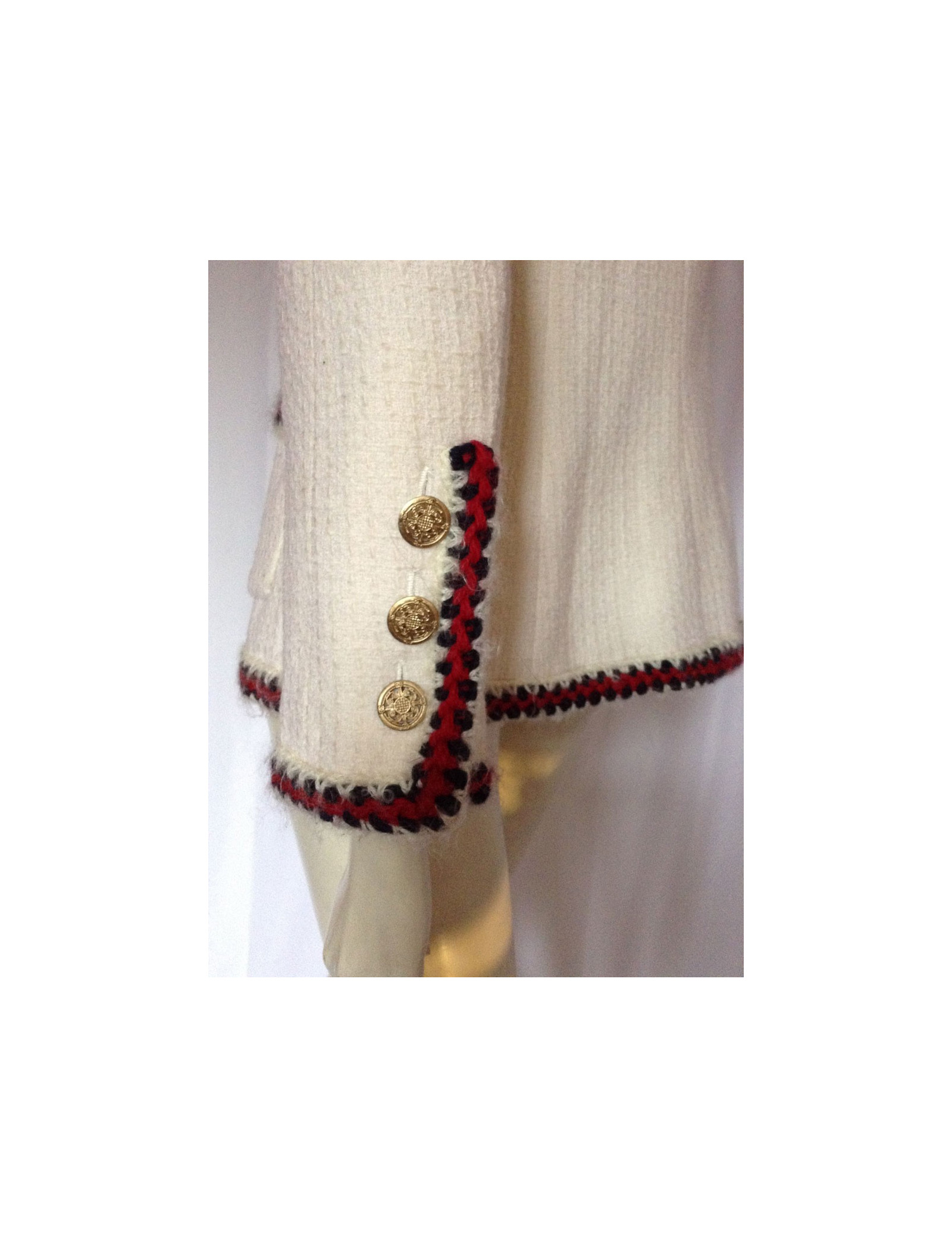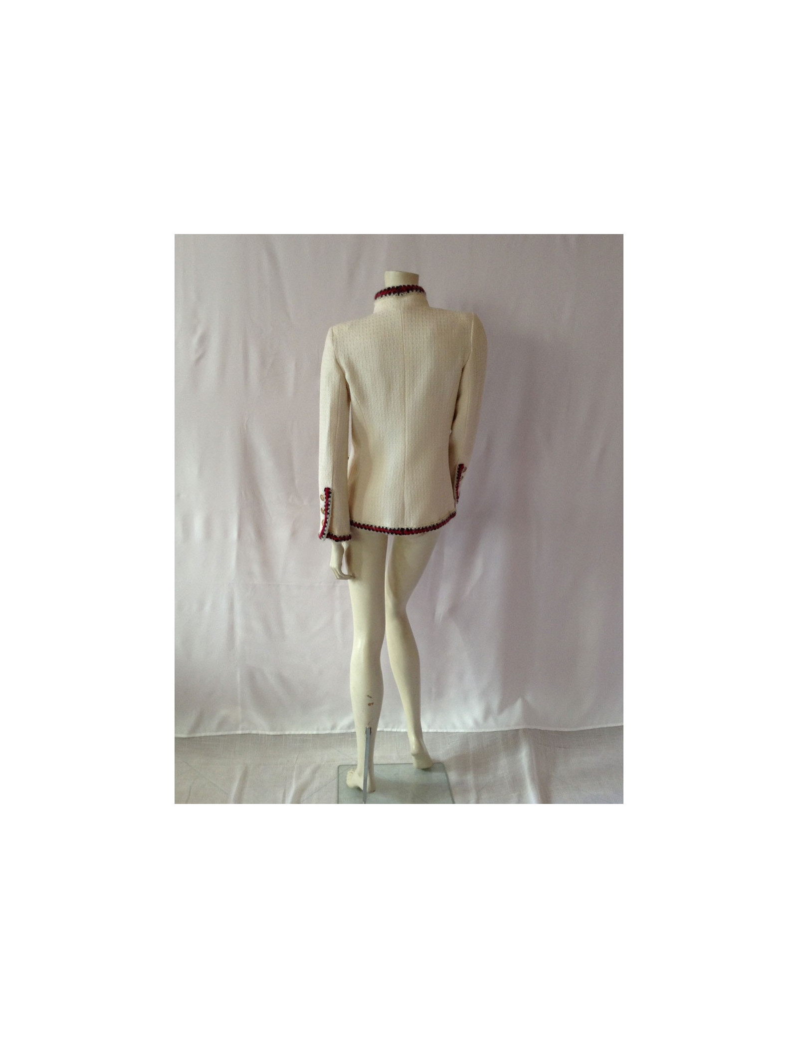 Veste Chanel courte T40, 100% laine, modèle ajusté, de couleur "off White", avec ses 4 poches plaquées, ses boutons assortis dorés, sa petite chaînette surpiquée à l'intérieur de la taille, ses finitions en fils de laine rouge et marine sur un fond "off White" sur les poches, les poignets et le contour de taille, donne un look Très "Mademoiselle Chanel" Comme le dit si bien Karl Lagerfeld " il y a des choses qui ne passent jamais de mode dans la mode: le jean, une chemise blanche, une veste Chanel. La doublure est un mélange de soie 86% et d'elasthanne 14%.