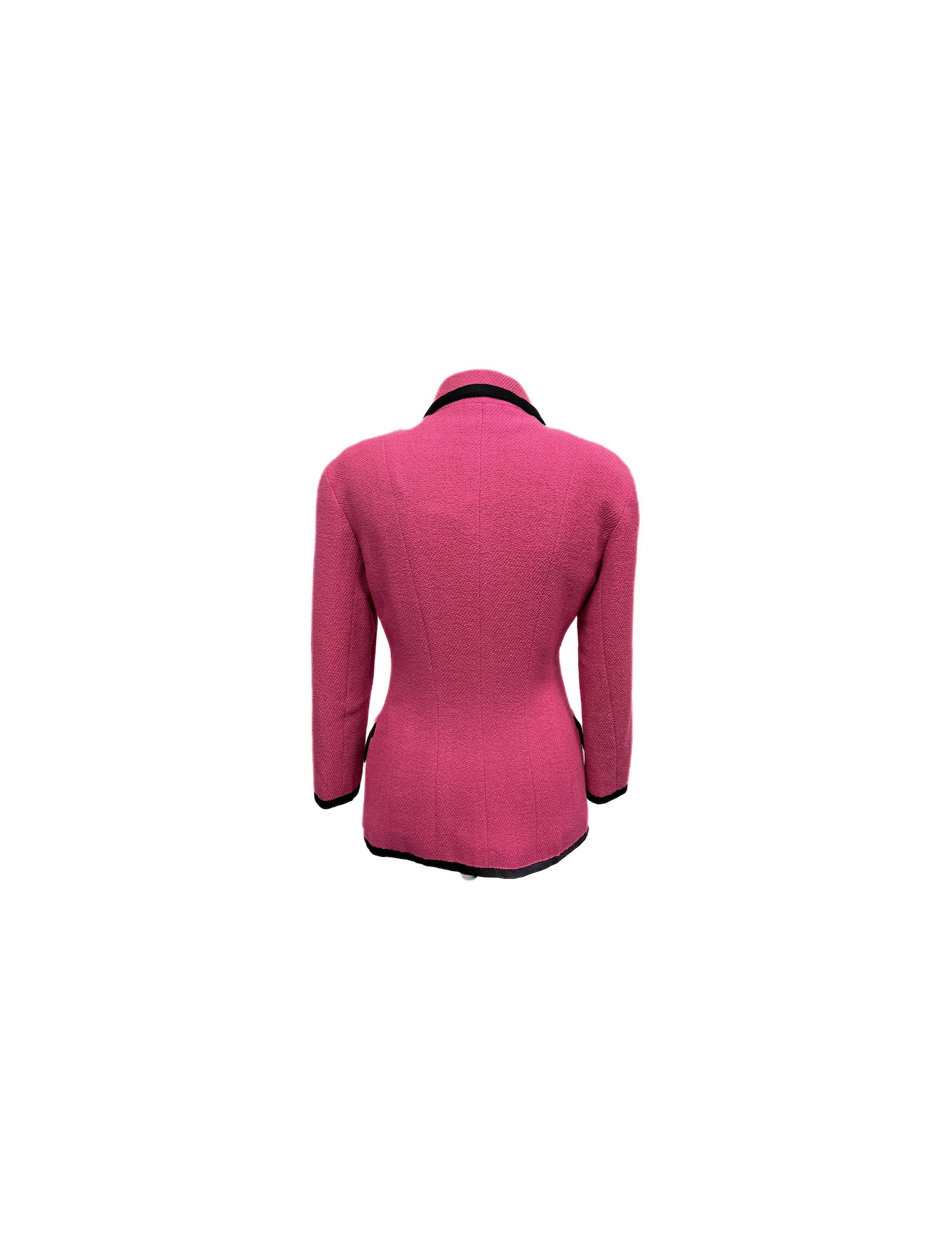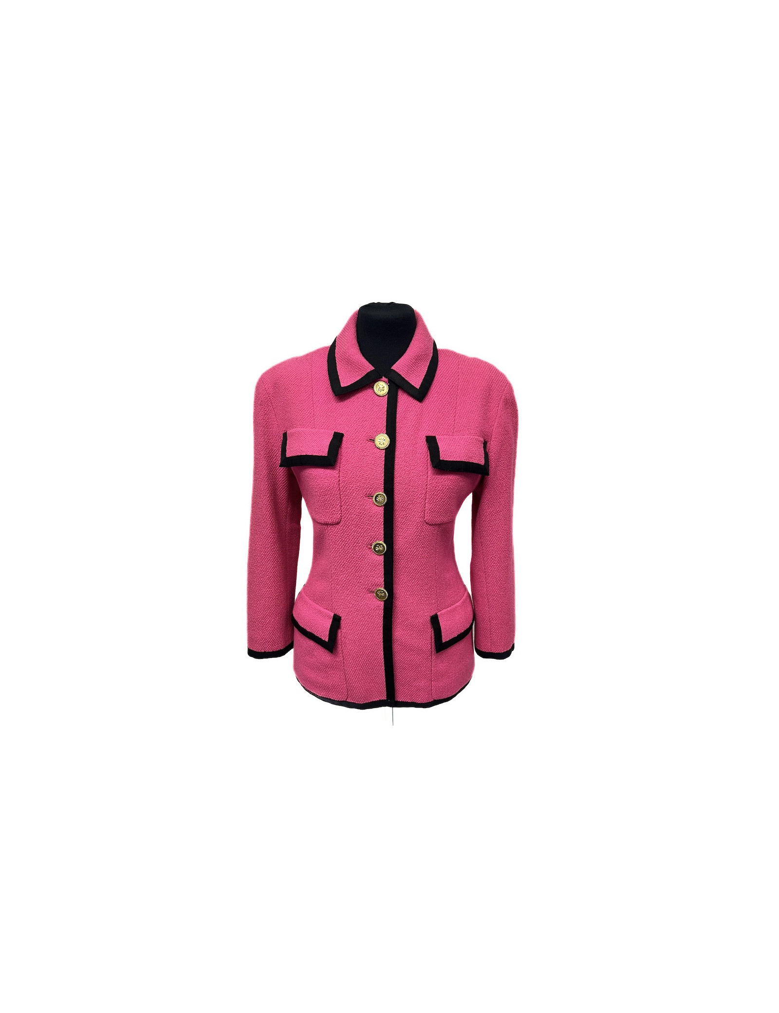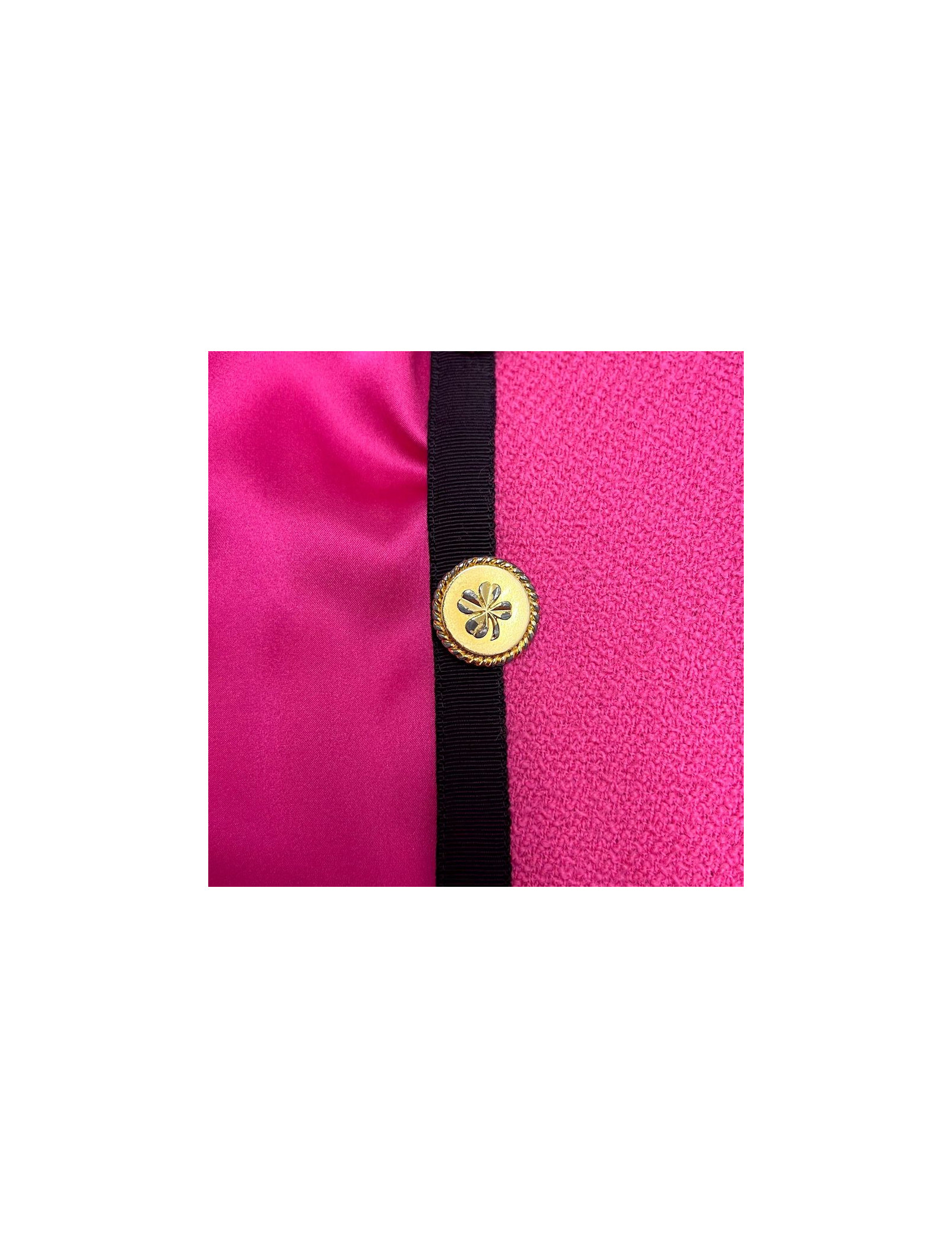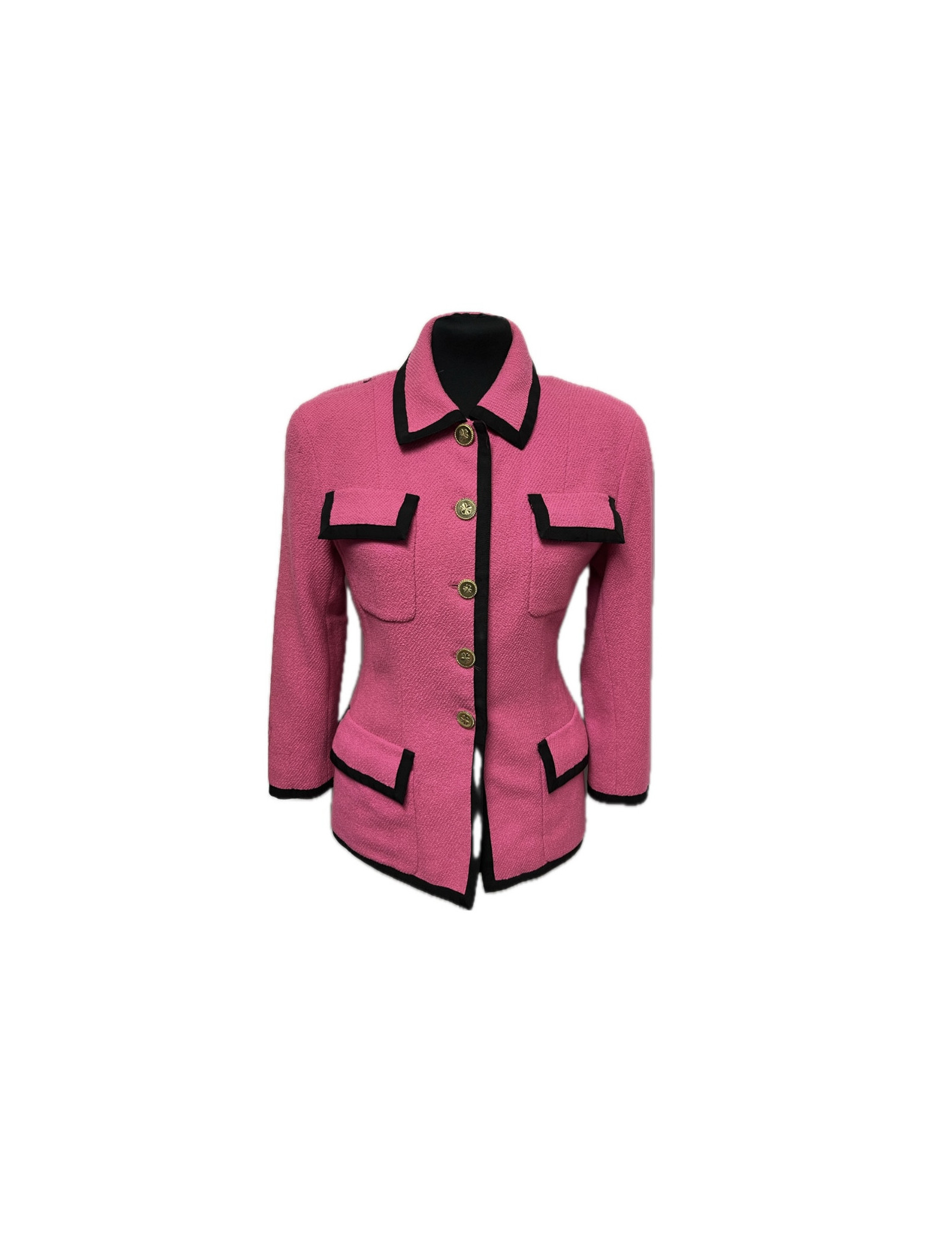 Détails : vintage, veste Chanel en tweed rose gansée d'une bande de gros grain noir avec 4 poches. Fermeture par 5 boutons dorés (signature au dos de chaque bouton) au motif trèfle symbole de la Maison de couture. De légères traces sont visibles sur le tissu.