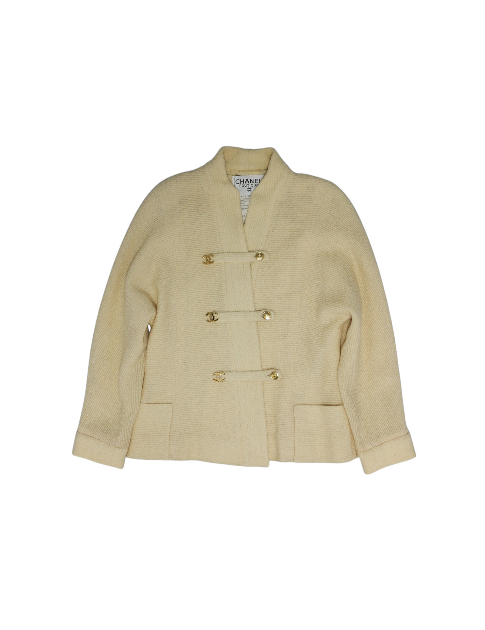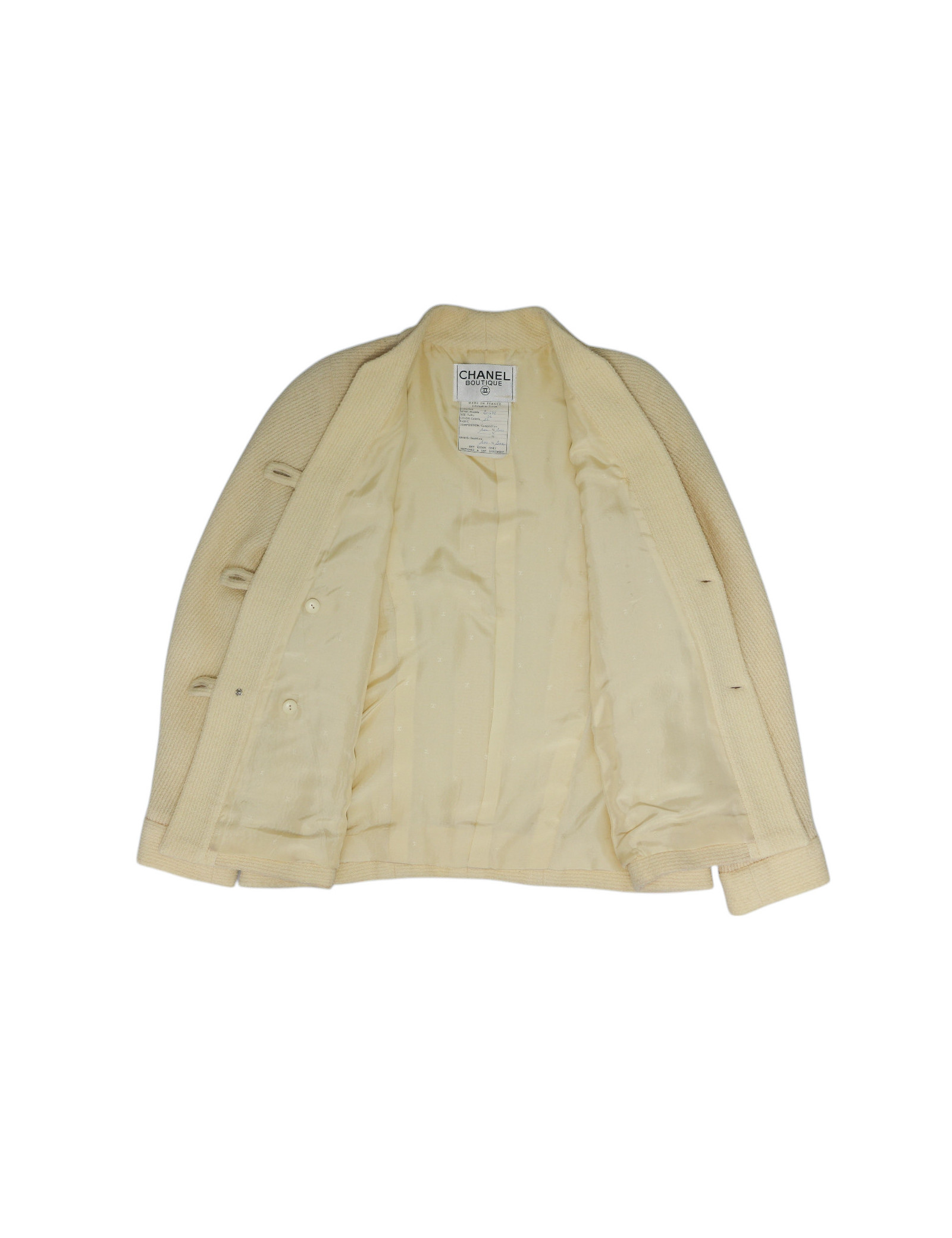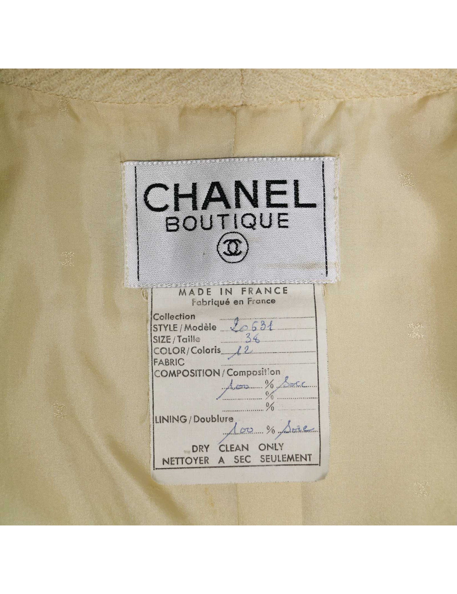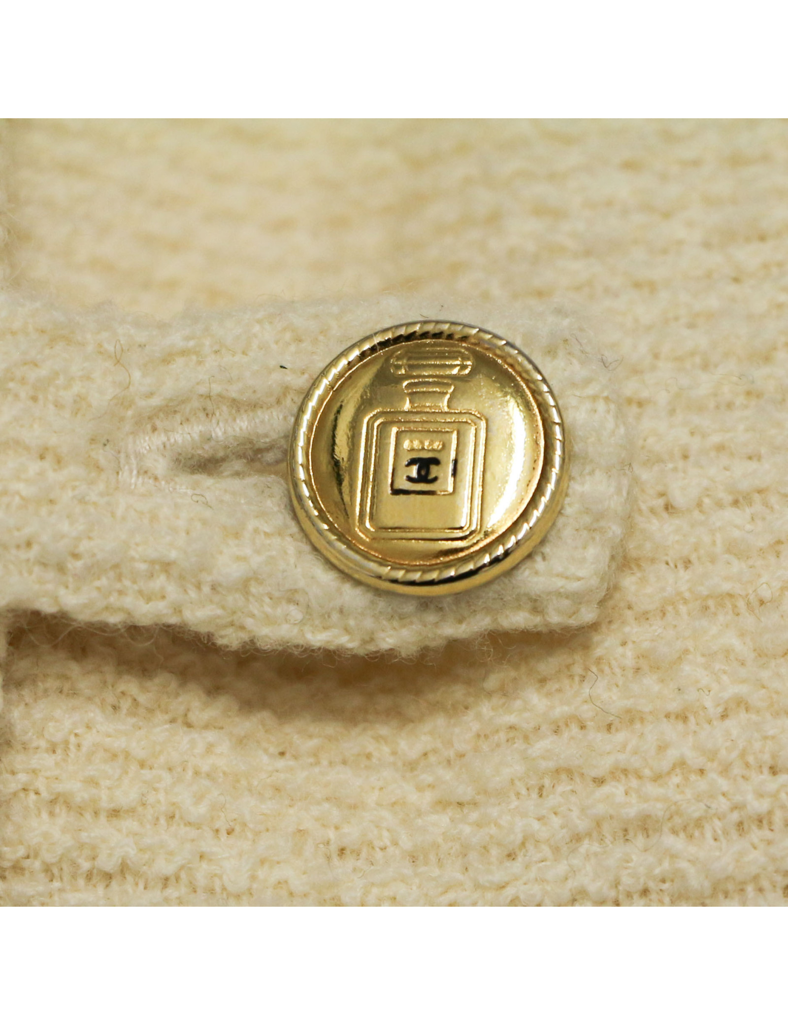 Détails : Fermeture par 3 boutons représentant une bouteille de parfum sont fixés sur des bandes en tweed assorti avec au bout de chacune un CC doré, cela ajoute un détail structuré au devant de la veste. Aucune tache visible.