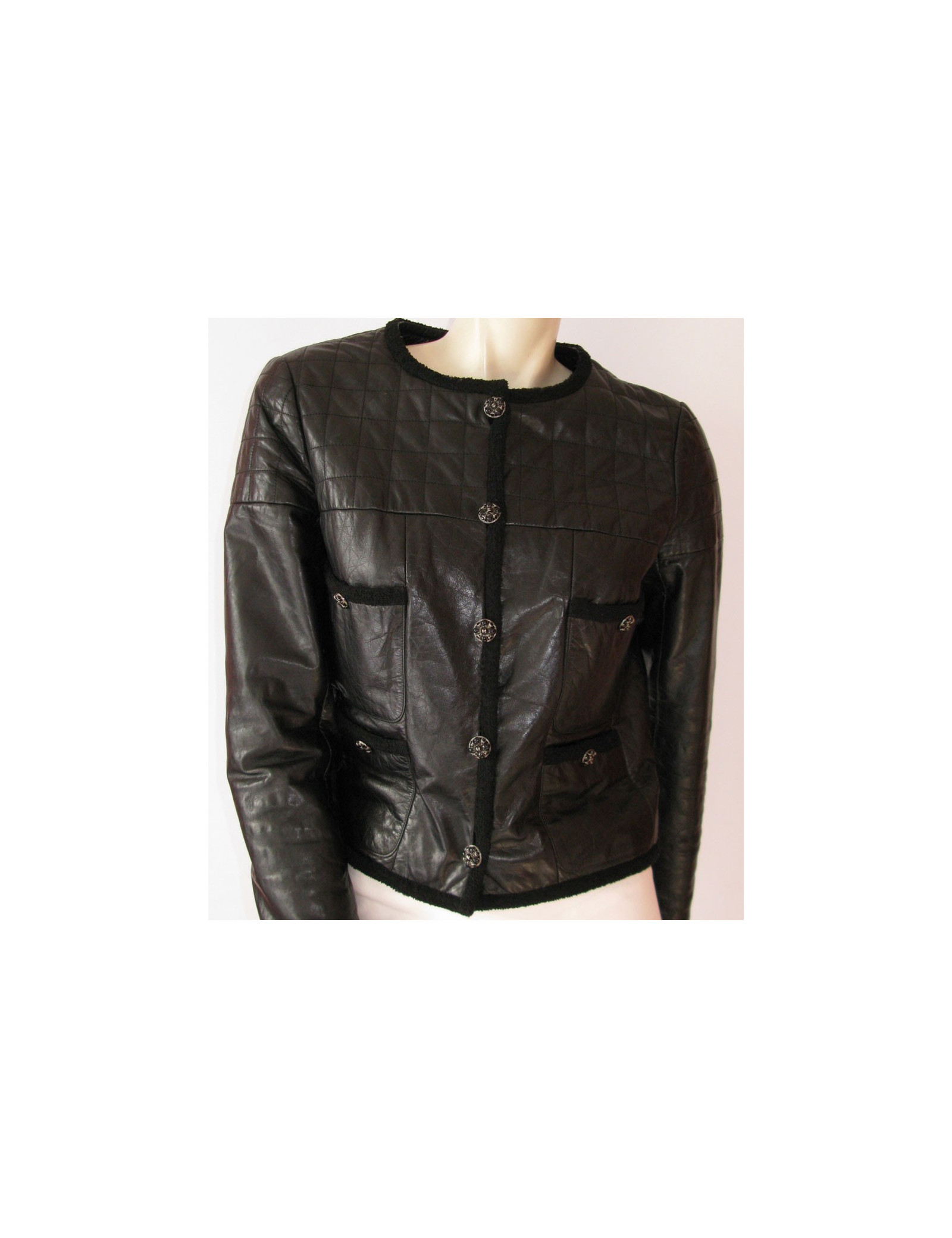 Blouson motard court Chanel T40 en cuir noir matelassé, Coupe droite, col ras du cou. Fermeture avant par 5 magnifiques boutons en pâte de verre noire sur un fond de couleur argent siglé CC ainsi que sur les poignets et les poches. Veste gansée de tweed noir sur l'encolure, la bande de fermeture, les poignets, les 4 poches sur le devant et au bas. Composition : Cuir de veau 100%. Doublure unie noire en soie 100%.