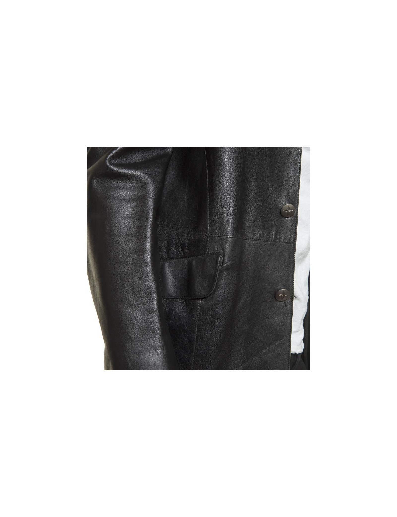 Col à pointes surpiquées, coupe cintrée, fente au dos en bas, 3 boutons argent vieilli mat siglés du logo de la marque "l'étoile", pochette à la poitrine et poches à rabats en biais sur les hanches.