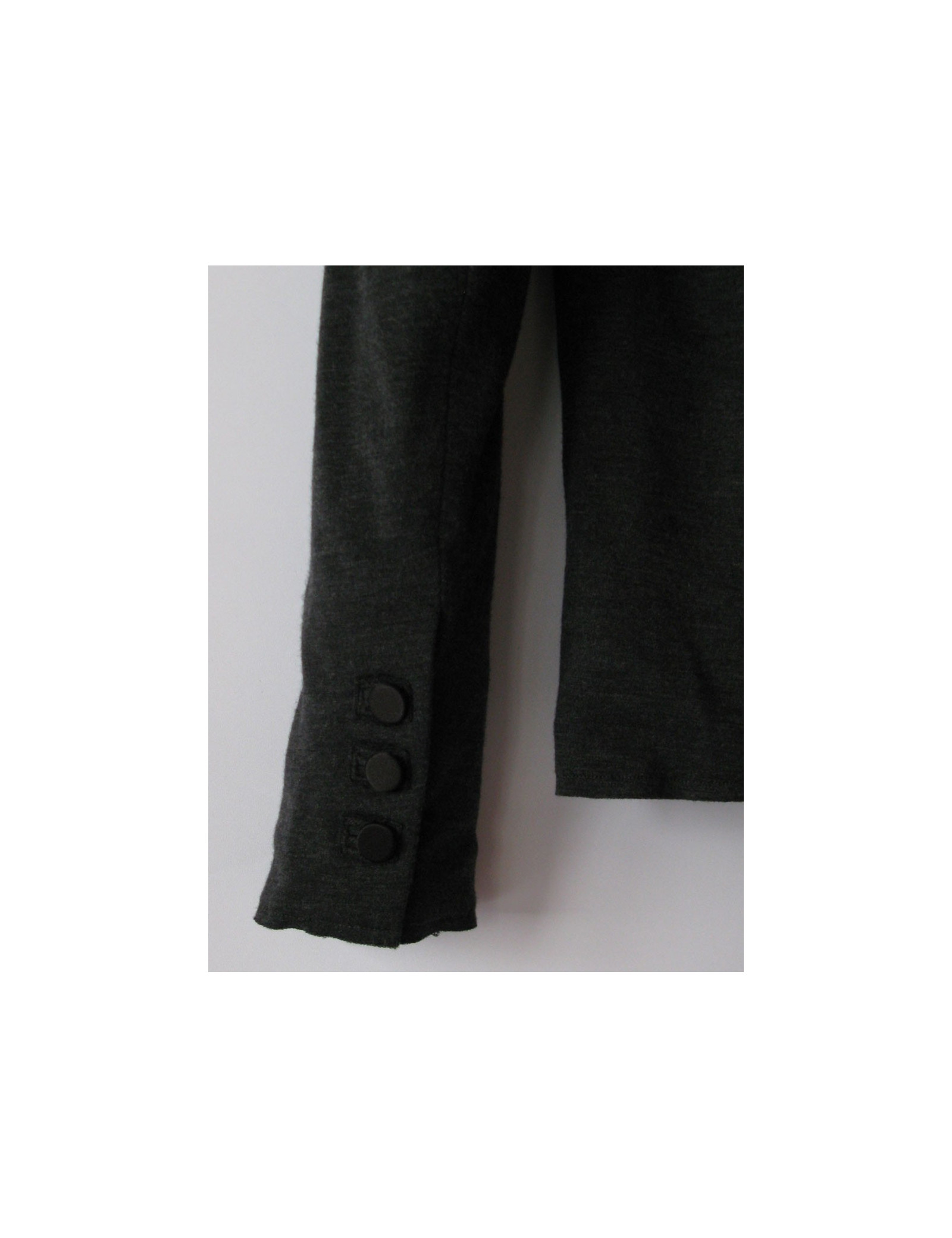 Superbe! Gilet Lanvin T42 de couleur anthracite, Col chemise, un décolleté grand V, manches longues, les 3 gros boutons de devant sont recouverts de soie noire ainsi que sur les 3 boutons des poignets et les 2 poches devant. Composition : 100% laine.