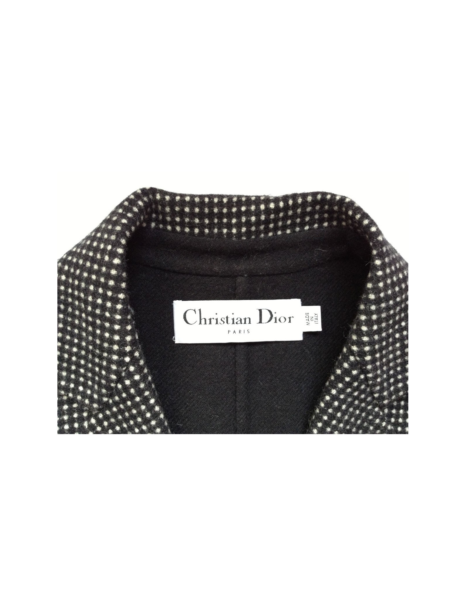 Très jolie veste Dior T42FR, fermée par 3 boutons noirs, 2 poches plaquées sur les hanches et 1 poche poitrine. fente au milieu du dos. L'intérieur est uni noir en laine et angora de même que le revers du col. Composition : 80% laine et 20% angora.