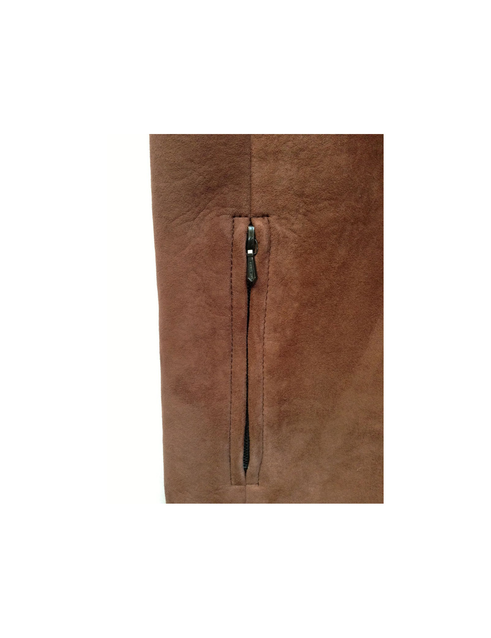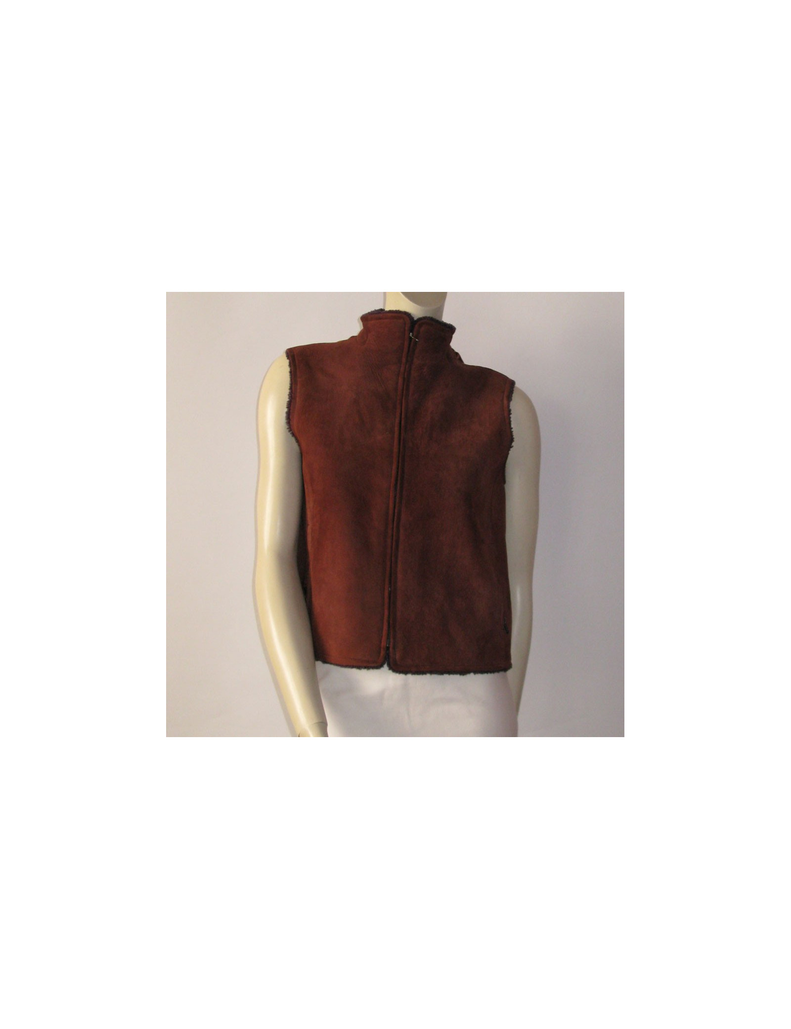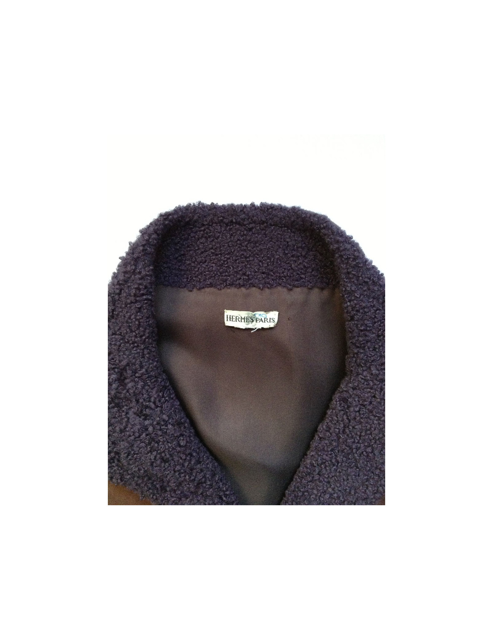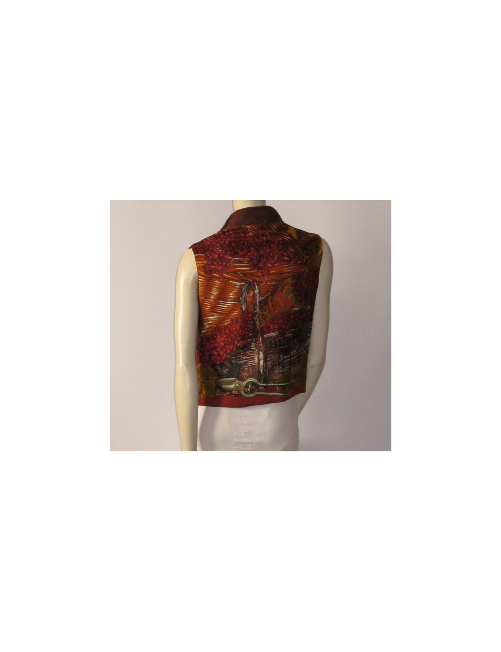 Chic and Casual! Gilet HERMES bi-matiere, T38FR, sans manches, col haut. Le dos est en soie "imprimé foulard" inspiré des couleurs de l'automne et l'avant est en peau lainée marron avec intérieur prune. Fermeture frontal invisible ainsi que pour les poches en biais situées sur les côtés. La marque "Hermes" est inscrite en lettre capital au dos.100% Agneau, 100% soie.