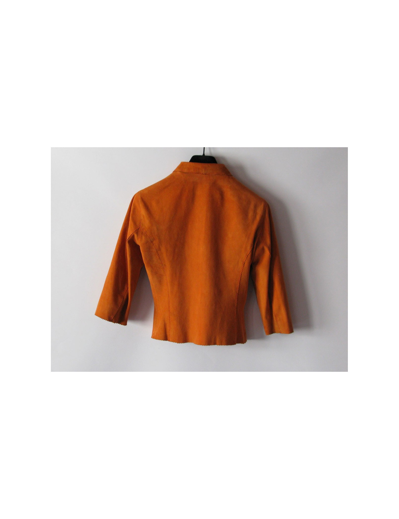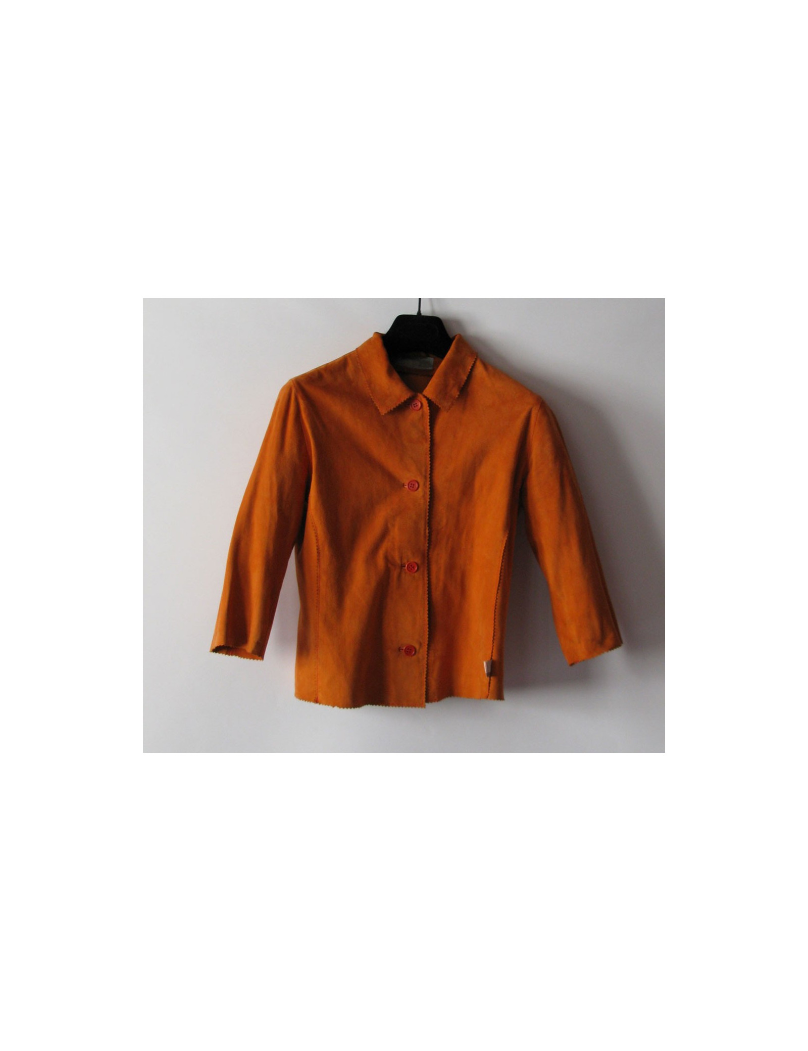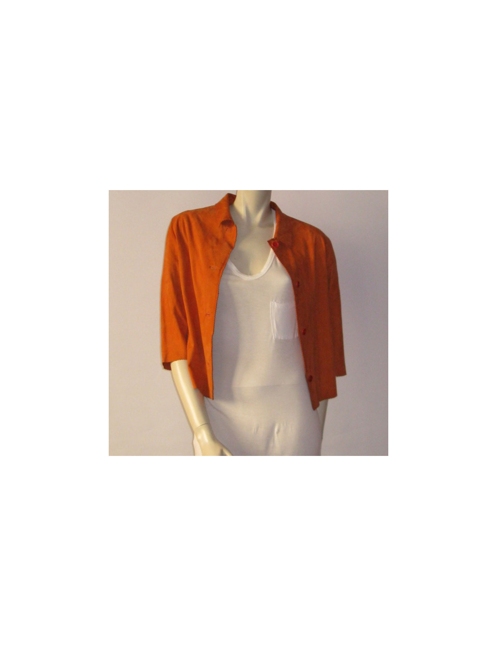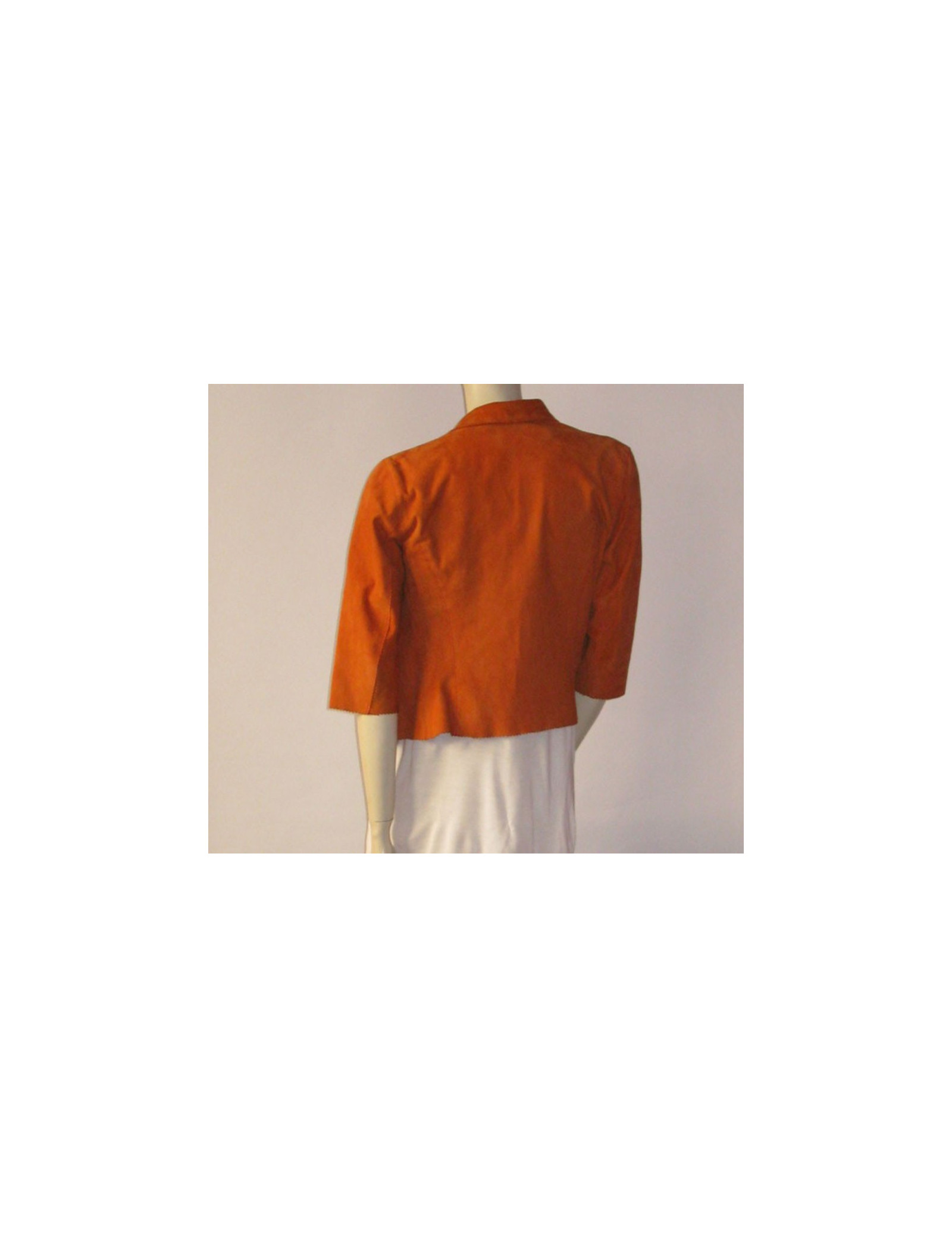Petite veste MISSONI T38FR en daim, couleur tangerine, col chemise, manche 3/4, ligne ajustée.