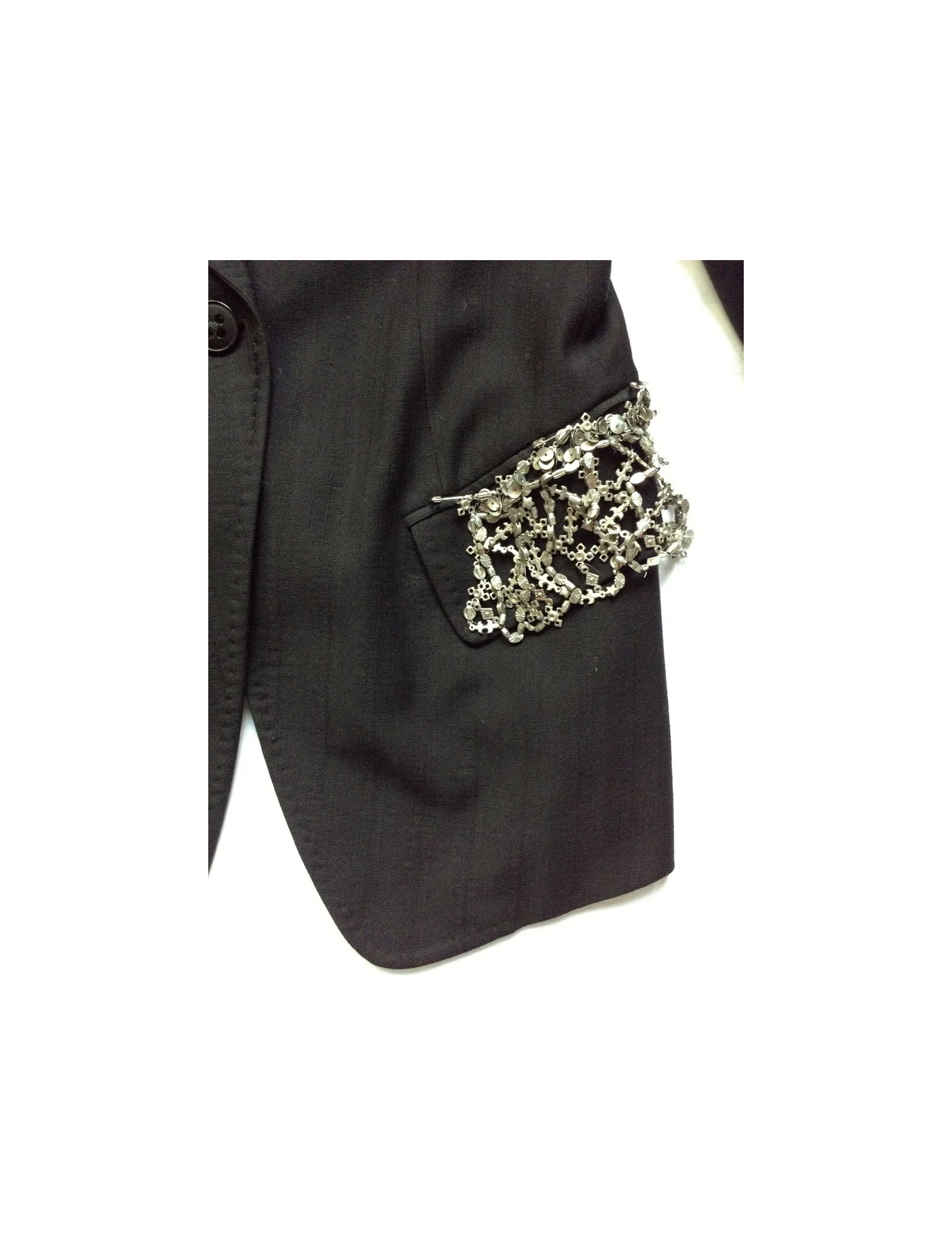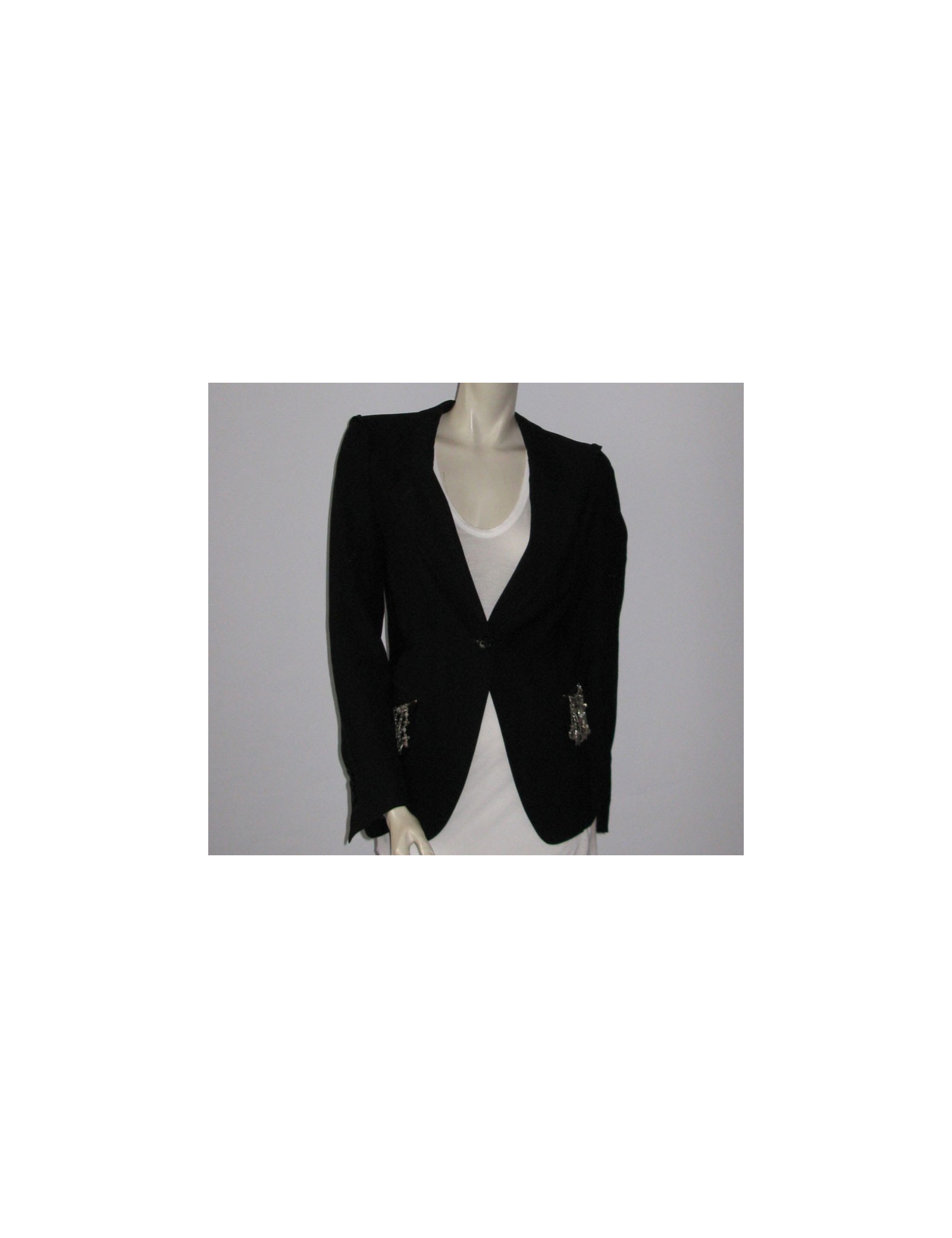 Coupe près du corps, manches longues avec possibilité de retrousser les manches grâce au petit bouton intégré sur le haut de la manche. Col tailleur, poches en biais à rabats, décorées d'une cotte de maille argentée, ornée de détails métalliques. Fente d'aisance au dos. Fermeture centrale 1 bouton, petite fente sur les manches à proximité des 4 boutons d'ouverture située aux poignets. 51% laine vierge, 49% viscose.