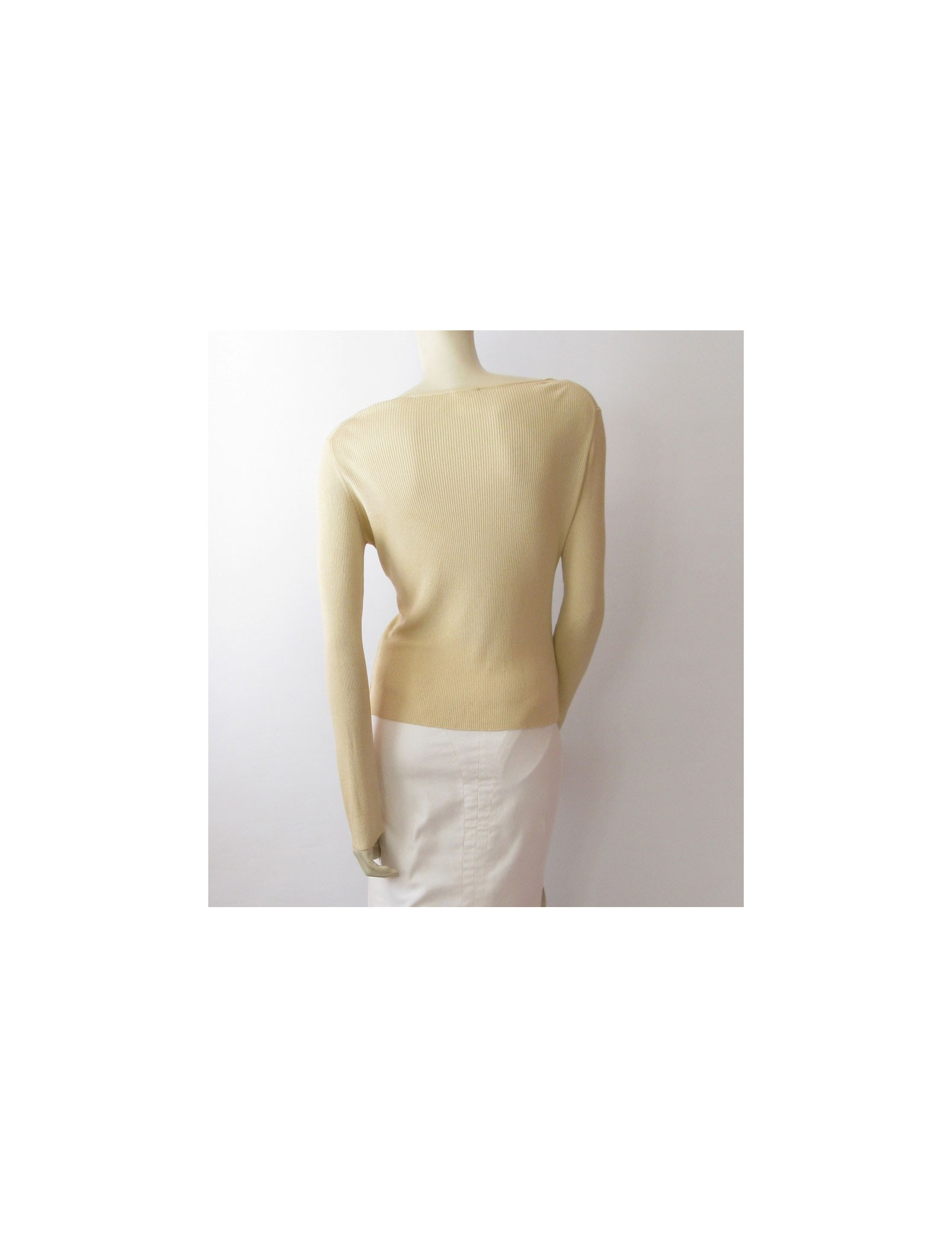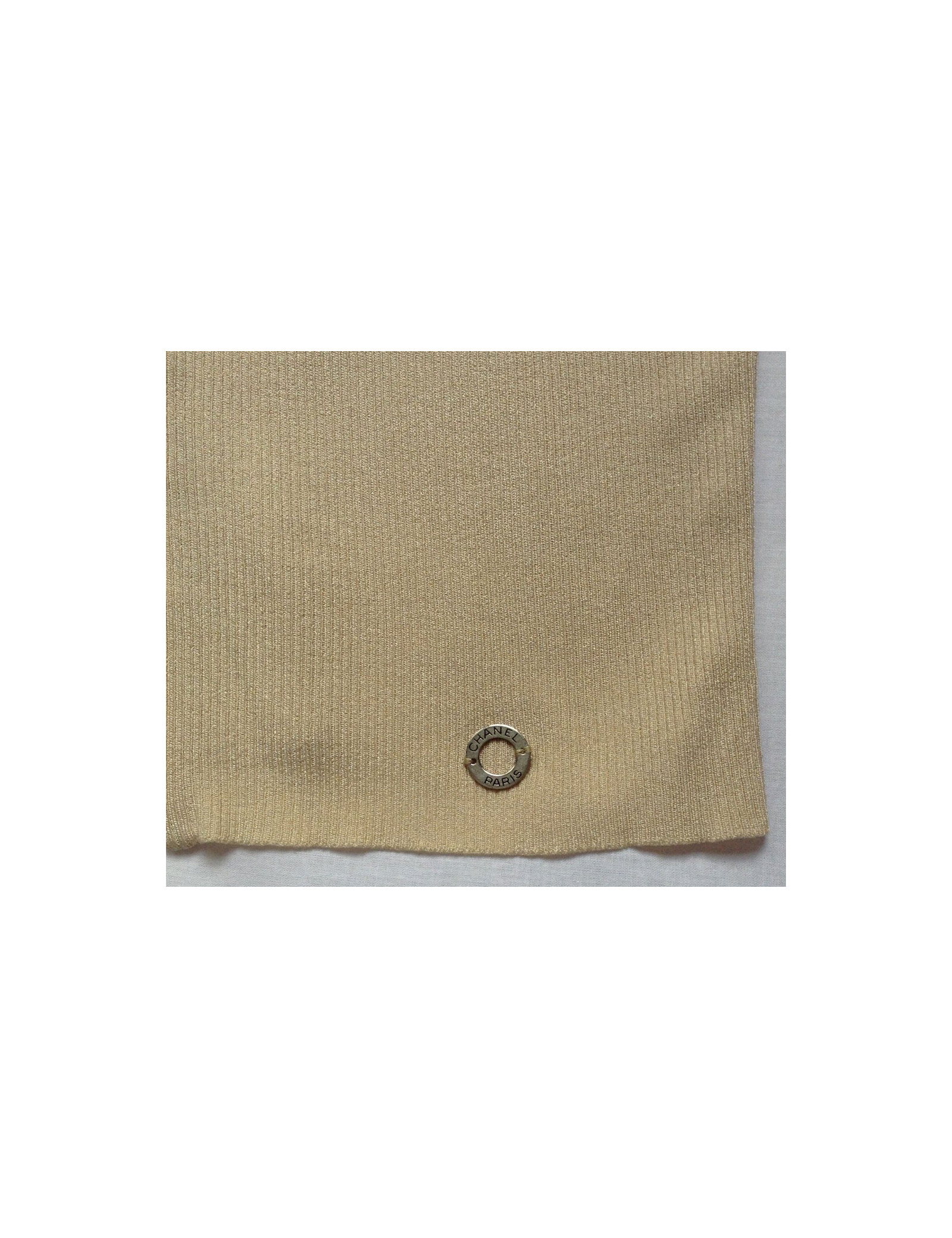 Joli gilet CHANEL beige T44Fr, coupe cintrée, col échancré arrondi, manches longues. Fermeture au centre par un long zip beige assortie au pull, orné d'une petite tirette CC strassé. Anneau en métal gravé "Chanel Paris" en bas à gauche.94% viscose.