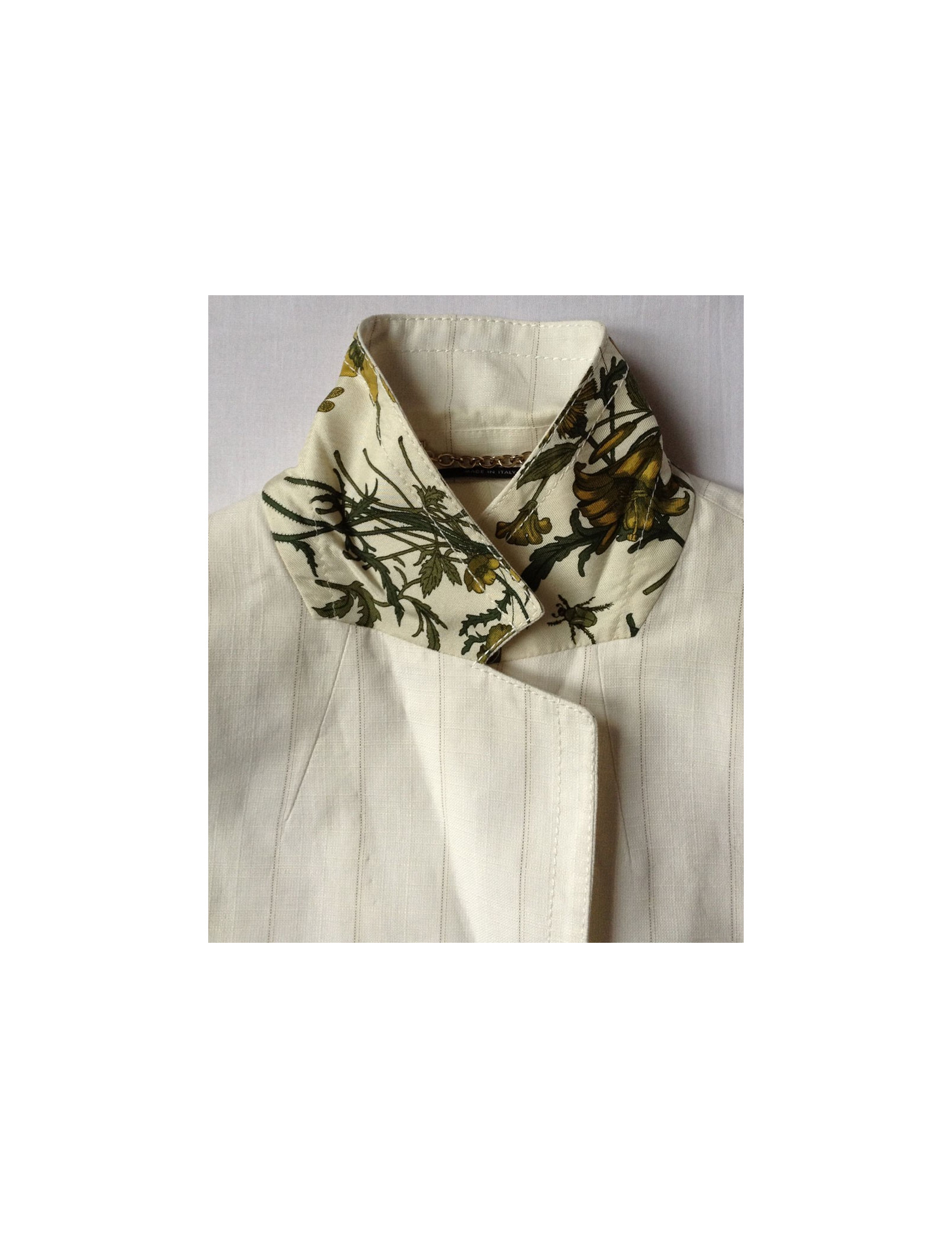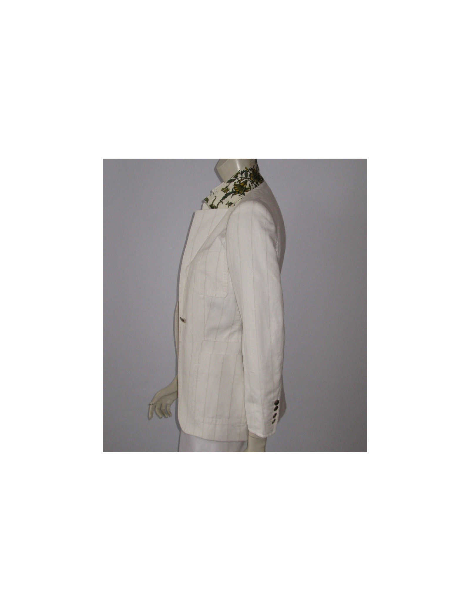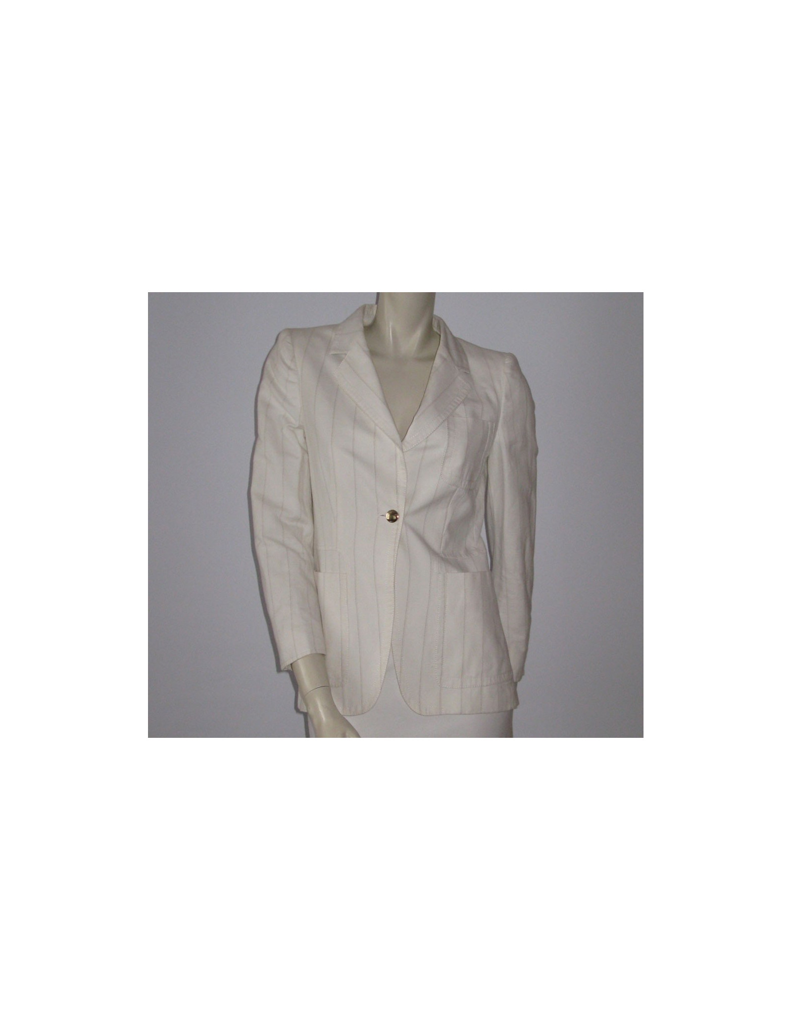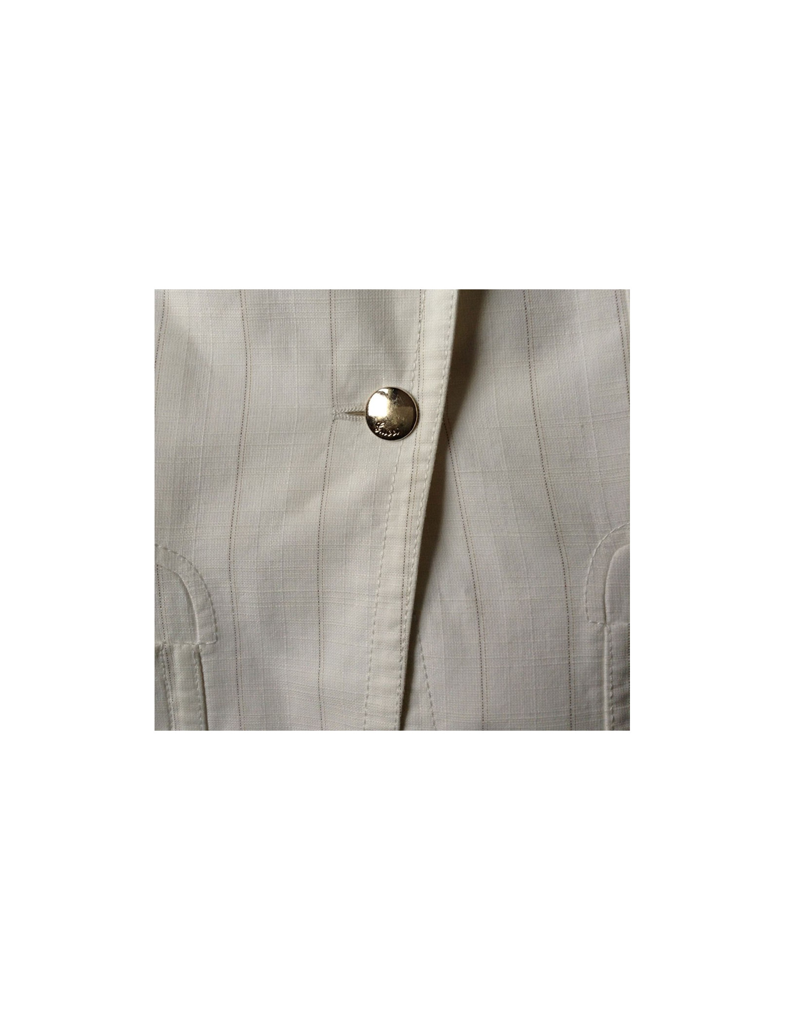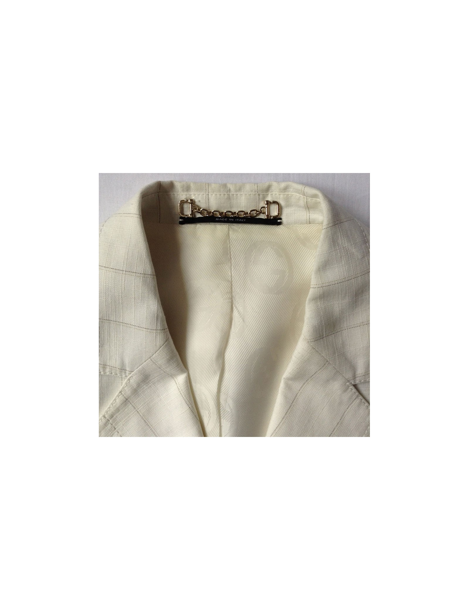 Veste GUCCI T40It blanche à fines rayures marron et beige, col tailleur, chainette dorée avec étrier gravée de la marque à l'intérieur du col. Veste coupe cintrée, manches longues avec 4 boutons de décoration aux poignets siglés "Gucci". 1 Poche appuyée sur la poitrine suivie par 2 larges poches à l'avant au niveau des hanches. Fente d'aisance au dos. Fermeture frontale par un bouton doré siglé "Gucci". Doublure imprimée du logo. 63% coton, 34% lin.