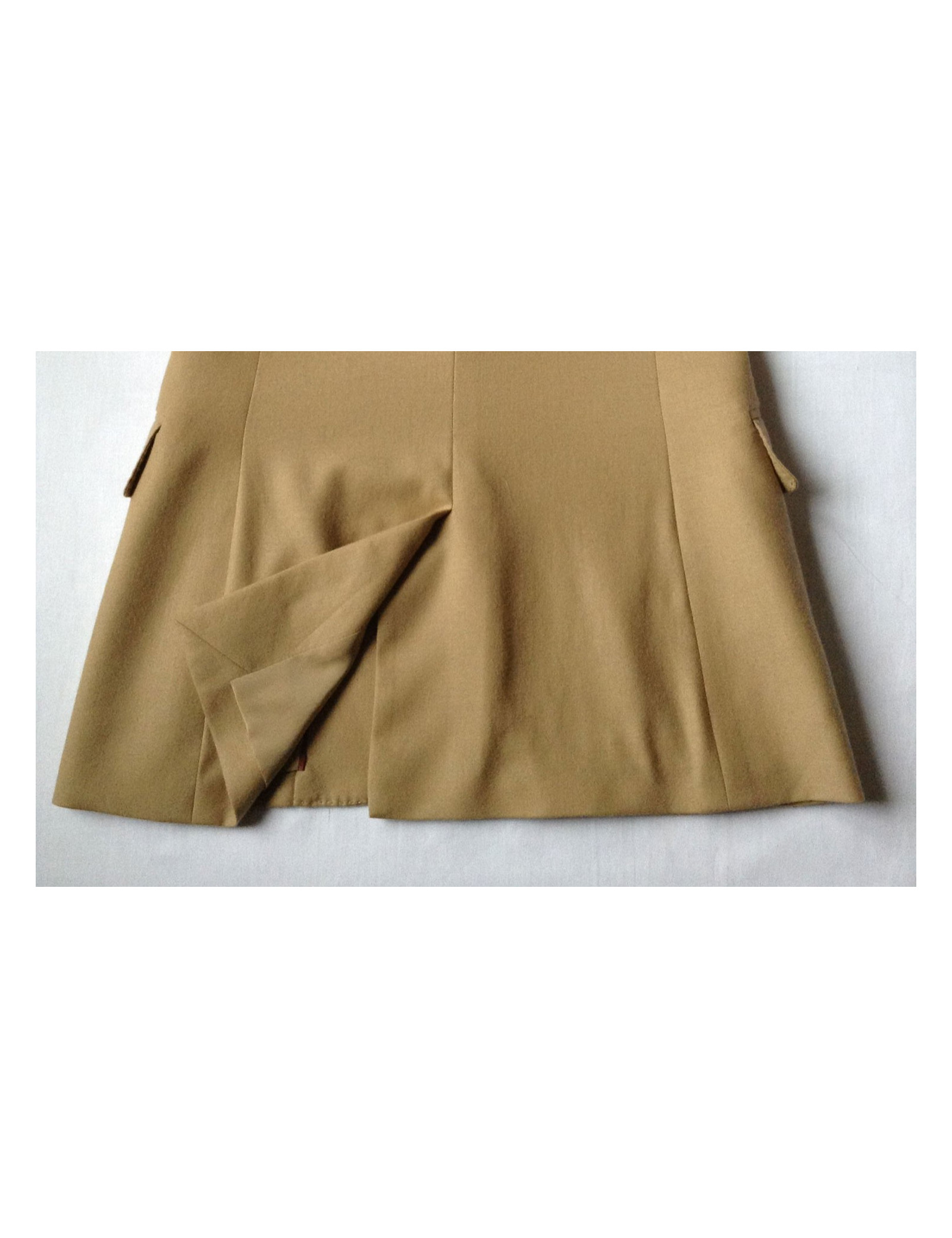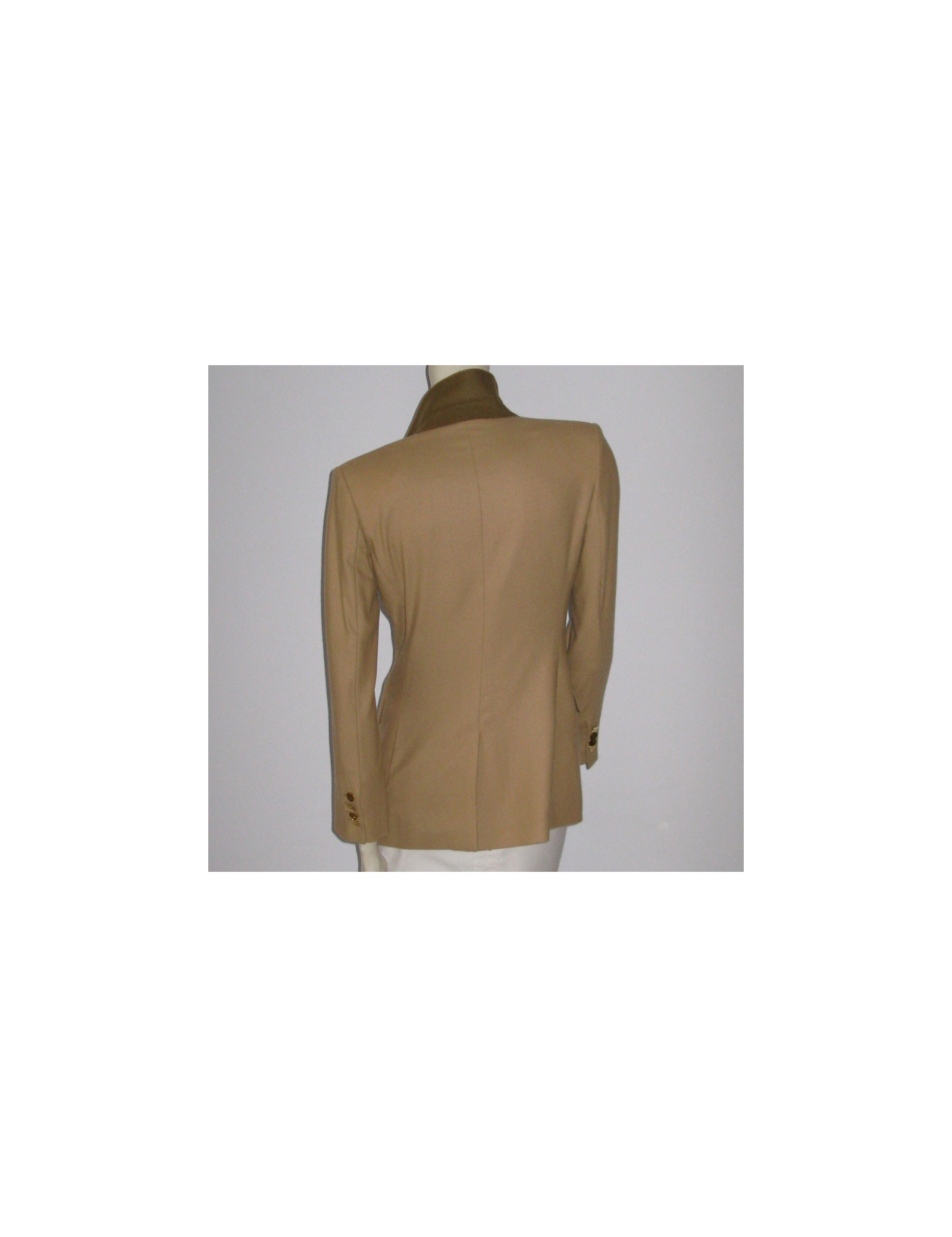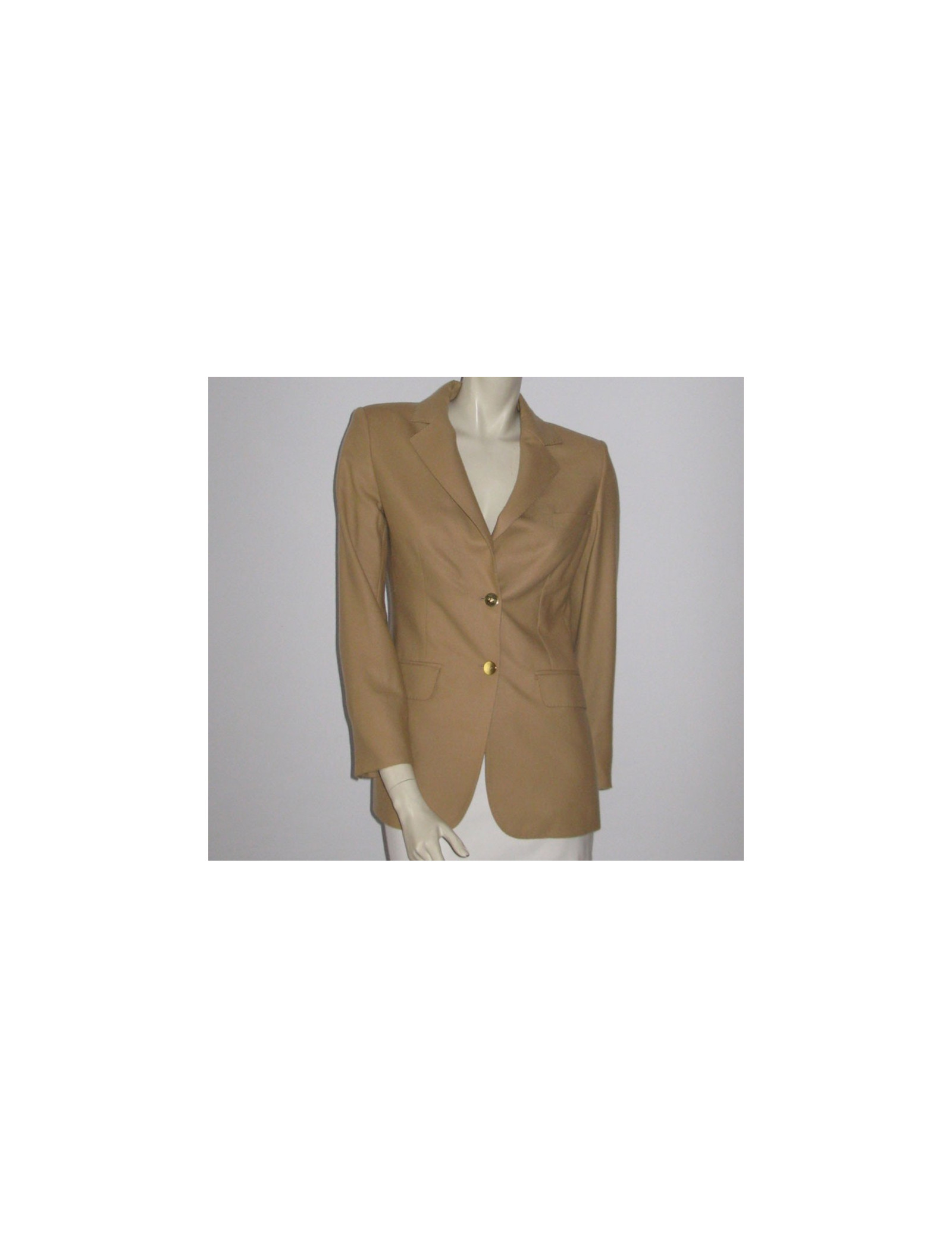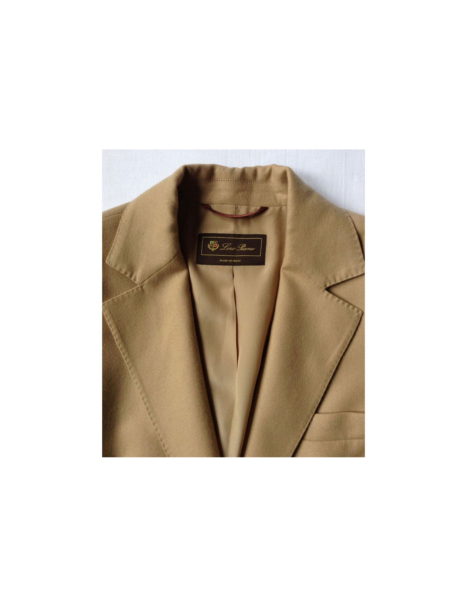 Superbe veste LORO PIANA T40It, en cachemire de couleur camel, col tailleur surpiqué, manches longues. Col contrasté de couleur noisette à l'intérieur du col supérieur. Pince de cintrage sur le devant et dans le dos. Fermeture centrale par deux très jolis boutons doré gravé "L/P". Poche appuyée poitrine, 2 poches plaquées surpiquées au niveau de la taille. Fente d'aisance au dos. 100% cachemire (qualité exceptionelle). Doublure 100% soie.