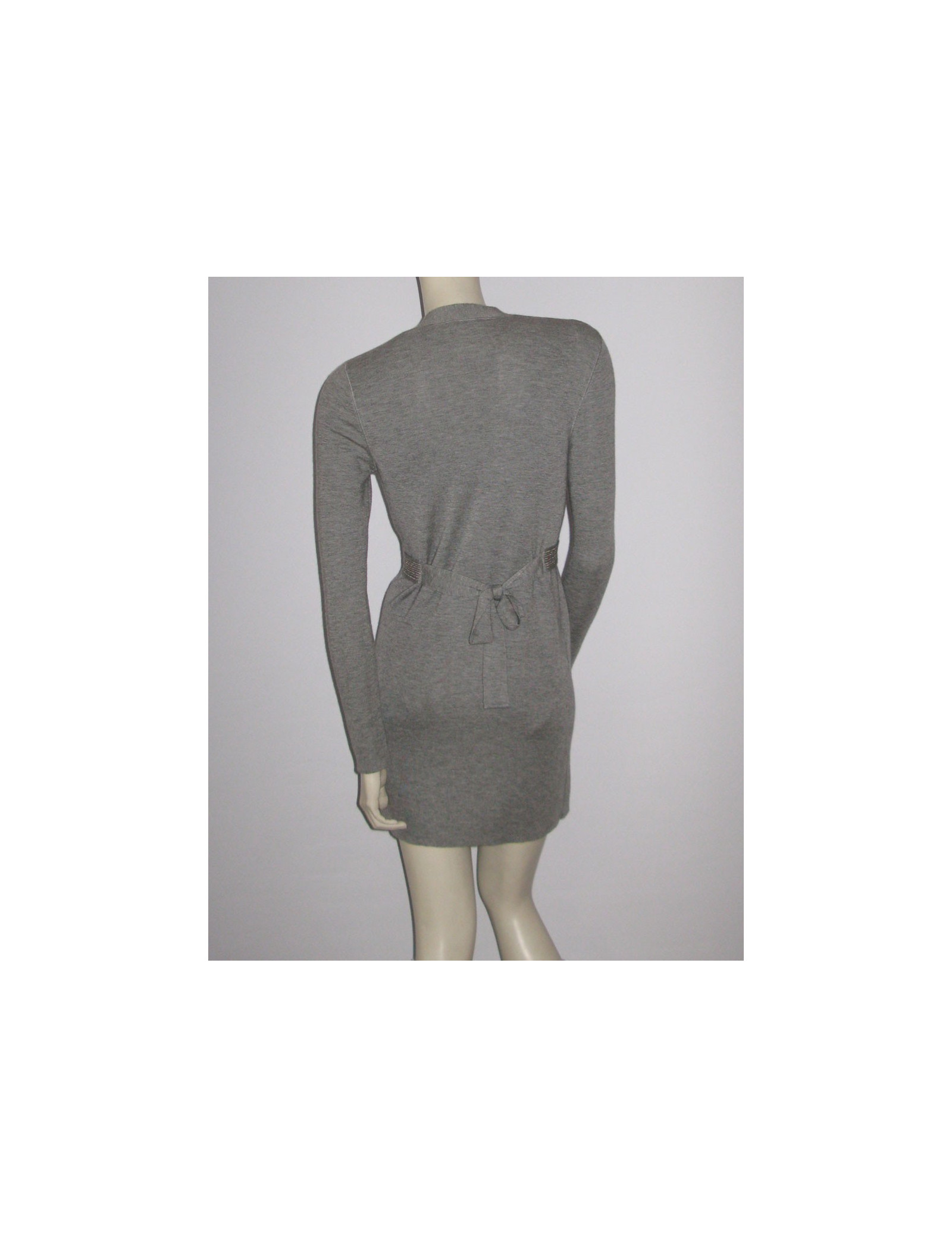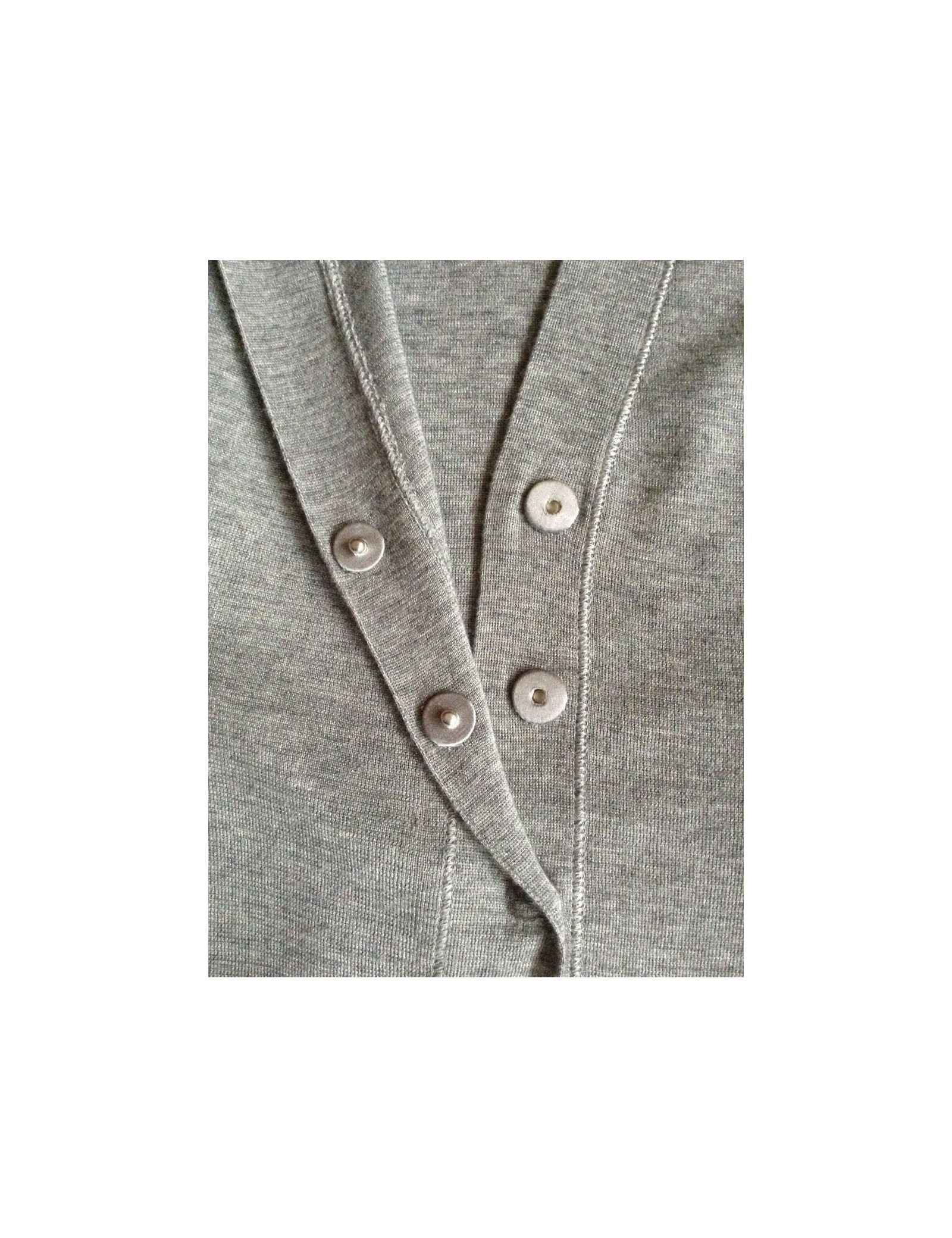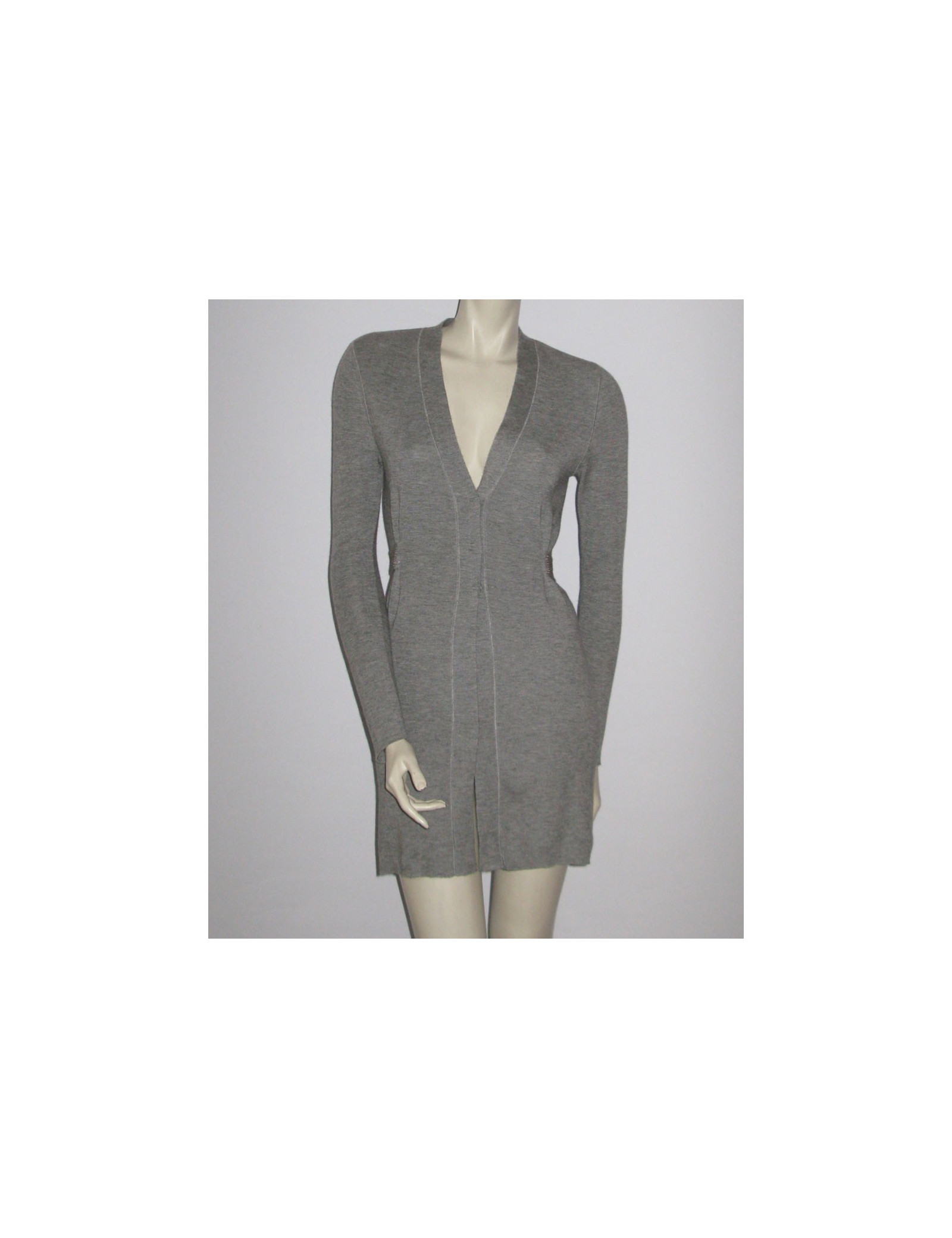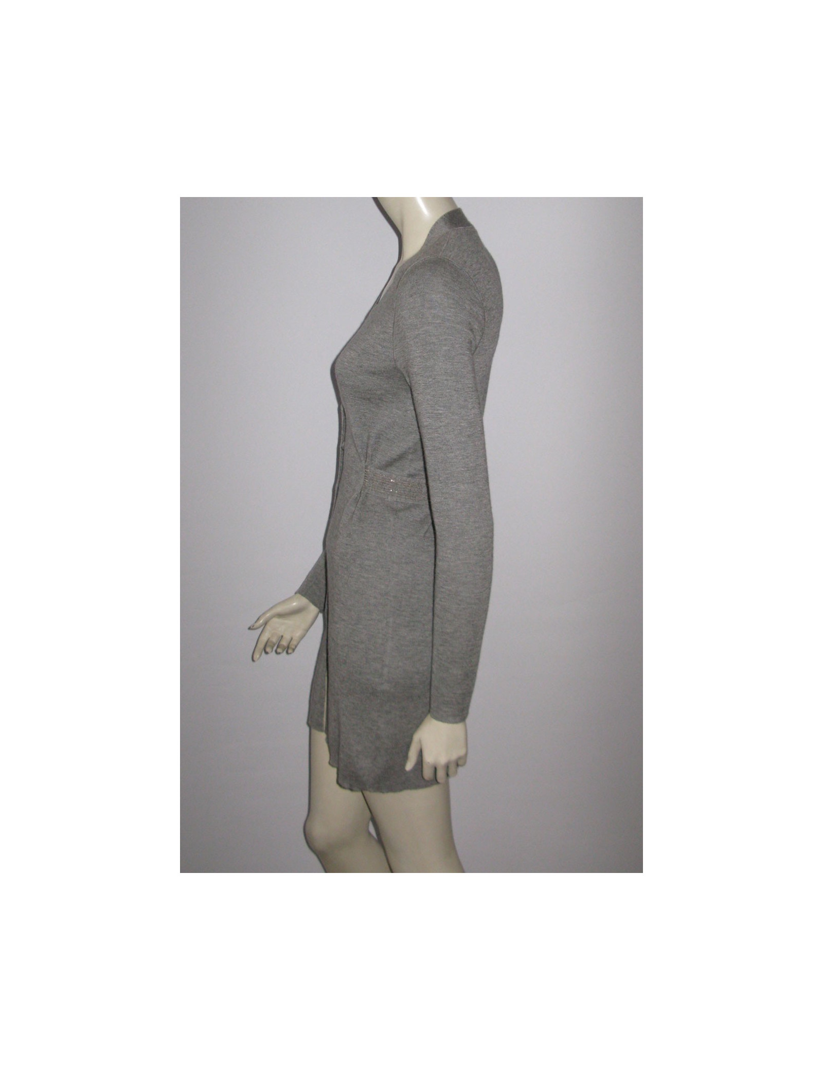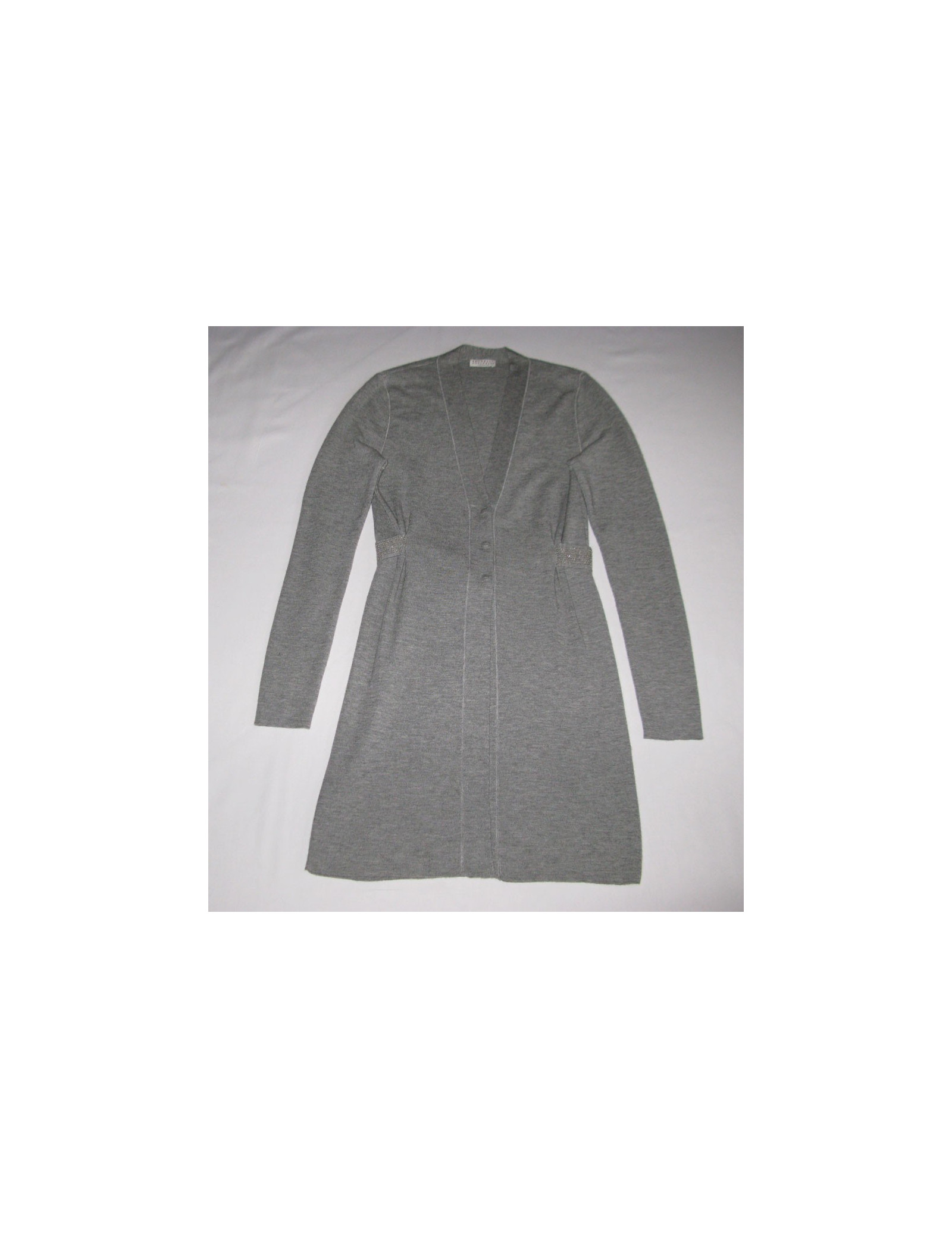 Élégant gilet long Brunello Cucinelli gris, décolleté en V, manches longues, près du corps. Lien d'attache au dos agrémenté de 2 bandes sur les côtés, celles-ci sont ornées de petites perles dorées. Fermeture avant par 3 boutons à pressions cachés, recouvert de soie grise. Taille M soit 38fr. 70% cachemire, 30% soie.