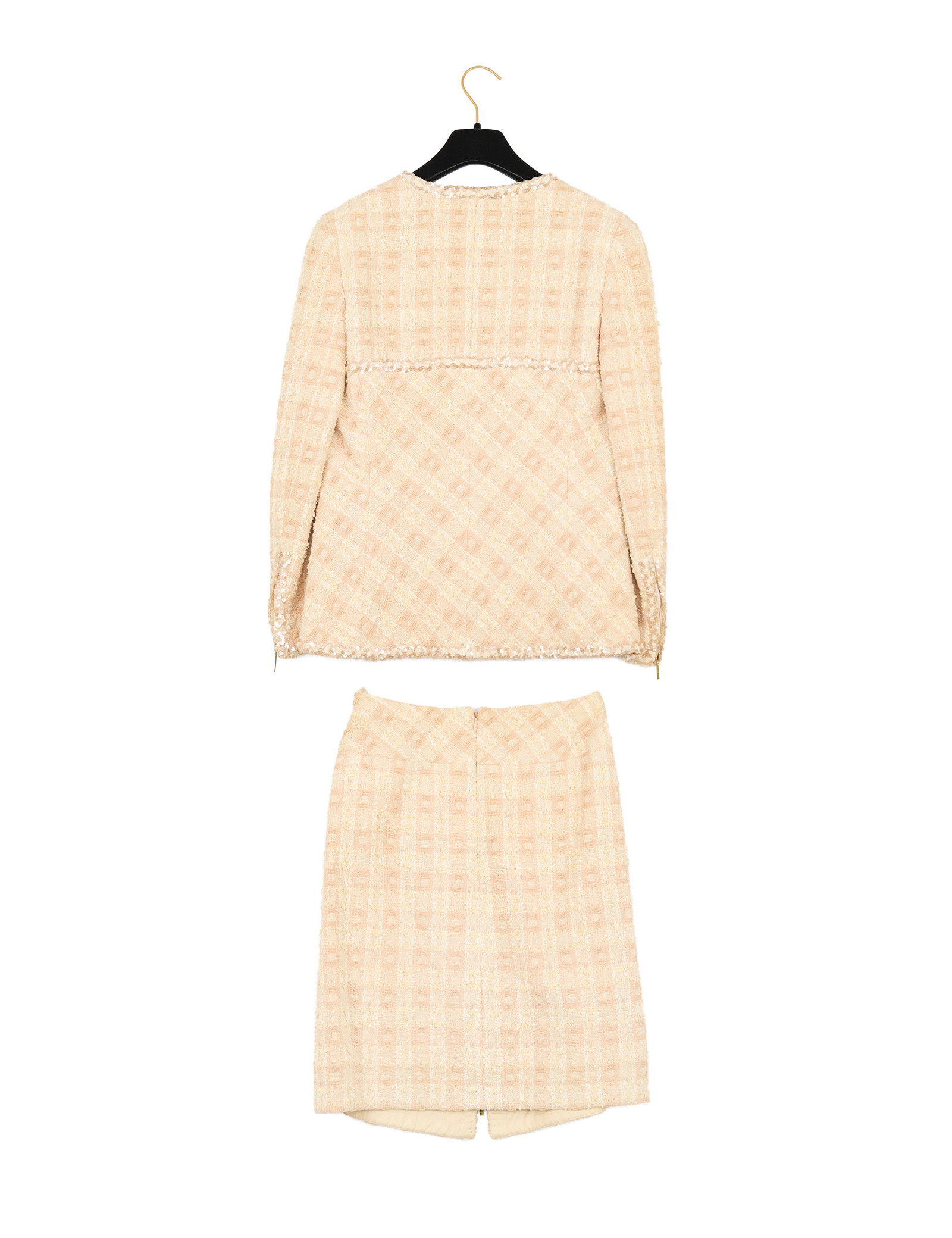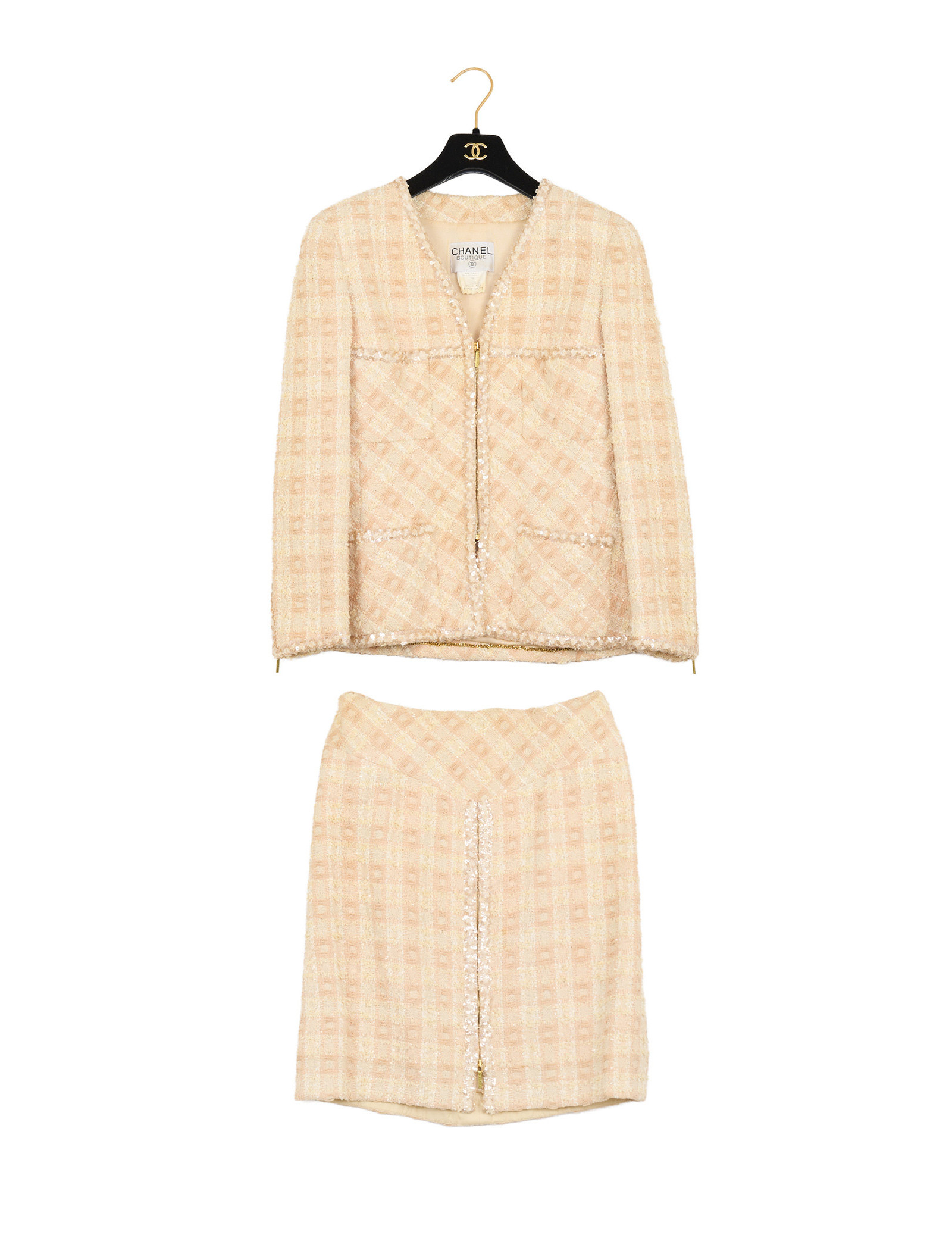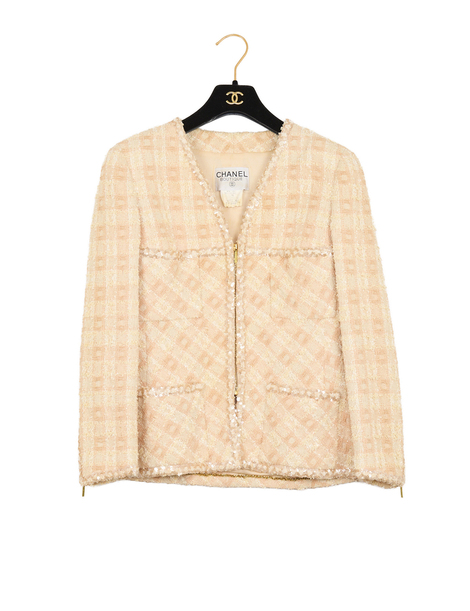 Réalisé dans un tweed aux nuances de pêche (orange et beige), l’ensemble est subtilement agrémenté de sequins qui apportent un éclat discret et élégant à la matière. La veste présente une coupe structurée avec un col en V et se ferme par une fermeture éclair dorée sur le devant ainsi que sur les poignés. Elle a quatre poches plaquées, signature emblématique des vestes Chanel.