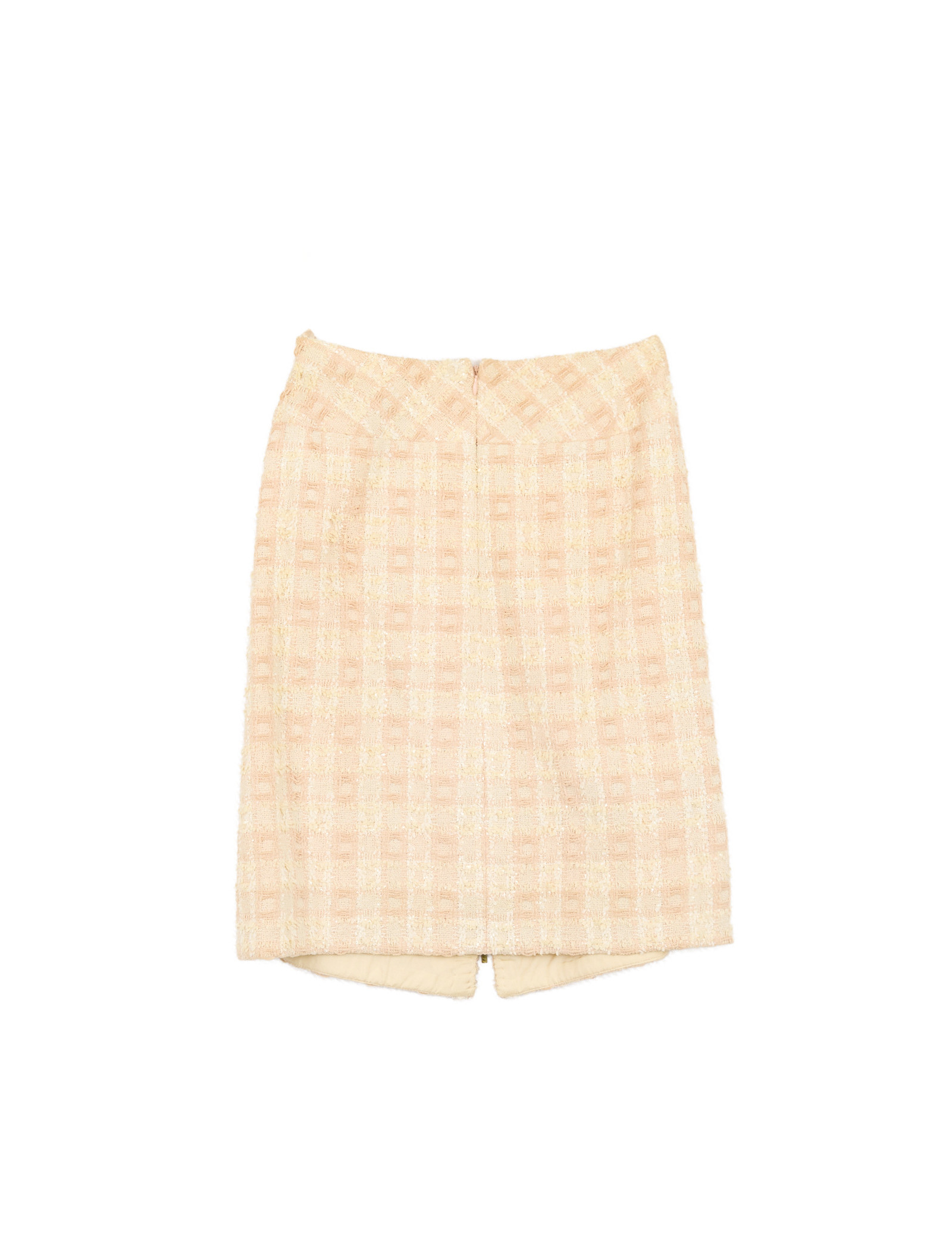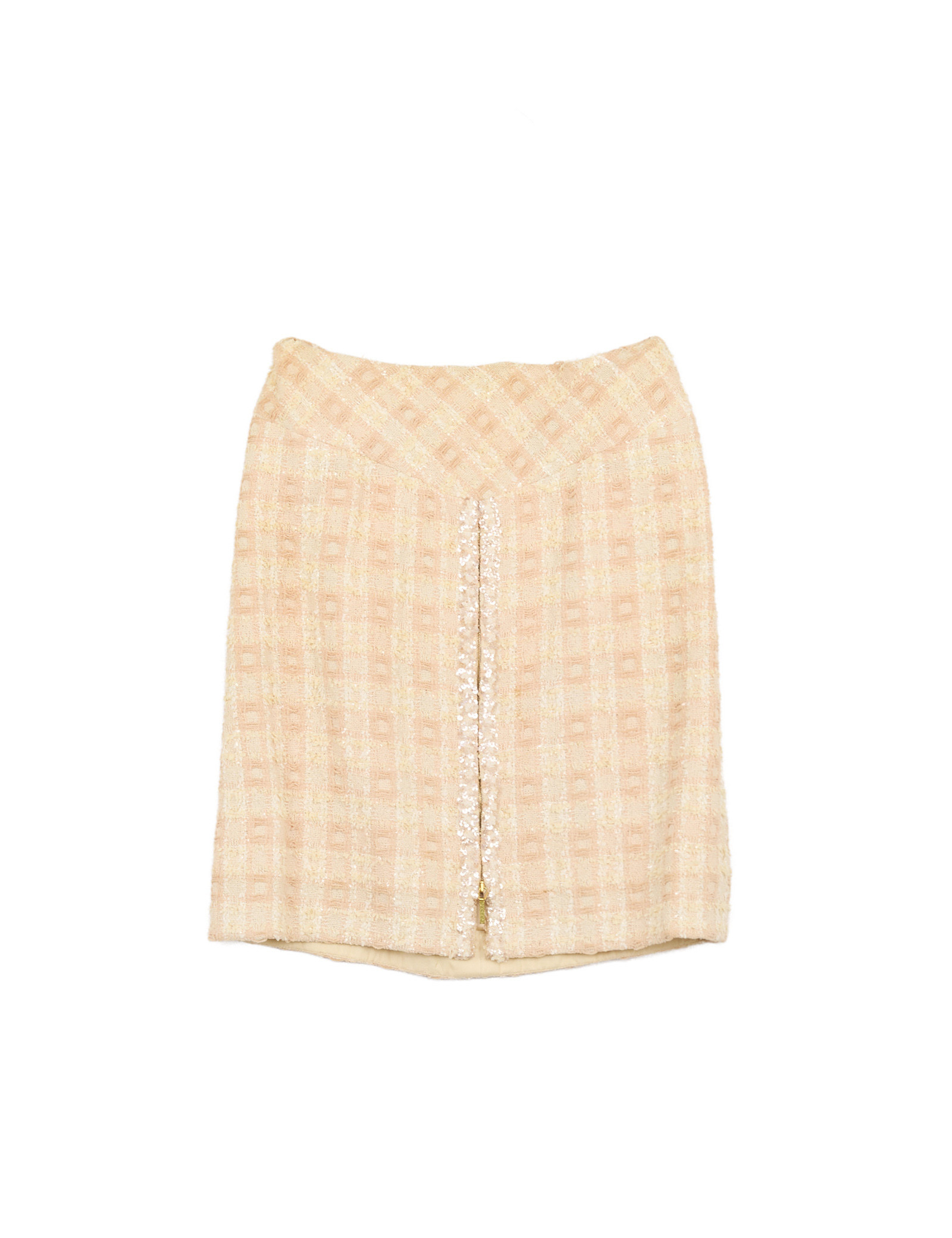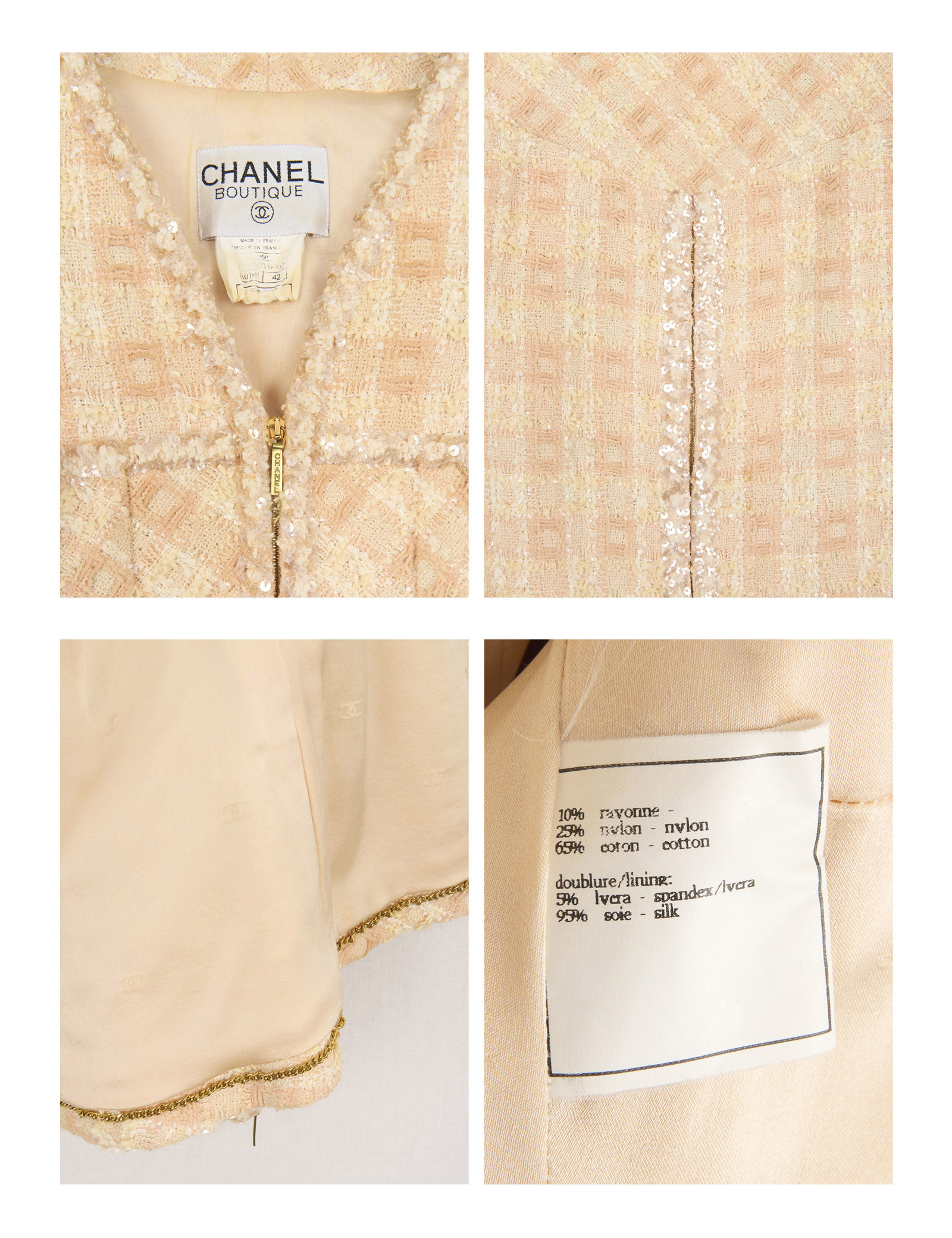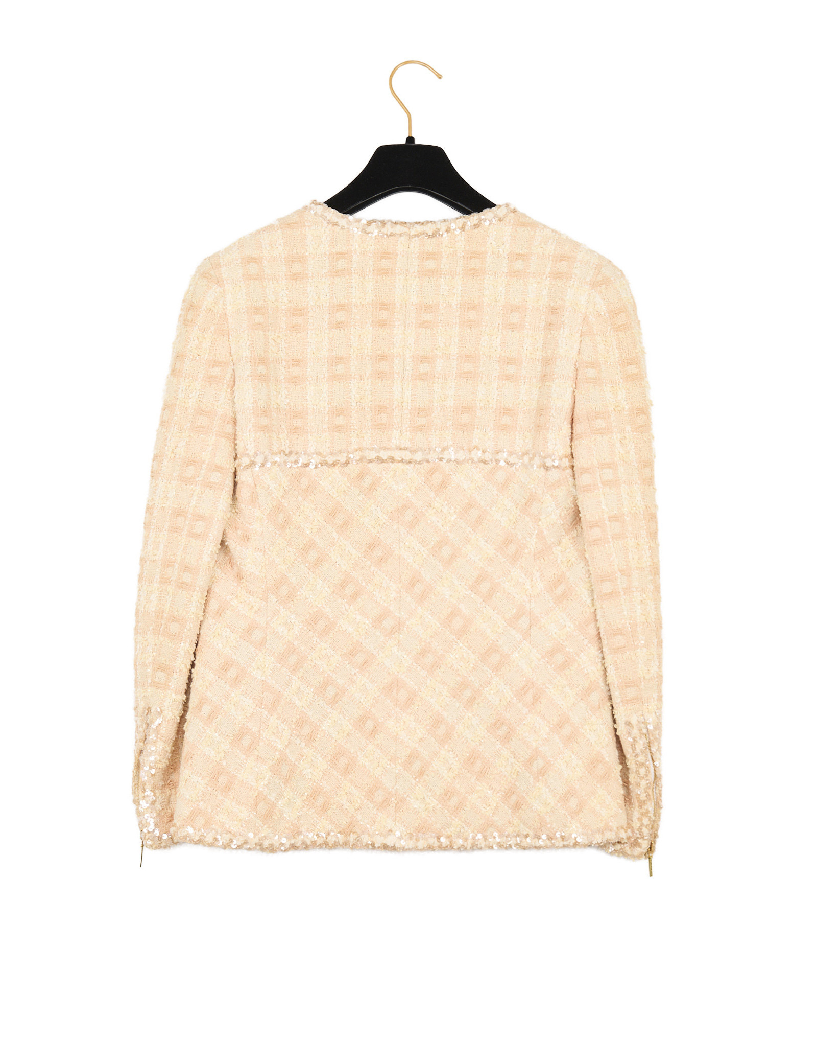 Réalisé dans un tweed aux nuances de pêche (orange et beige), l’ensemble est subtilement agrémenté de sequins qui apportent un éclat discret et élégant à la matière. La veste présente une coupe structurée avec un col en V et se ferme par une fermeture éclair dorée sur le devant ainsi que sur les poignés. Elle a quatre poches plaquées, signature emblématique des vestes Chanel.