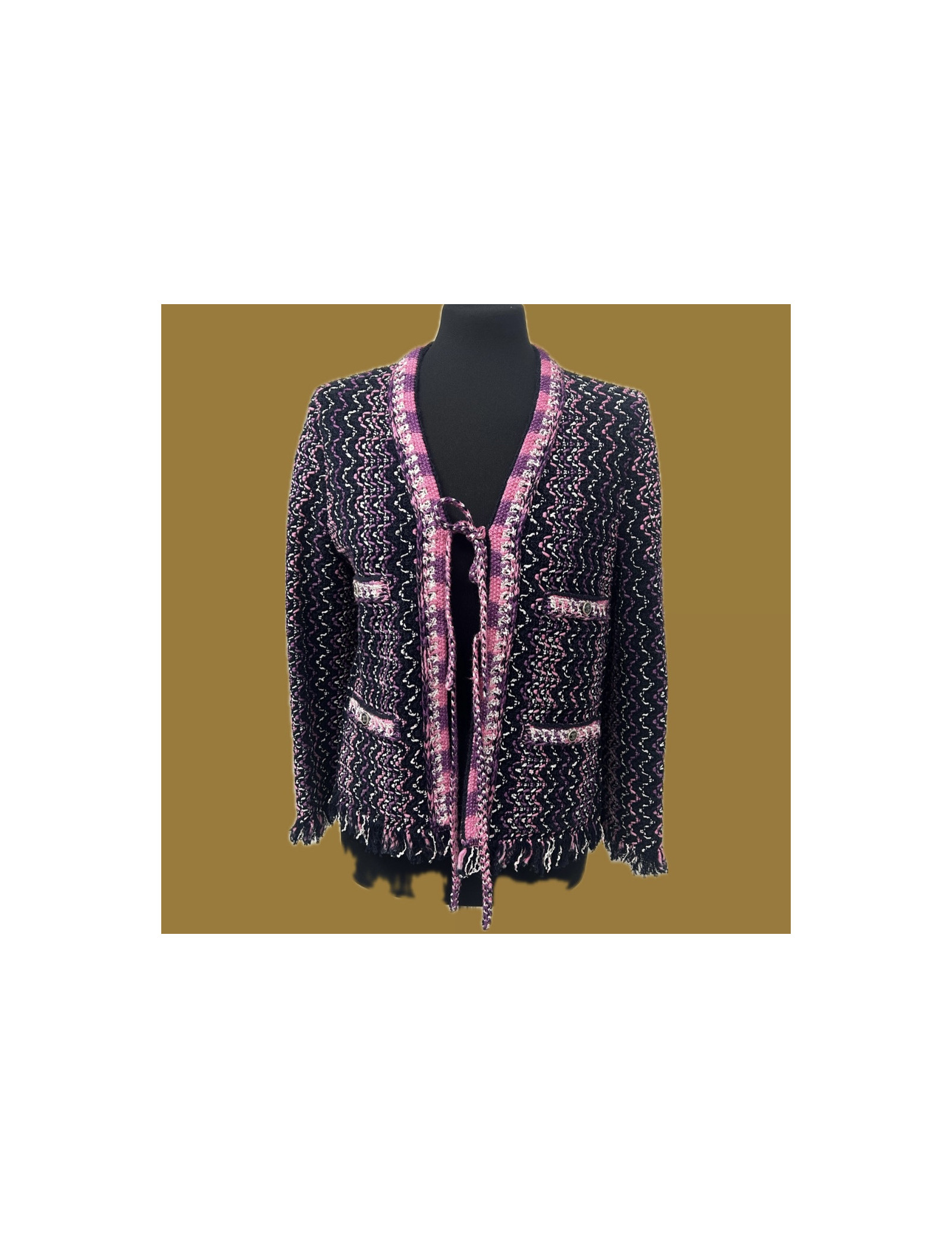 Nouveau VESTES Veste CHANEL croisée T36 fils d'or CHANEL 38827 4 900,00 € Veste CHANEL croisée tweed et sequins Condition : très bon étatPays de fabrication : FranceTaille : 36/38 FRMatière : tweedDoublure : soie monogrammée noirCouleur : noir, écru, fil doréDimensions à plat : épaules 38 cm, sous la poitrine 40 cm, hauteur 65 cm, longueur des manches 62 cm, tour de poignet 25 cmDétails : deux rangées de boutons siglés CC avec... Ajouter au panier