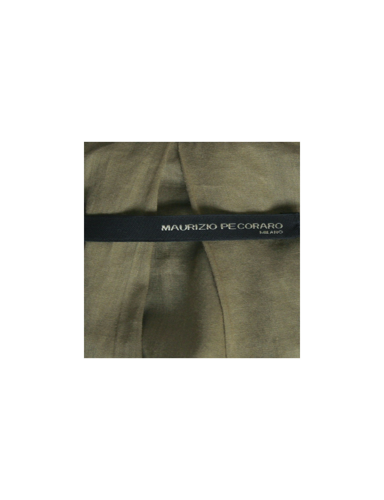 Veste Maurizio Pecoraro en cuir d'agneau de couleur taupe. Taille 44 italien ce qui correspond à un 40 francais. Le col est rond, surpiqué et plissé. Longueur des manches 3/4. En bon état. Elle est tachée en bas à droite et également sur la manche. Voir photo.