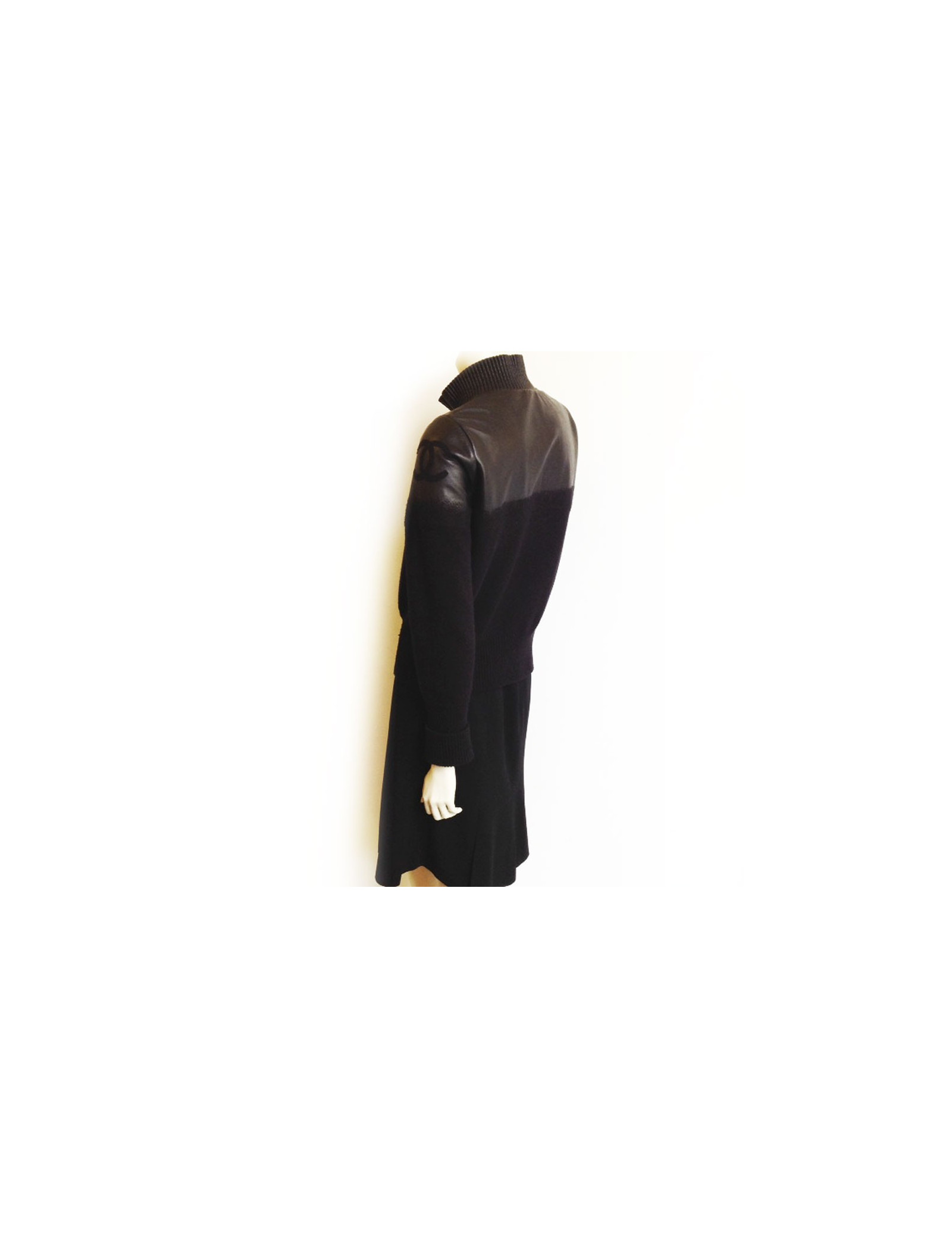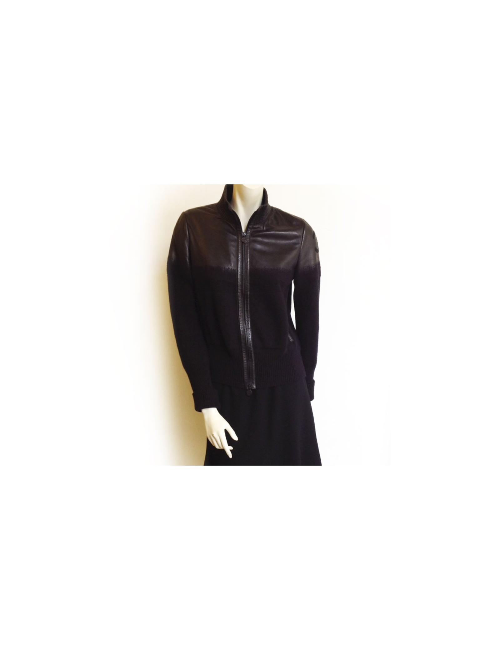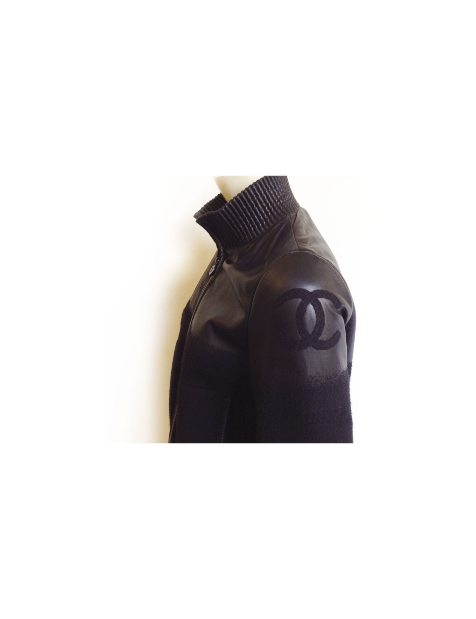 Blouson Chanel en laine et cuir d'agneau noir T40. Deux poches plaquées au niveau de la taille. Il est resserré à la taille. Il porte le sigle CC sur l'épaule gauche. En très bon état. Il a une petite déchirure sous le bras droit, voir photo.