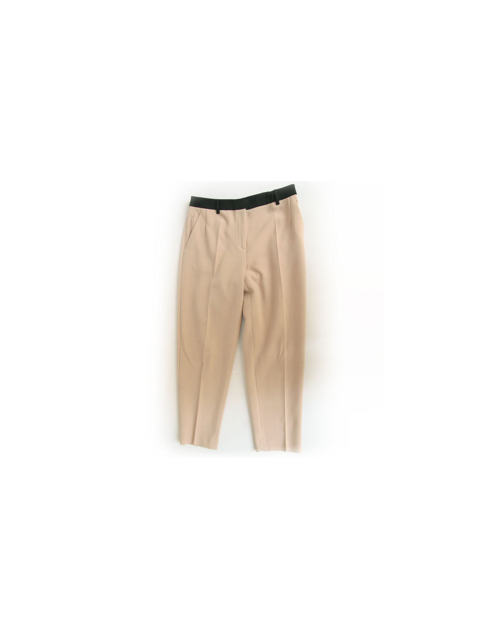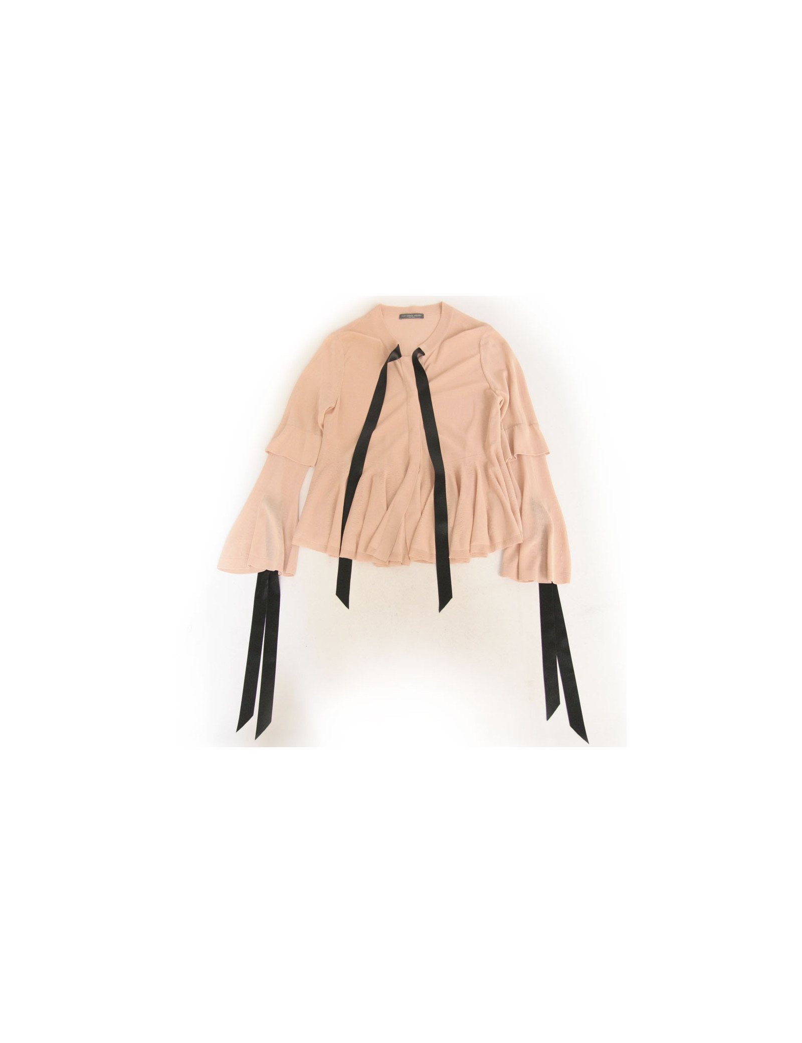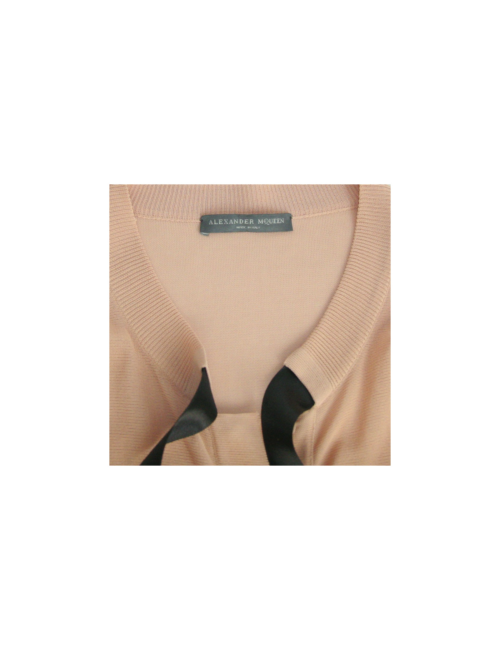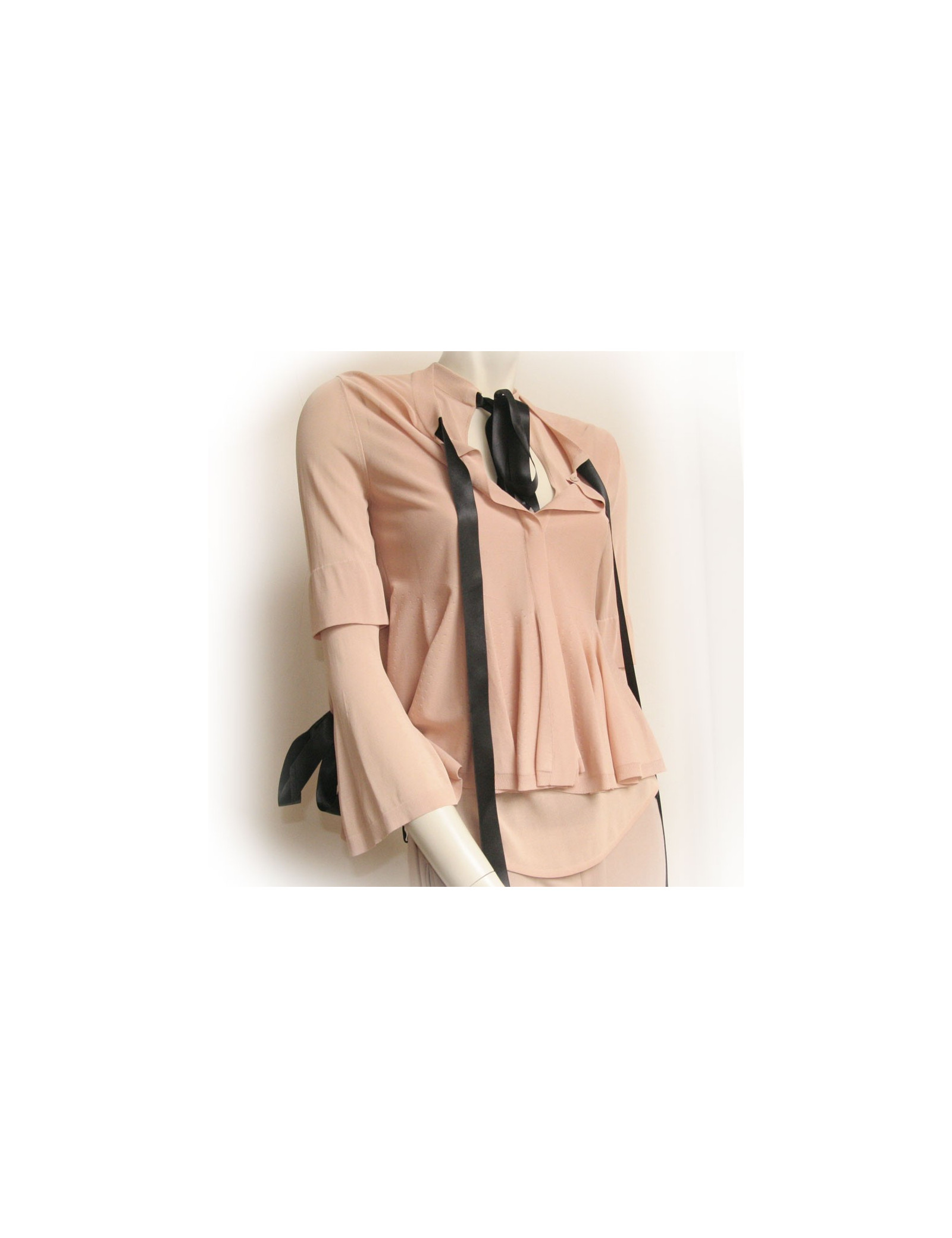 Ensemble pantalon veste et top Alexander McQueen. Le pantalon est de couleur vieux rose à pince en polyester. Longueur chevilles. Deux poches en biais sur les cotés et deux fausses poches l'arrière avec boutons. Le top et la veste sont viscose. La veste se ferme à l'aide de 4 boutons pression. Col rond intégré d'un ruban en satin noir ainsi que sur les manches. Le bas de la veste et le bas ont des volants perforés. Fentes sur les manches. En très bon état.