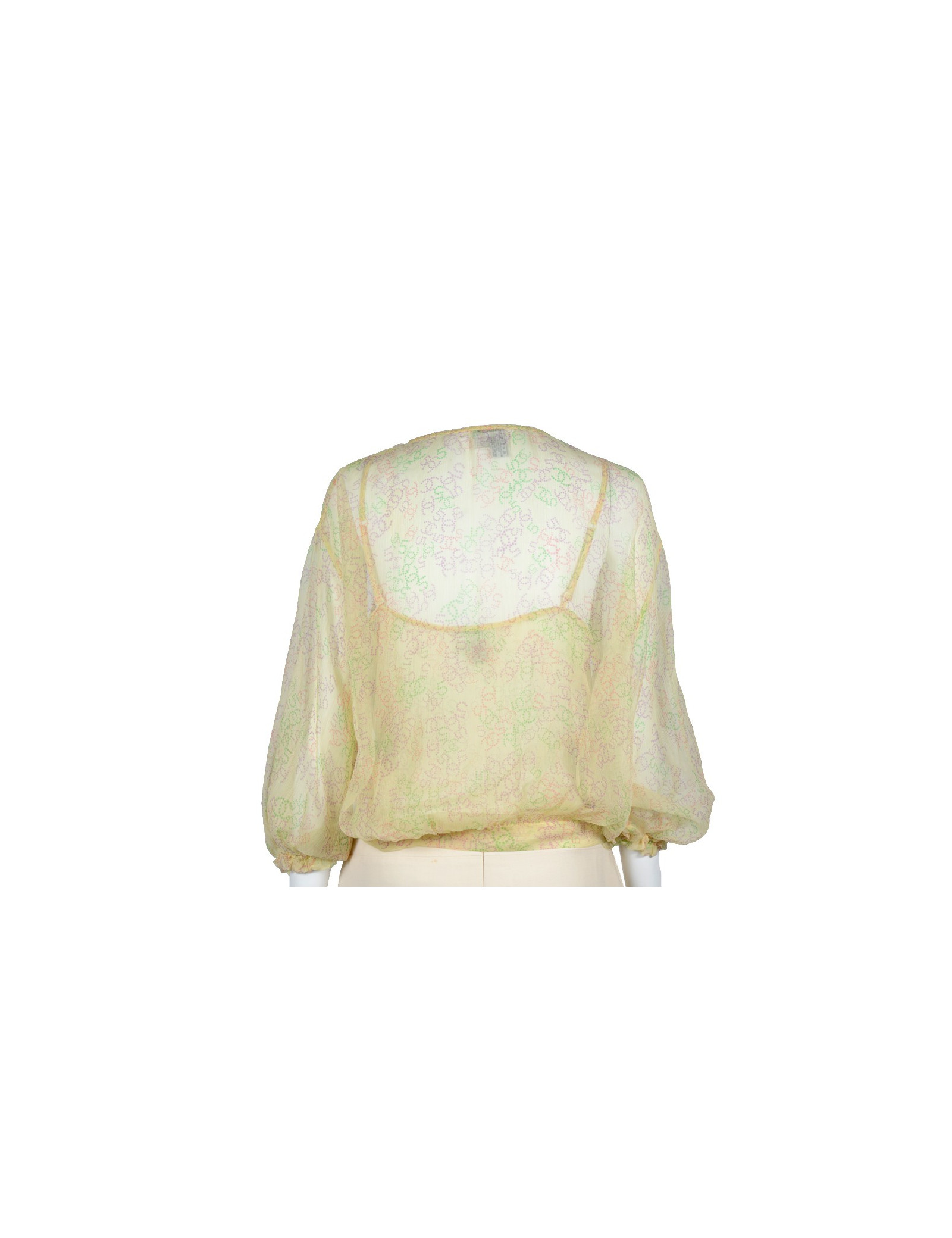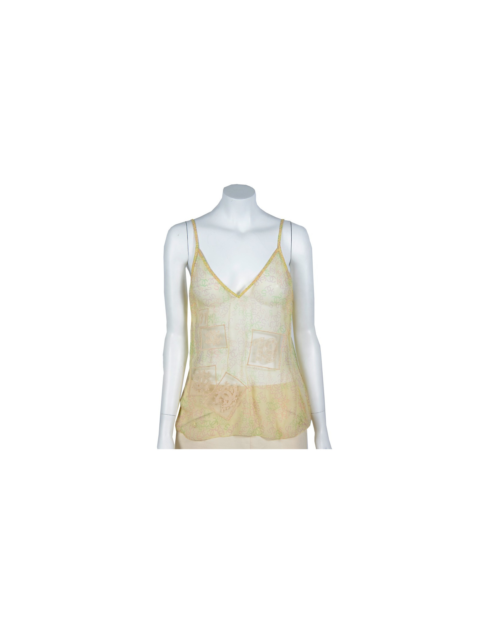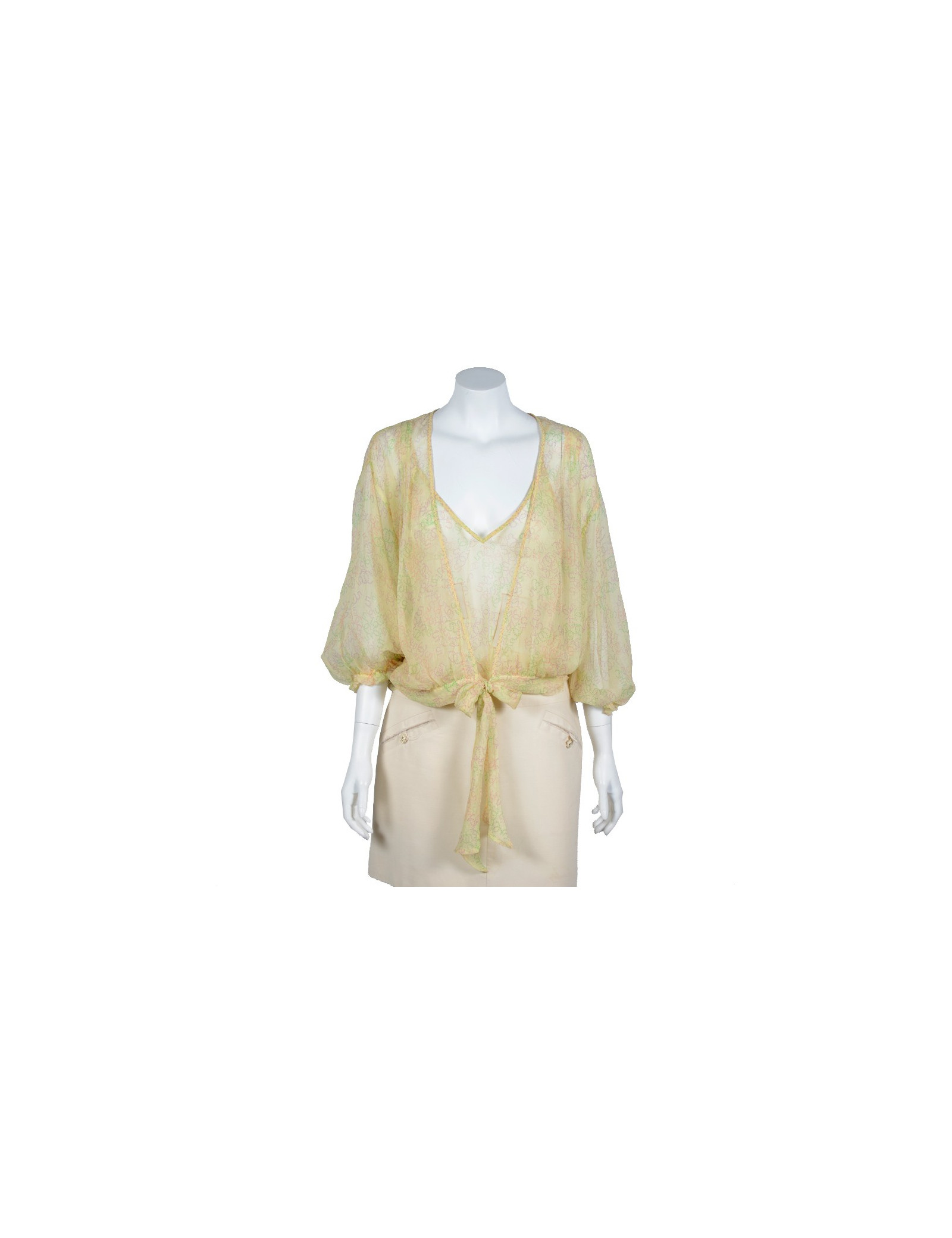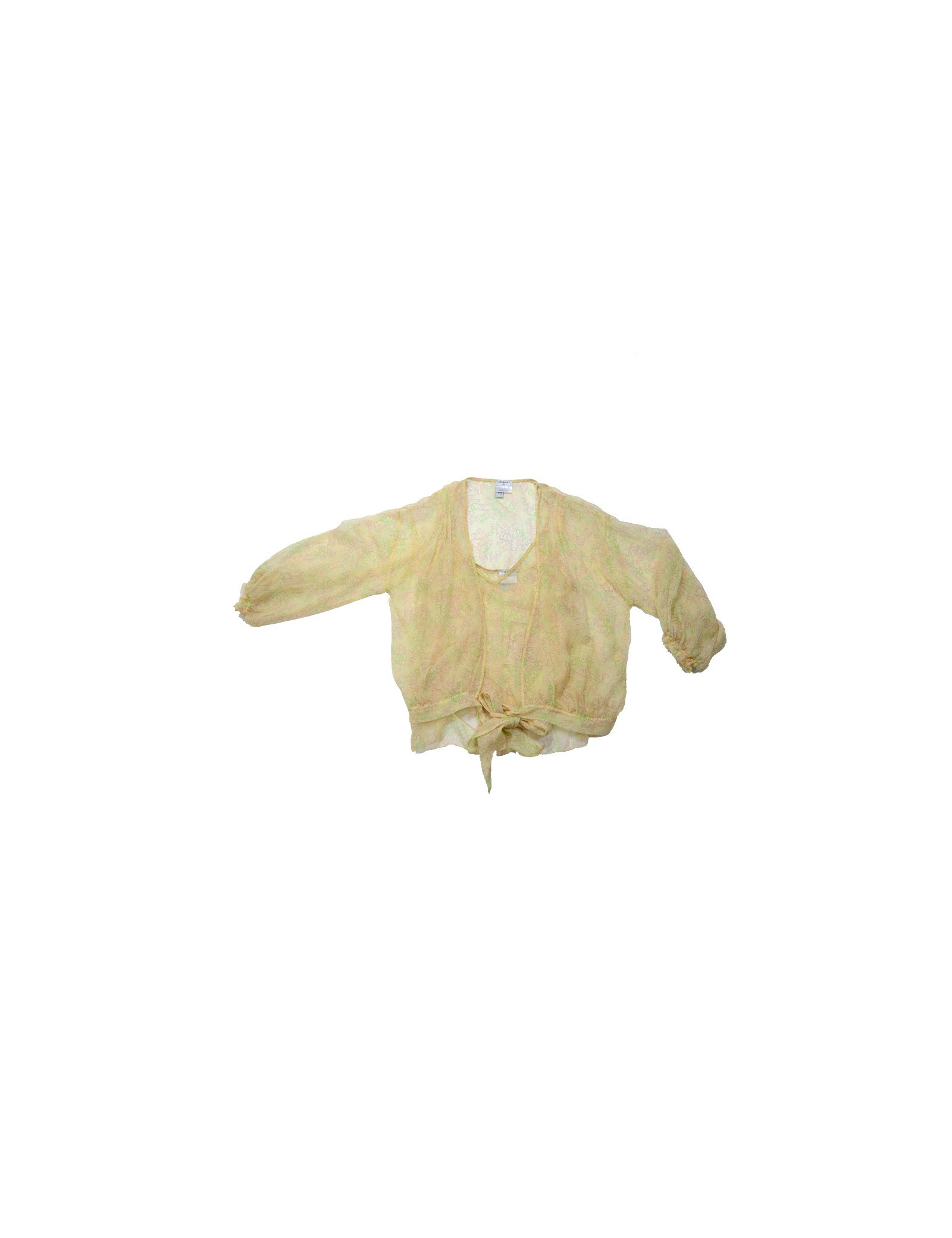 Ravissant twin set Chanel taille 42 issu du prêt-à-porter printemps 2006, en soie jaune poussin, imprimée de CC violet, vert et rose. Il est composé d'un top à bretelles, surpiqué de dentelle représentant les motifs CC, 19 et 31. Une sorte de cache-coeur manches 3/4, noué à la taille vient compléter le top. Le twin set est en très bon état.