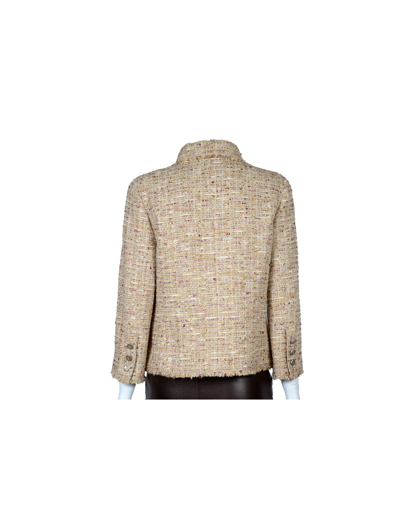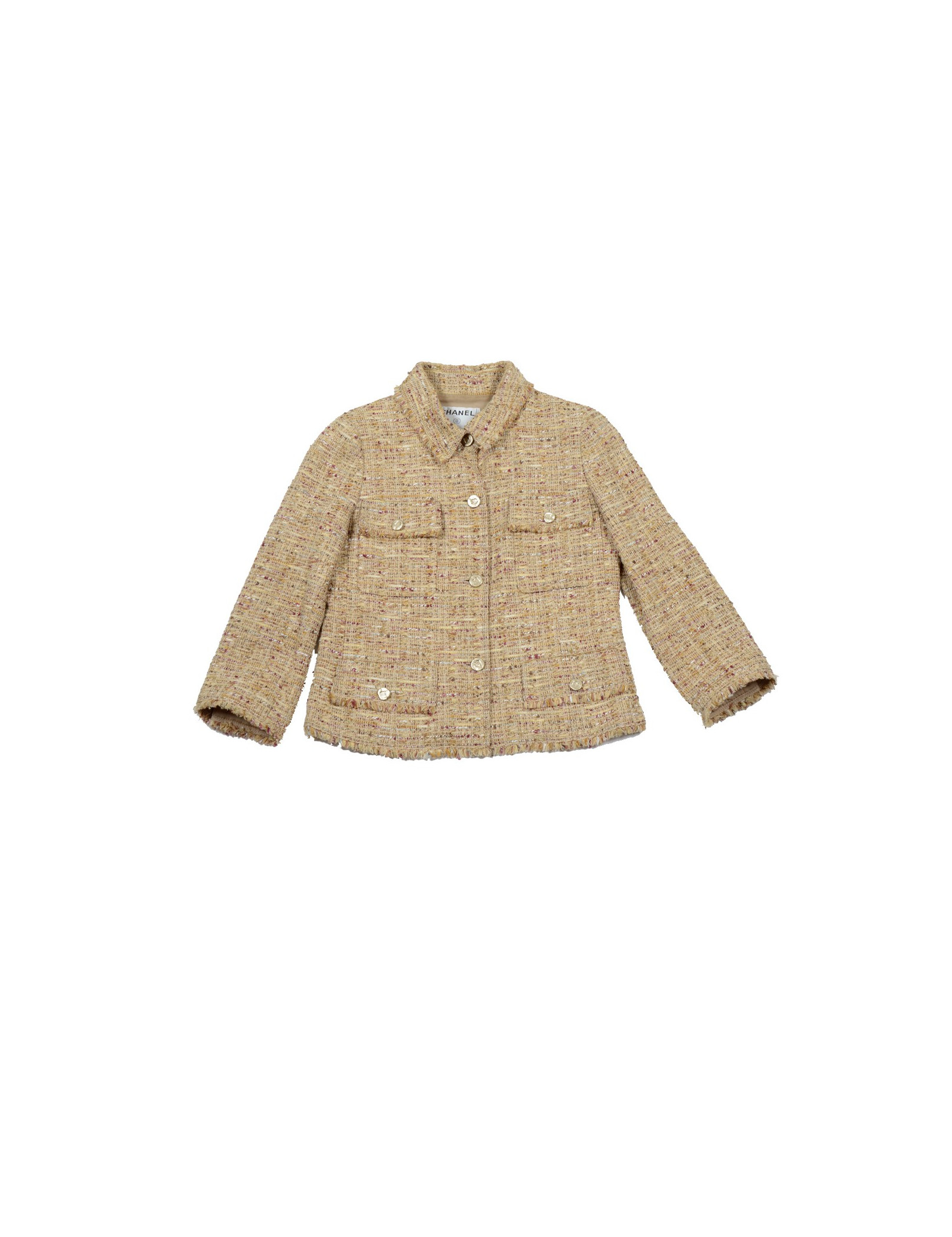 Veste Chanel en tweed de couleur ocre doré. Taille 40. Fermeture 4 boutons dorés siglés "CC". Elle dispose de 4 poches plaquées à rabat à l'avant. 3 boutons à chaque manche. La doublure est en soie avec la chaîne Chanel en bas de la veste à l'intérieur. En très bon état.